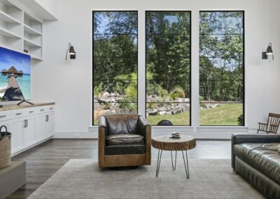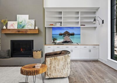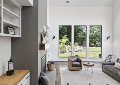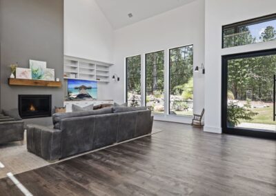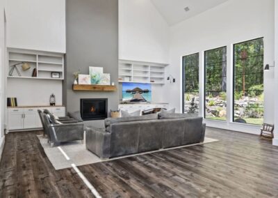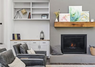 Big windows, built-in shelves, and a sleek gas fireplace with a wood mantel