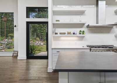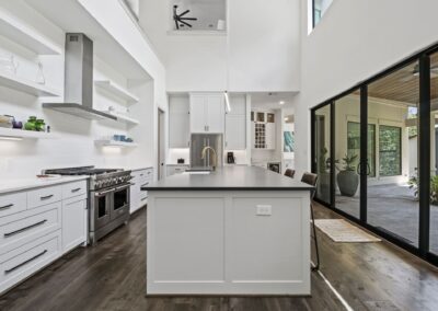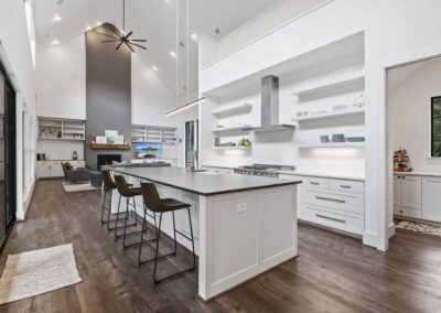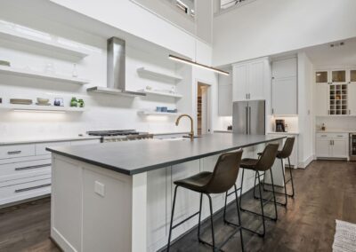Quartz counters, floating shelves, top-tier appliances, and a bold center island