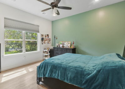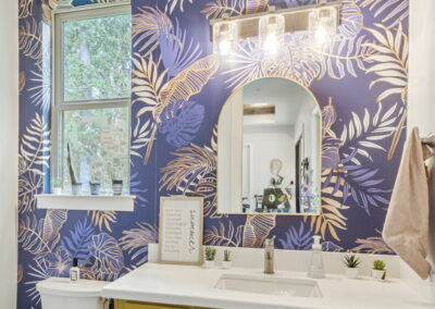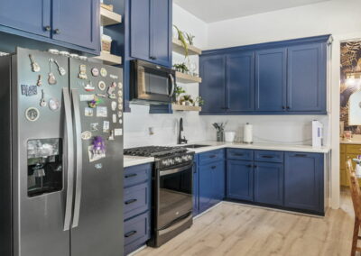 Bright cabinets and colorful accent walls in the kitchen and bathrooms