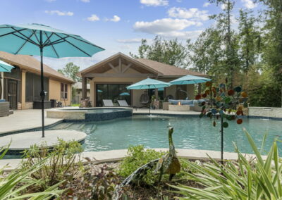 We created a resort-style backyard with a large pool, tanning ledge, and a smooth spa spillway. Waterfalls bring soothing sounds, and the pergola-covered outdoor kitchen includes a grill, pizza oven, and drink station. Bright cabinets and bold colors flow from the indoor pool house to the outdoor area for a fun, coordinated look.