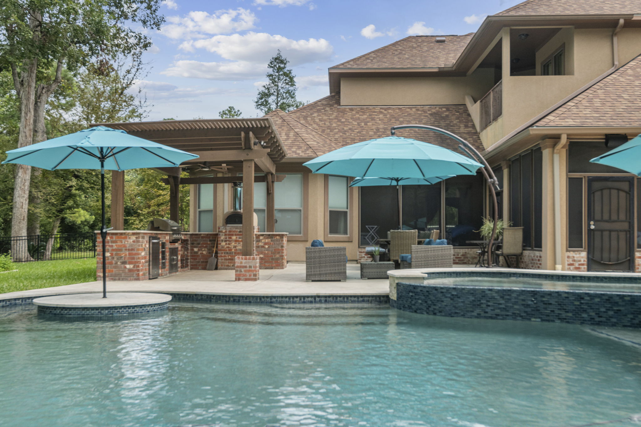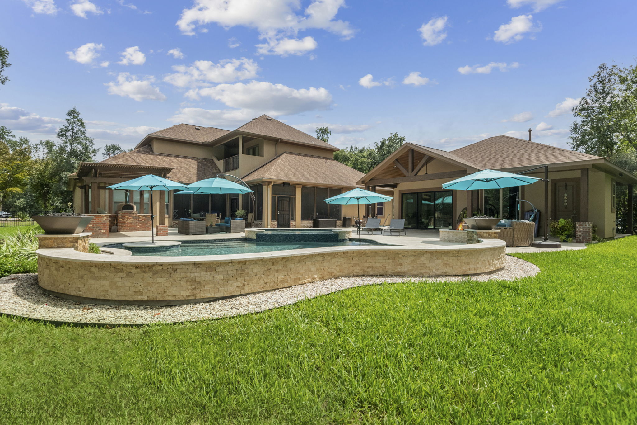 Freeform Pool, Outdoor Kitchen, and Pool House in Benders Landing Estates of Spring, Texas