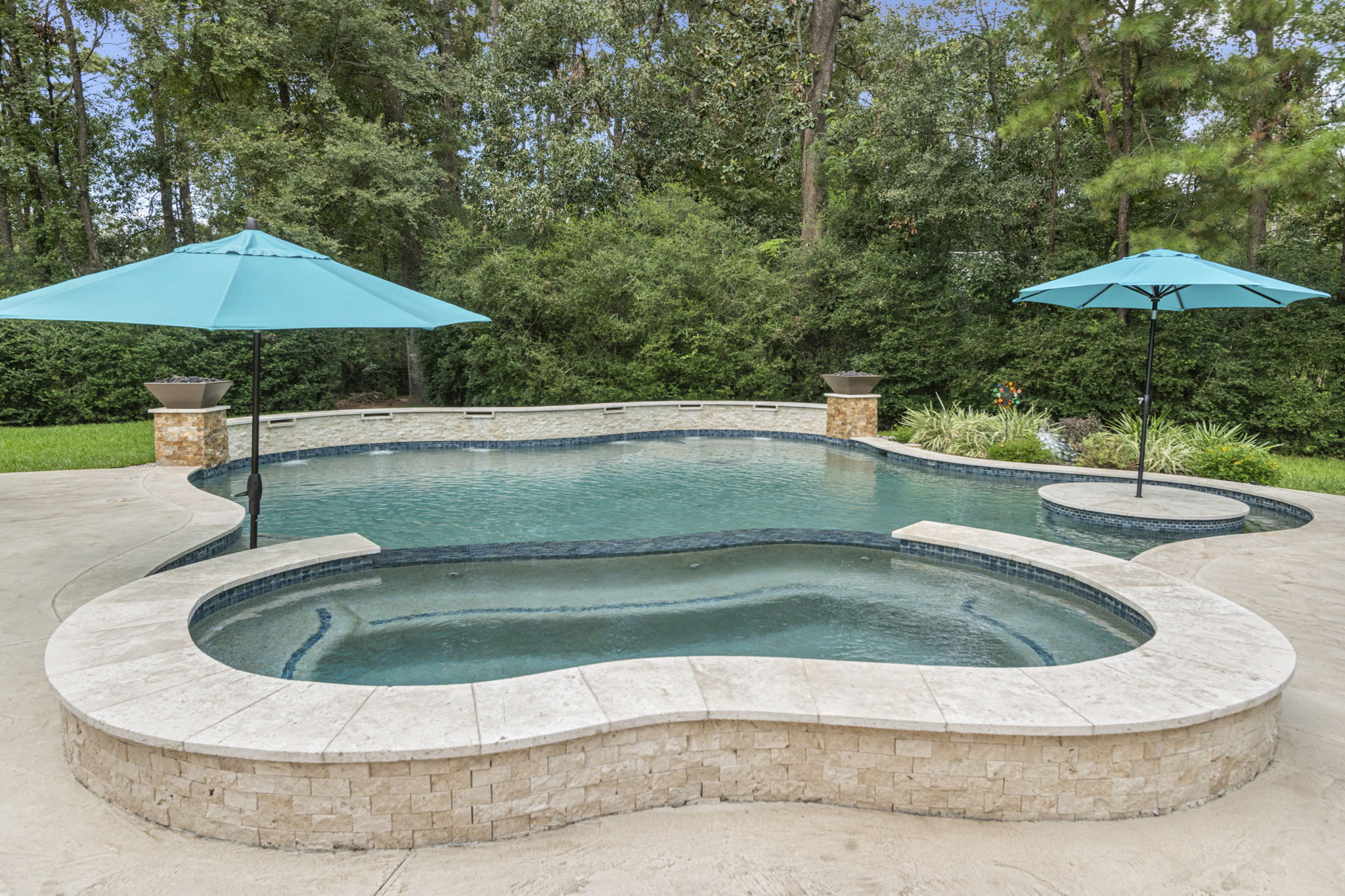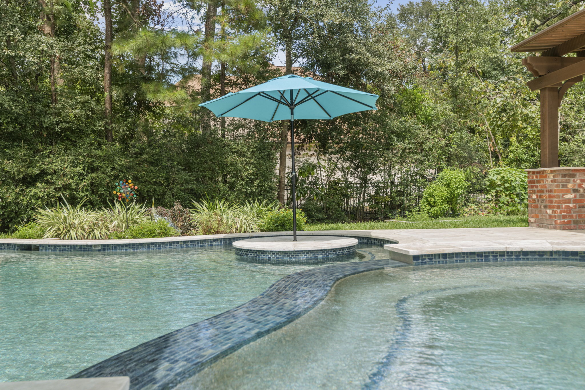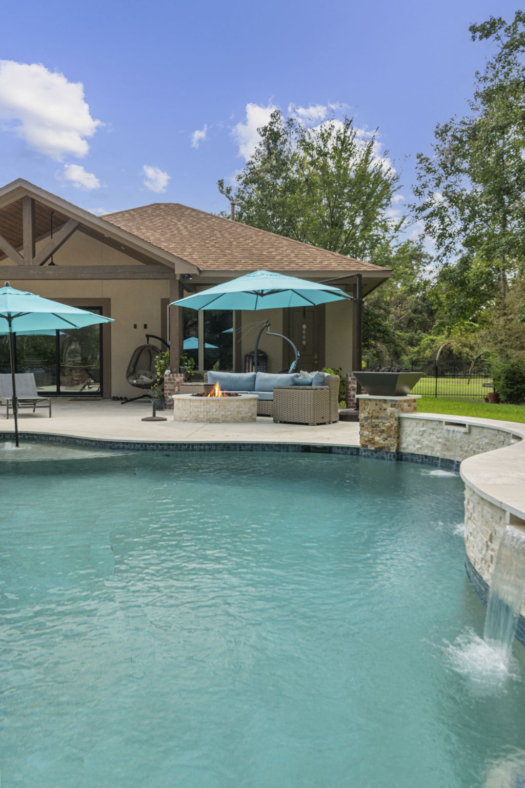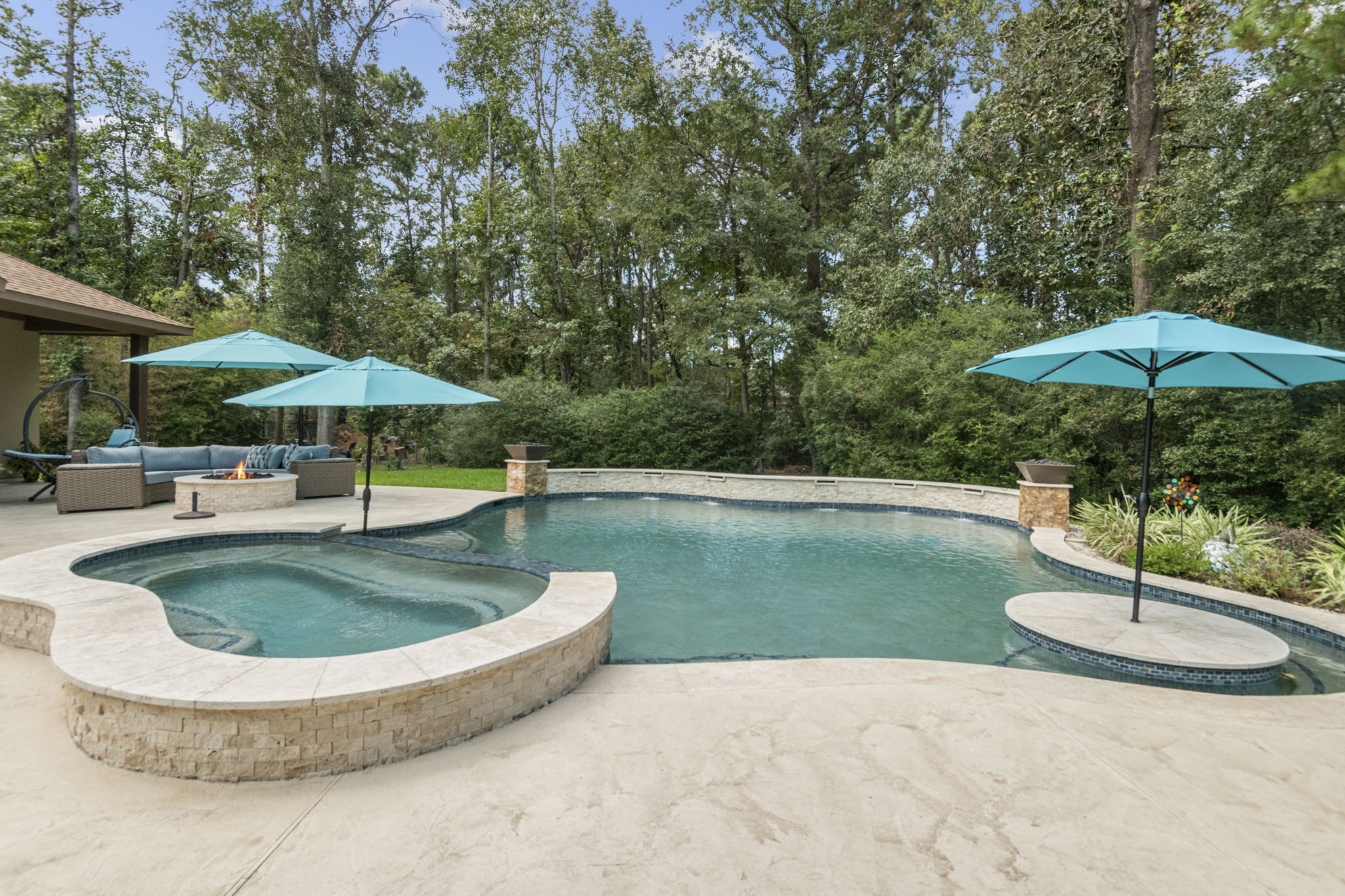 Tanning ledge, built-in spa, smooth waterfall features, and spots for umbrellas