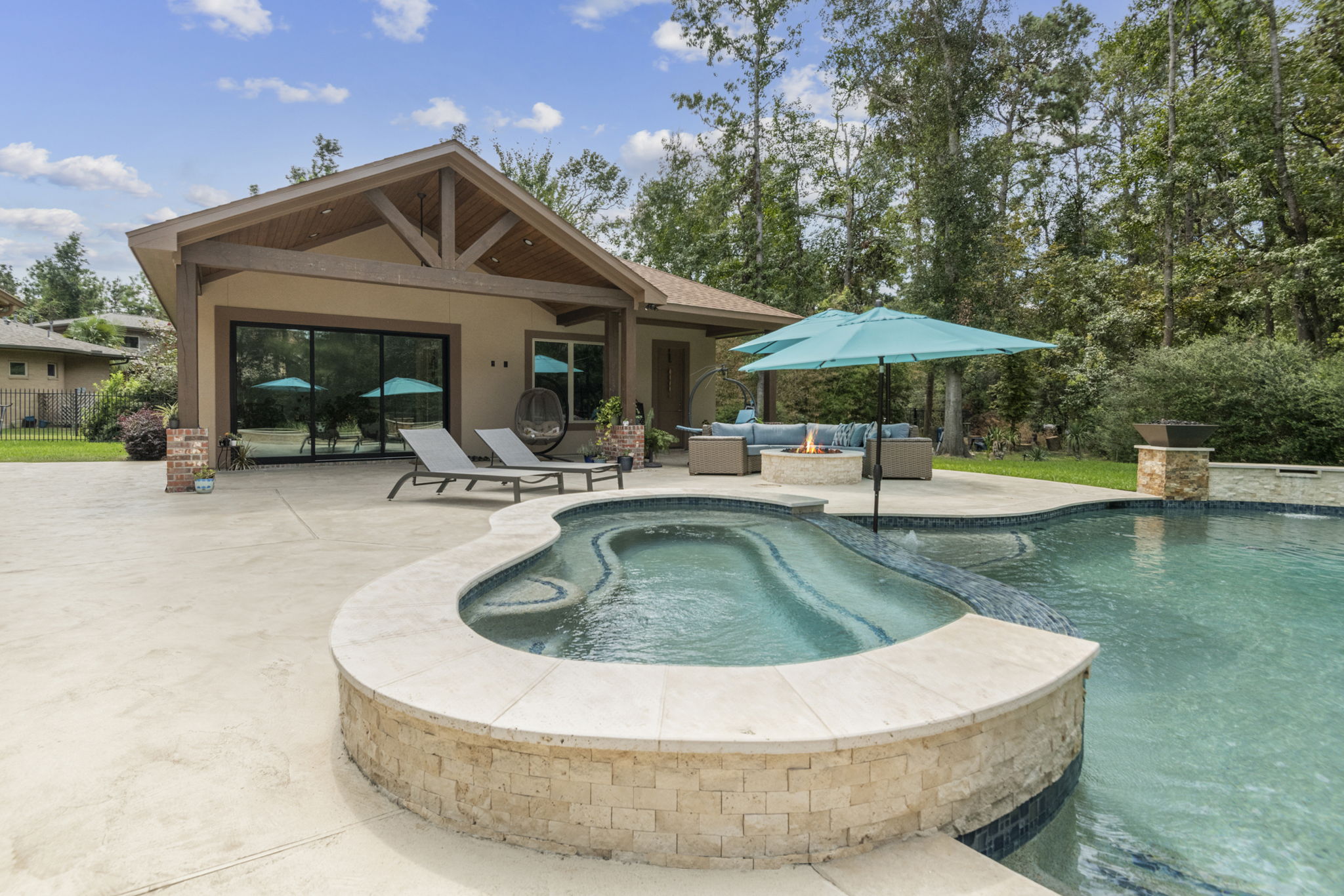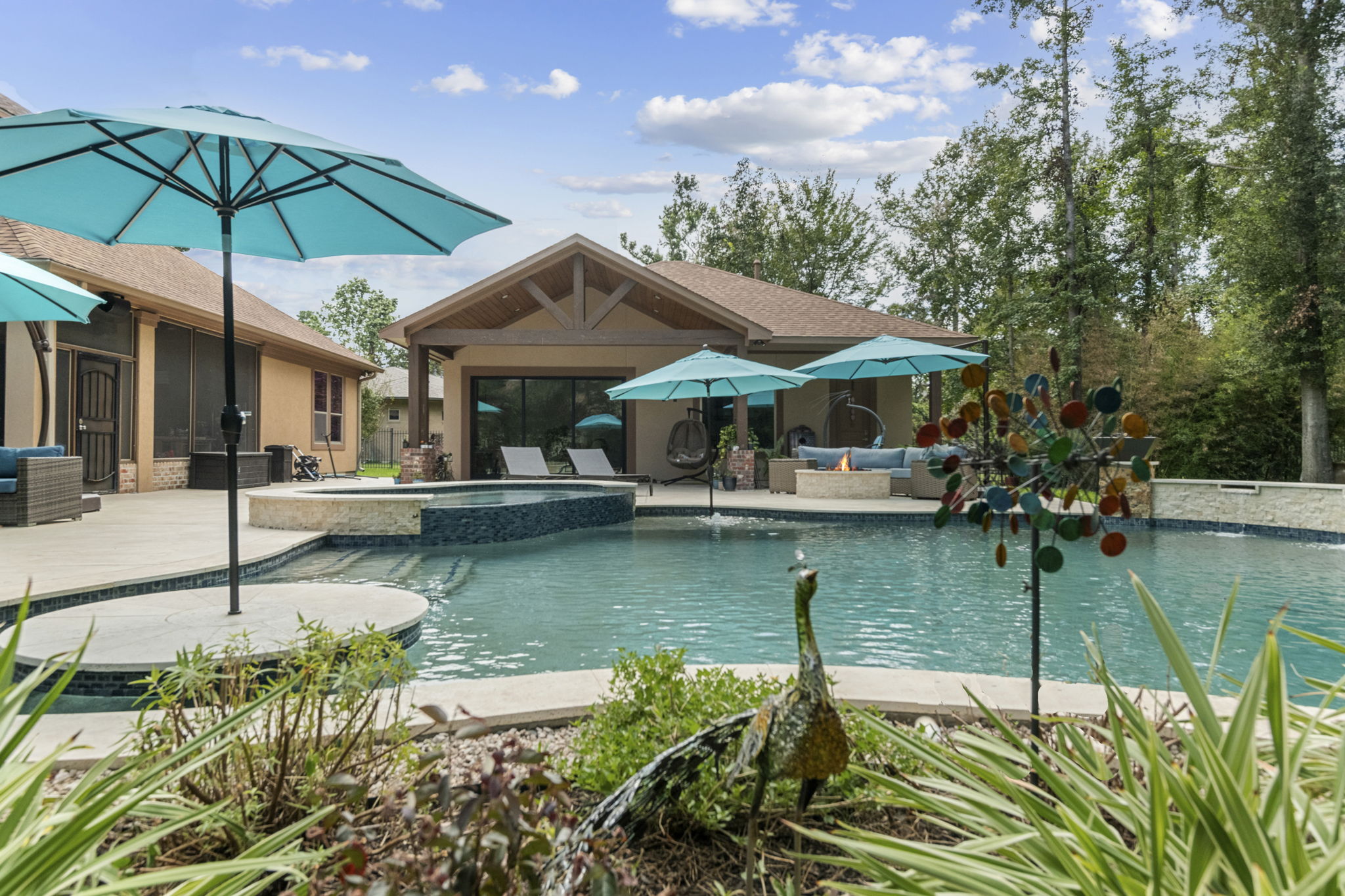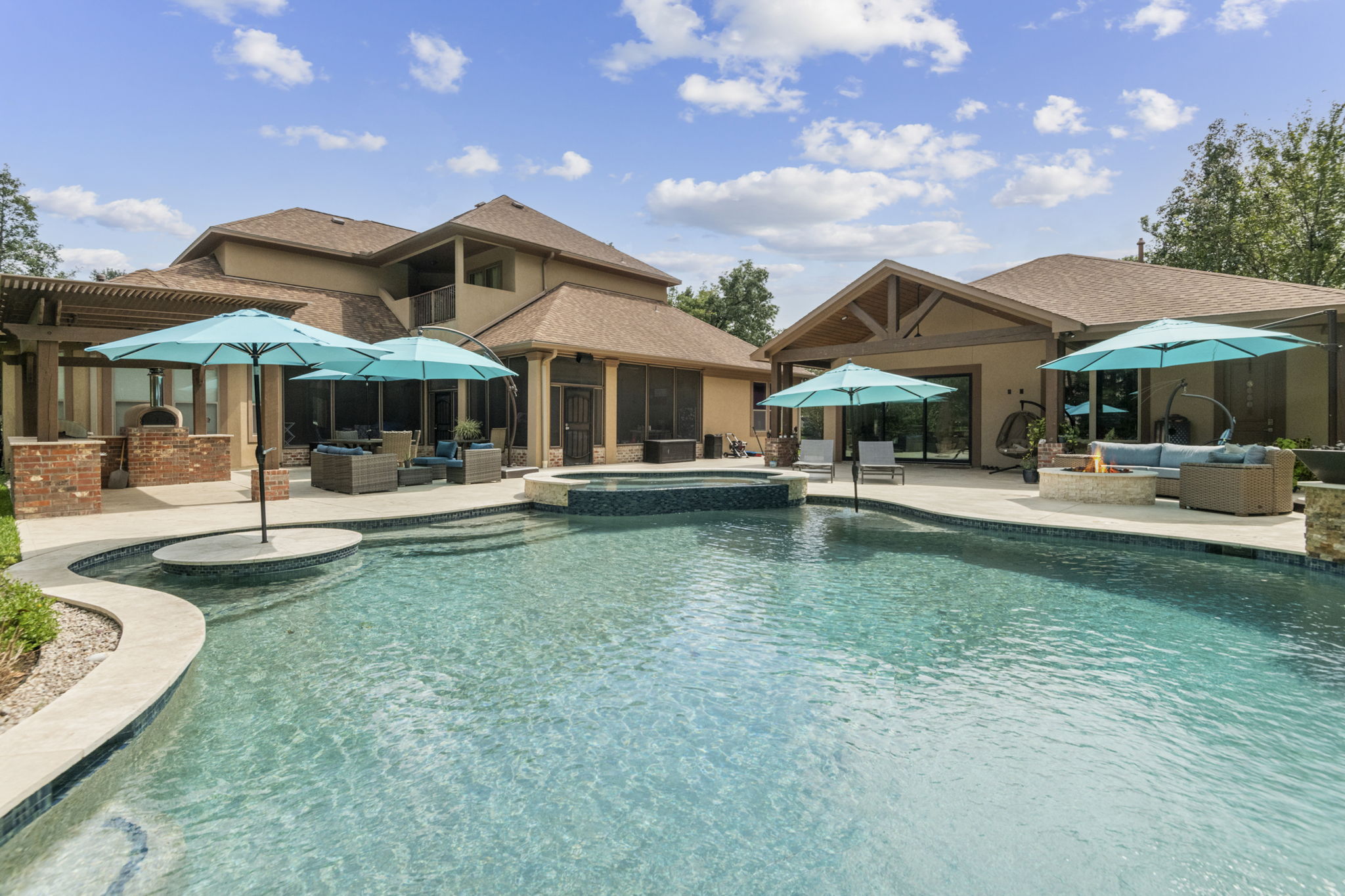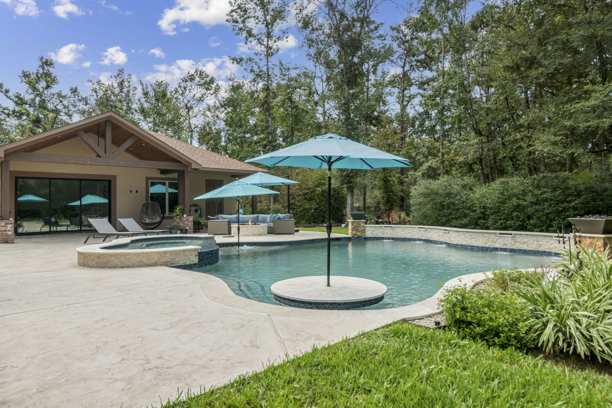 Tanning ledge, built-in spa, smooth waterfall features, and spots for umbrellas