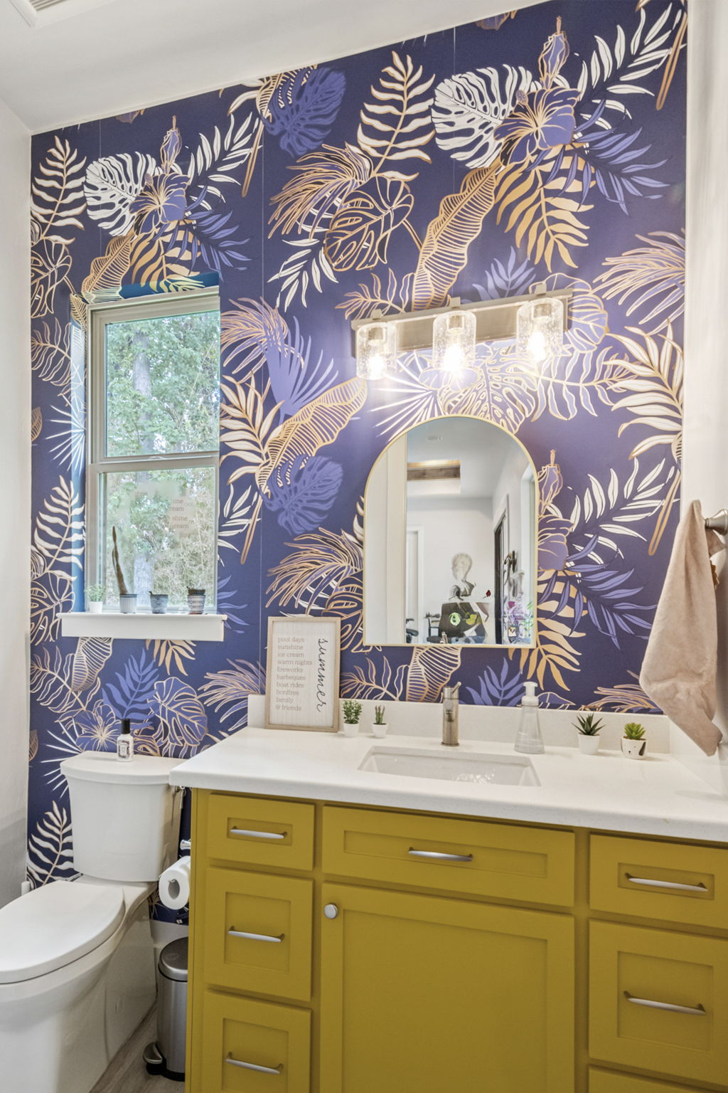 Bright cabinets and colorful accent walls in the kitchen and bathrooms