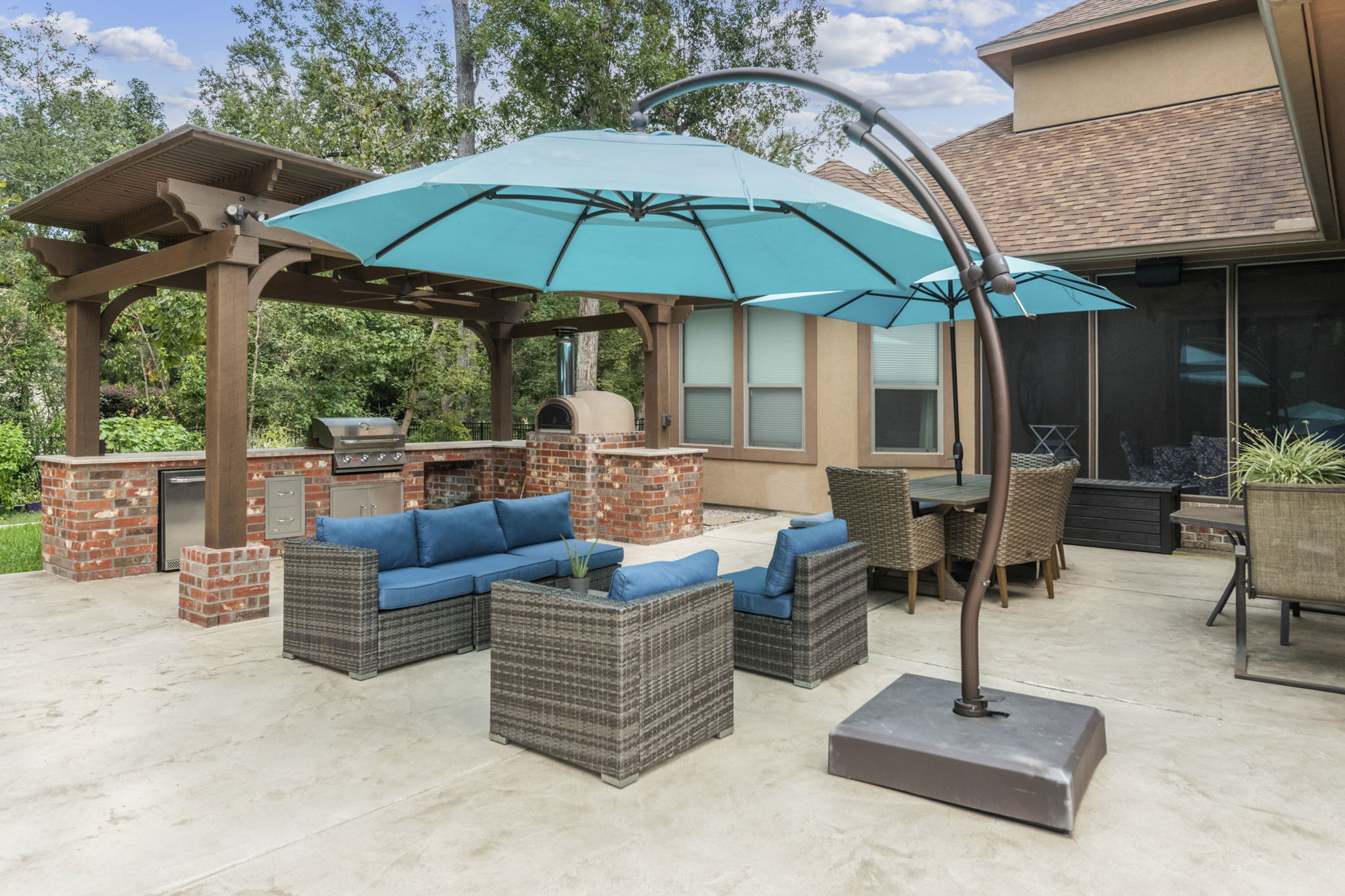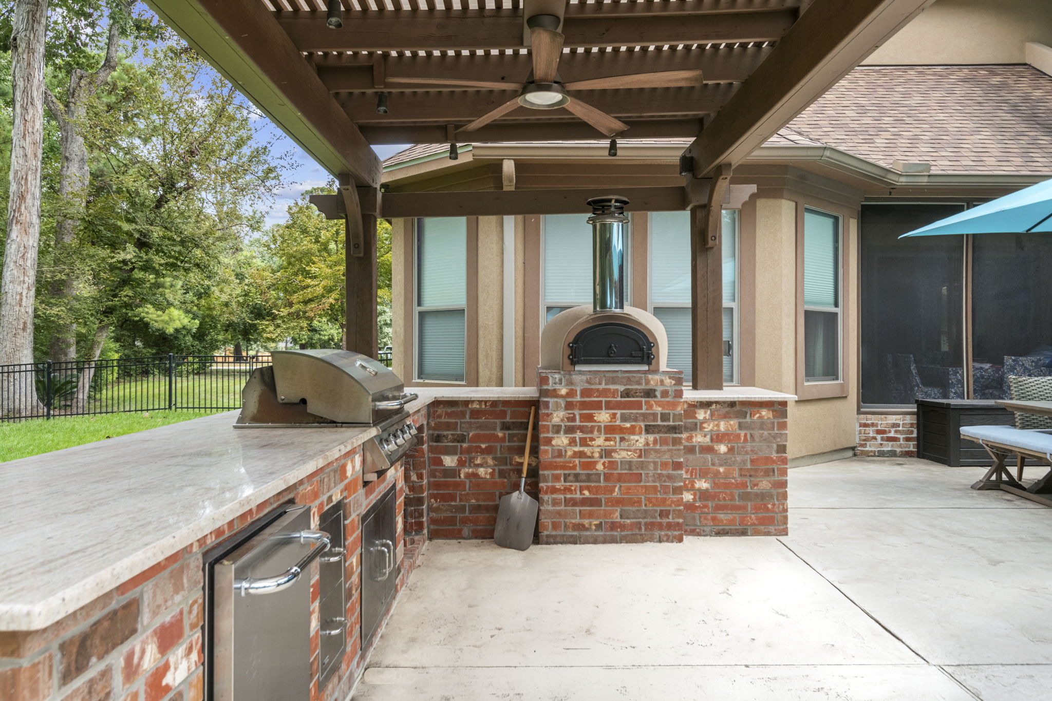 Grill, pizza oven, and drink station all set up under a pergola