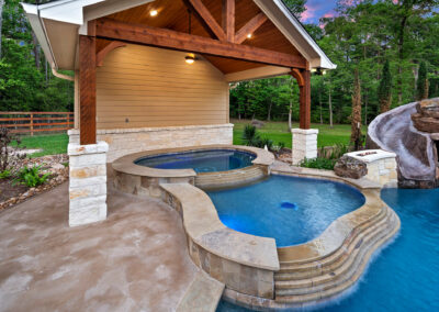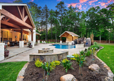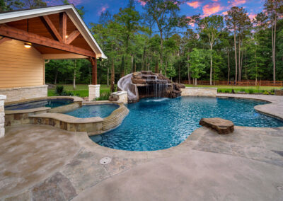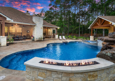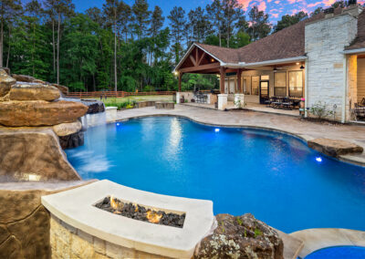 We built this resort-style backyard with a freeform pool, natural stone features, and a multi-level waterfall with a slide. The raised spa sits under a timber pavilion for shade. Fire features include a long fire wall and a round fire pit with wraparound seating. The large textured deck brings the whole space together for relaxing or entertaining.