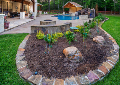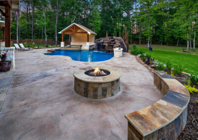 Long fire wall by the pool and a round stone fire pit with wraparound seating