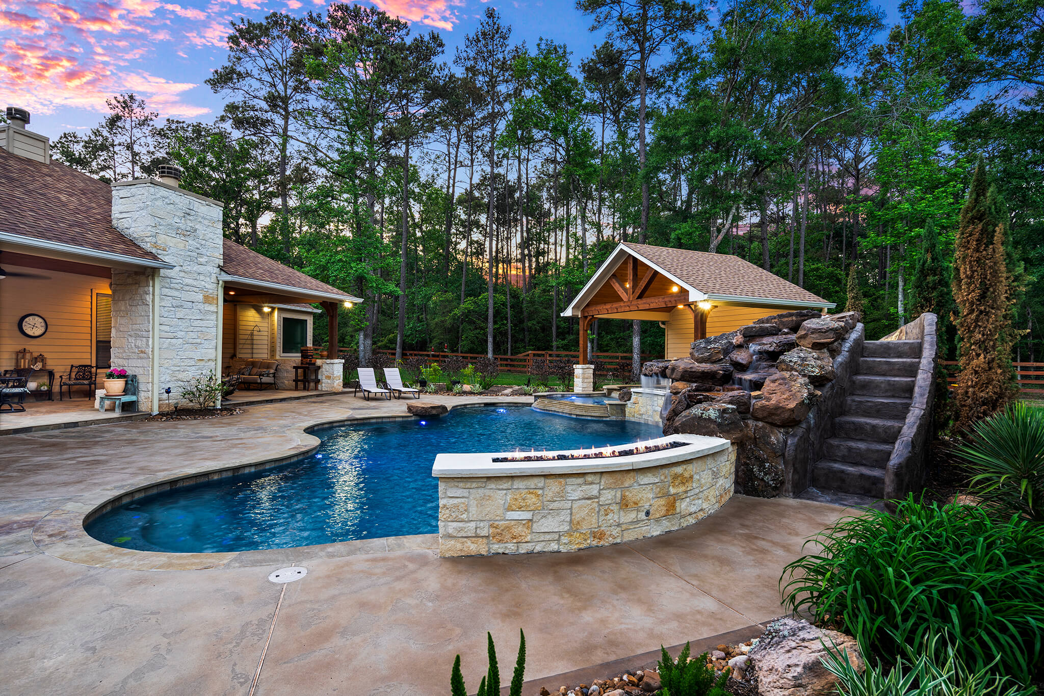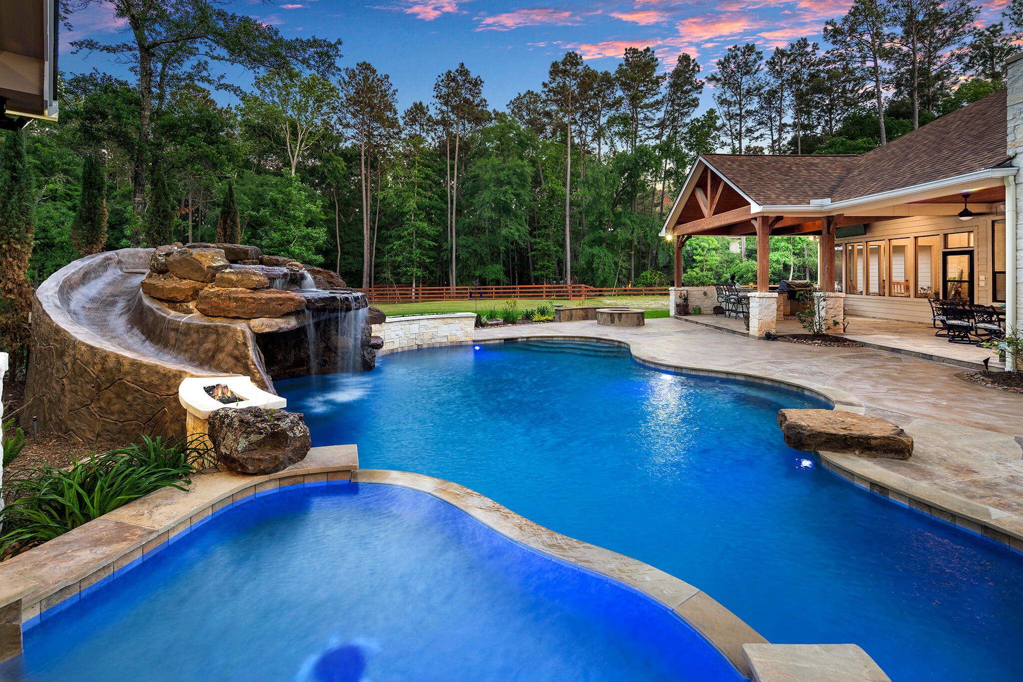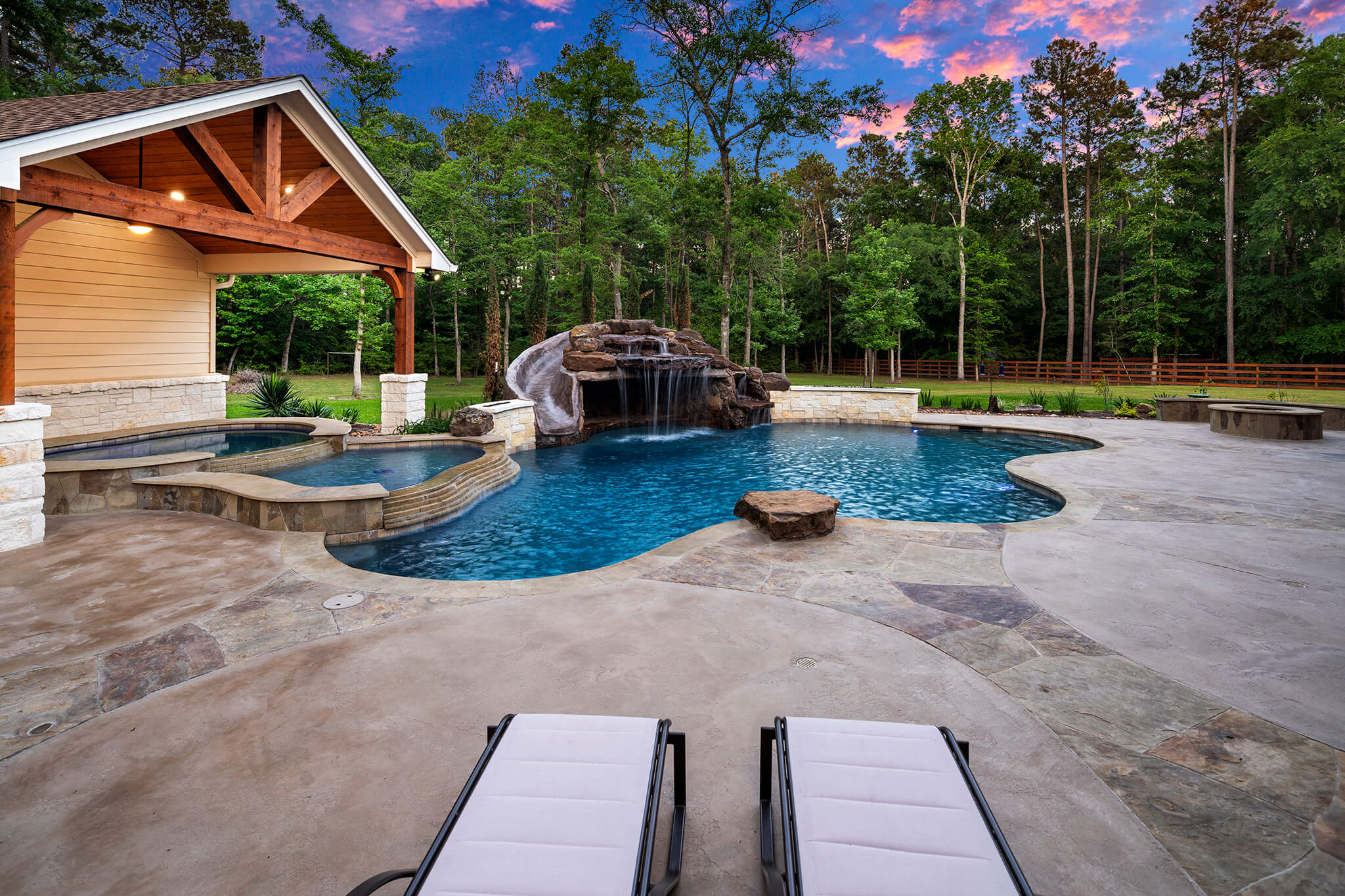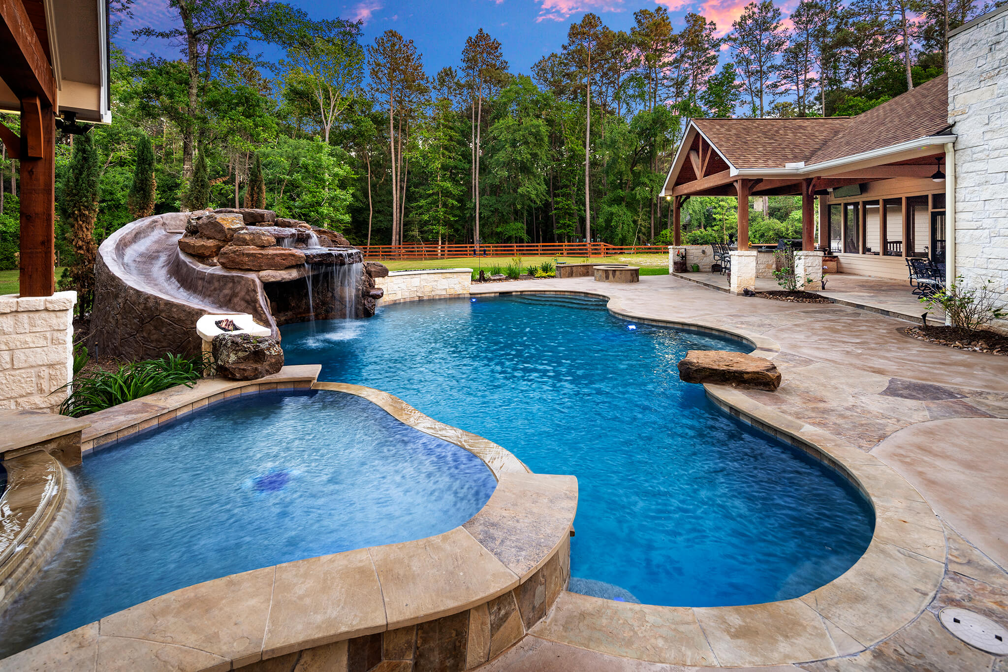 Freeform Pool, Slide, and Grotto in Lake Windcrest of Tomball, Texas
