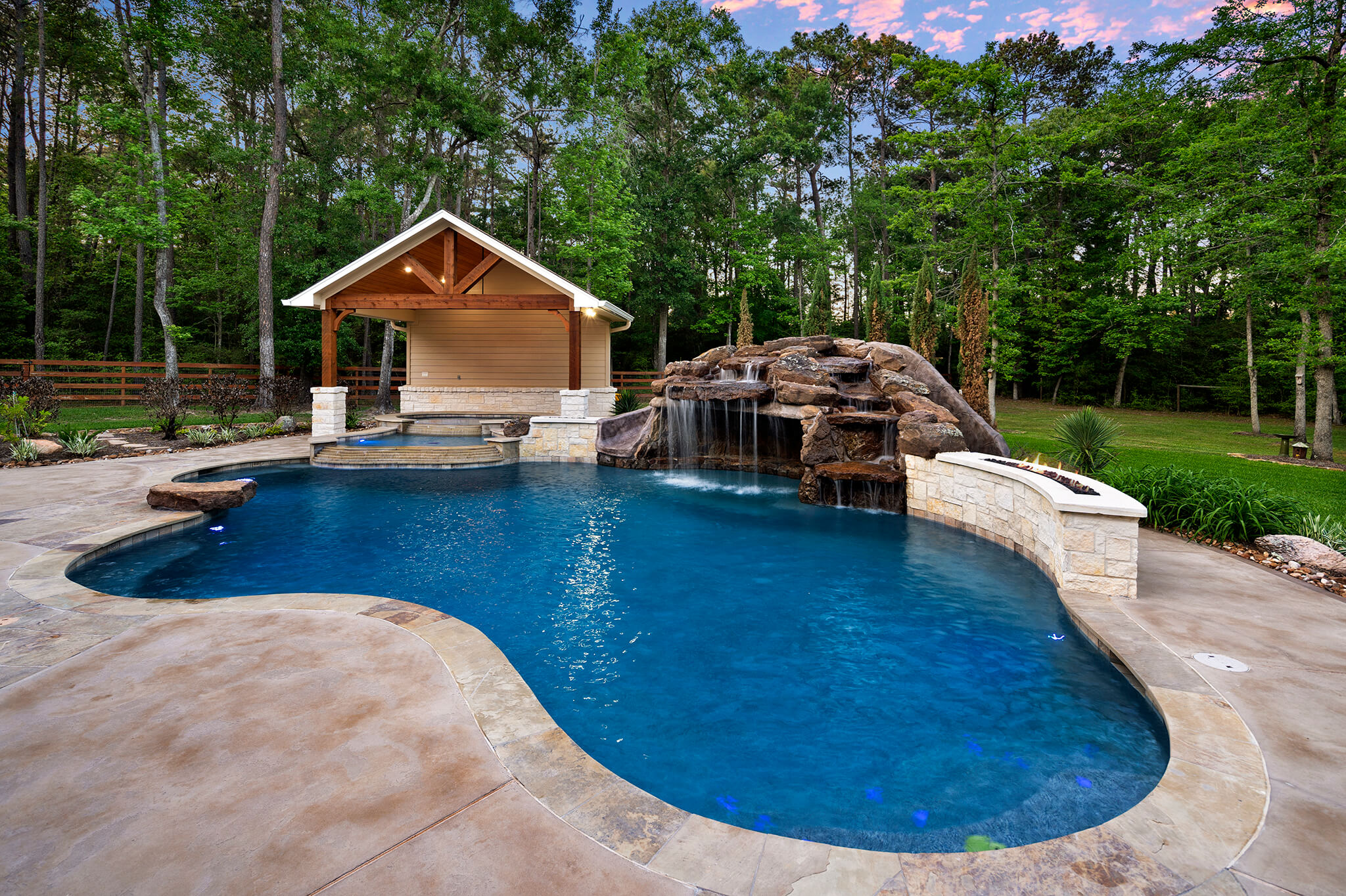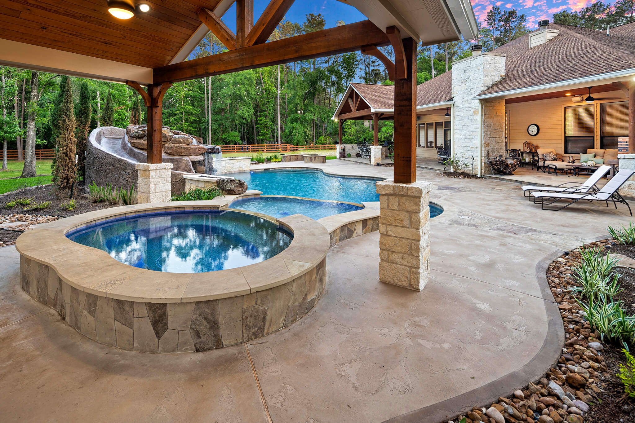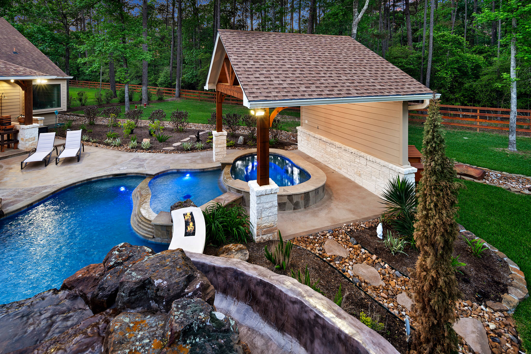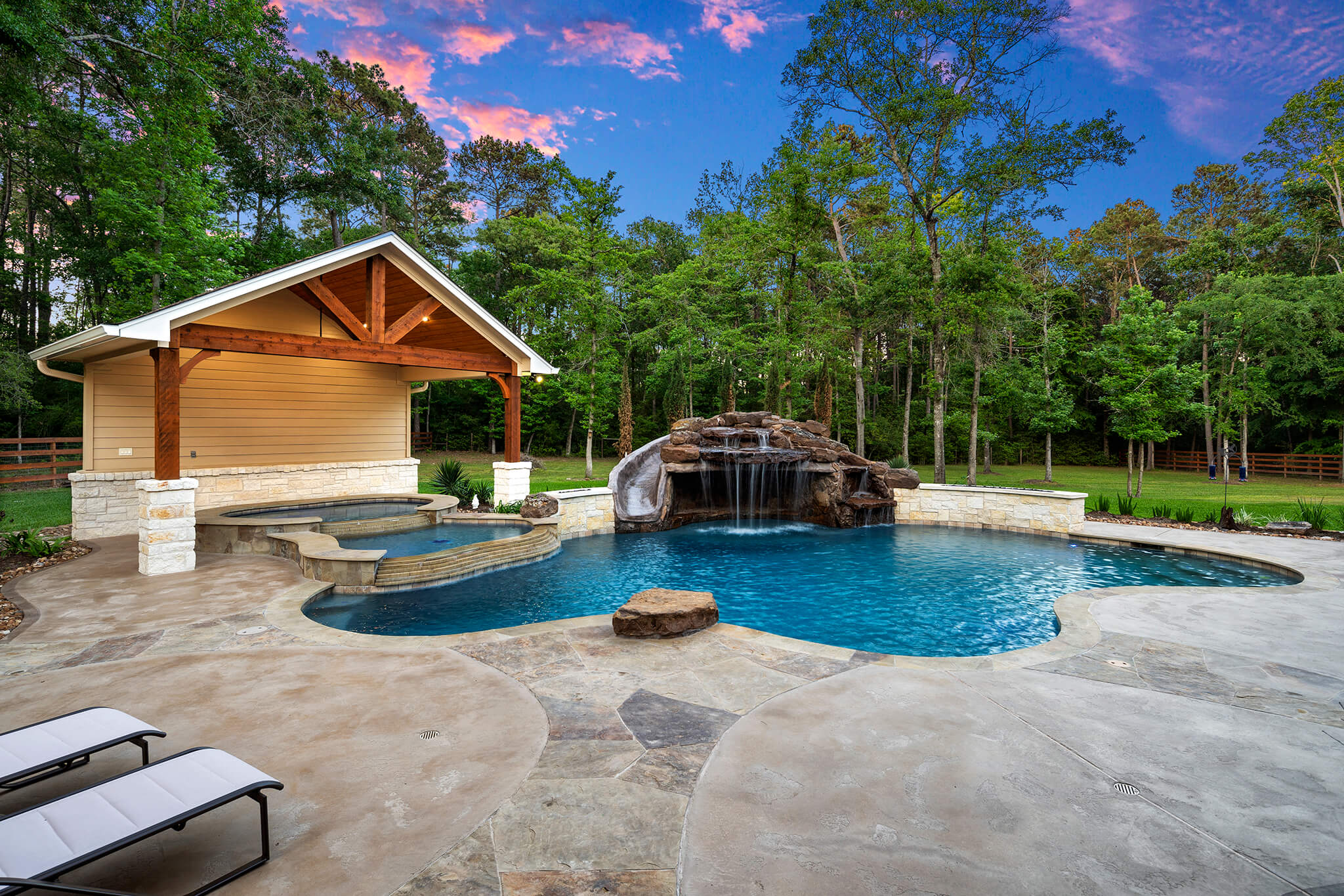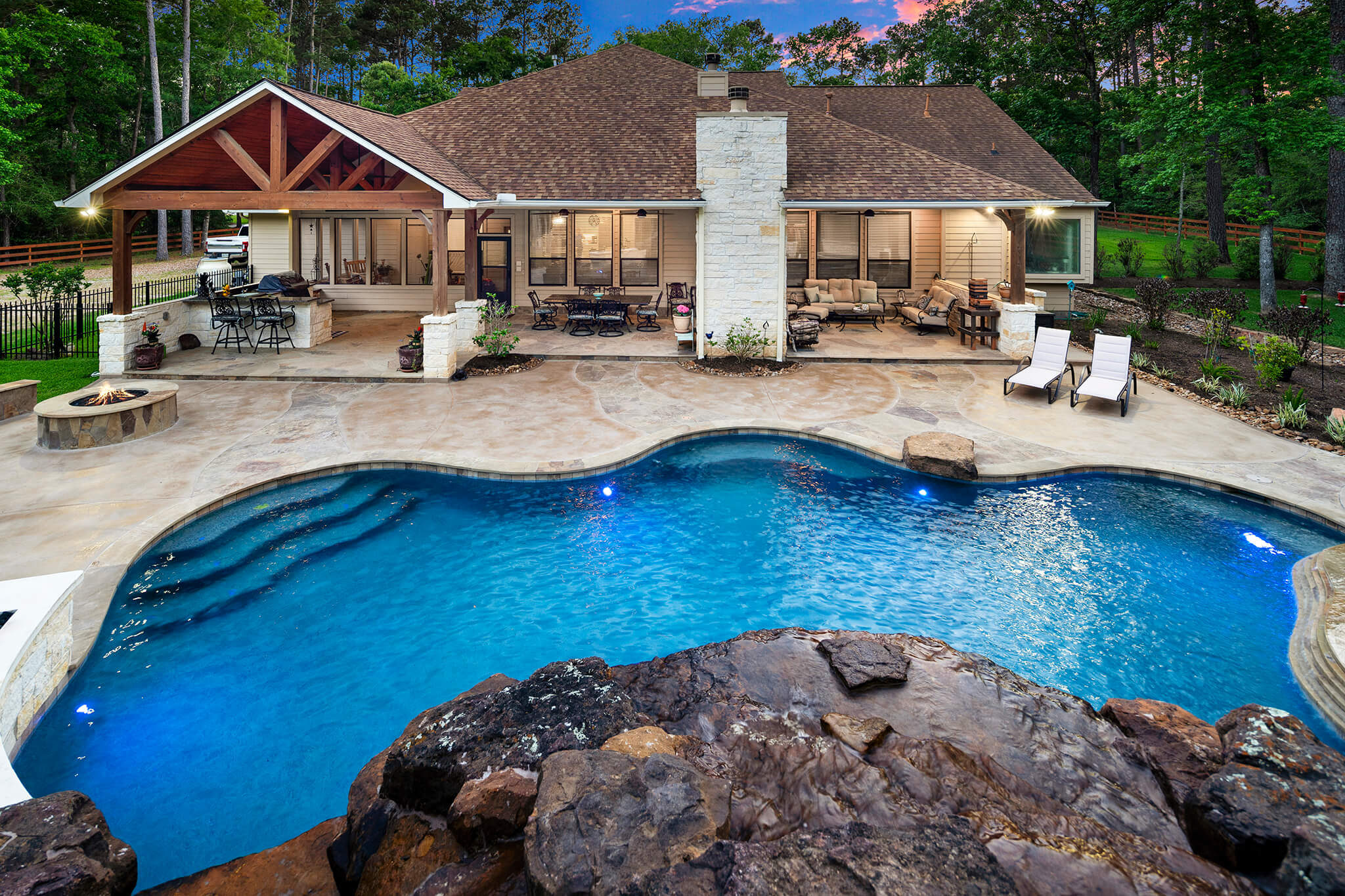 Freeform Pool, Slide, and Grotto in Lake Windcrest of Tomball, Texas