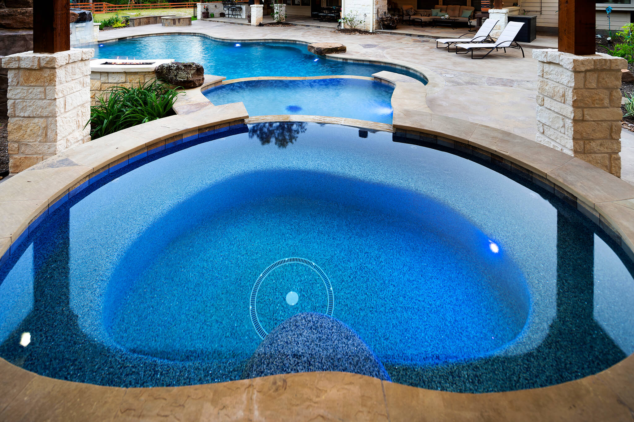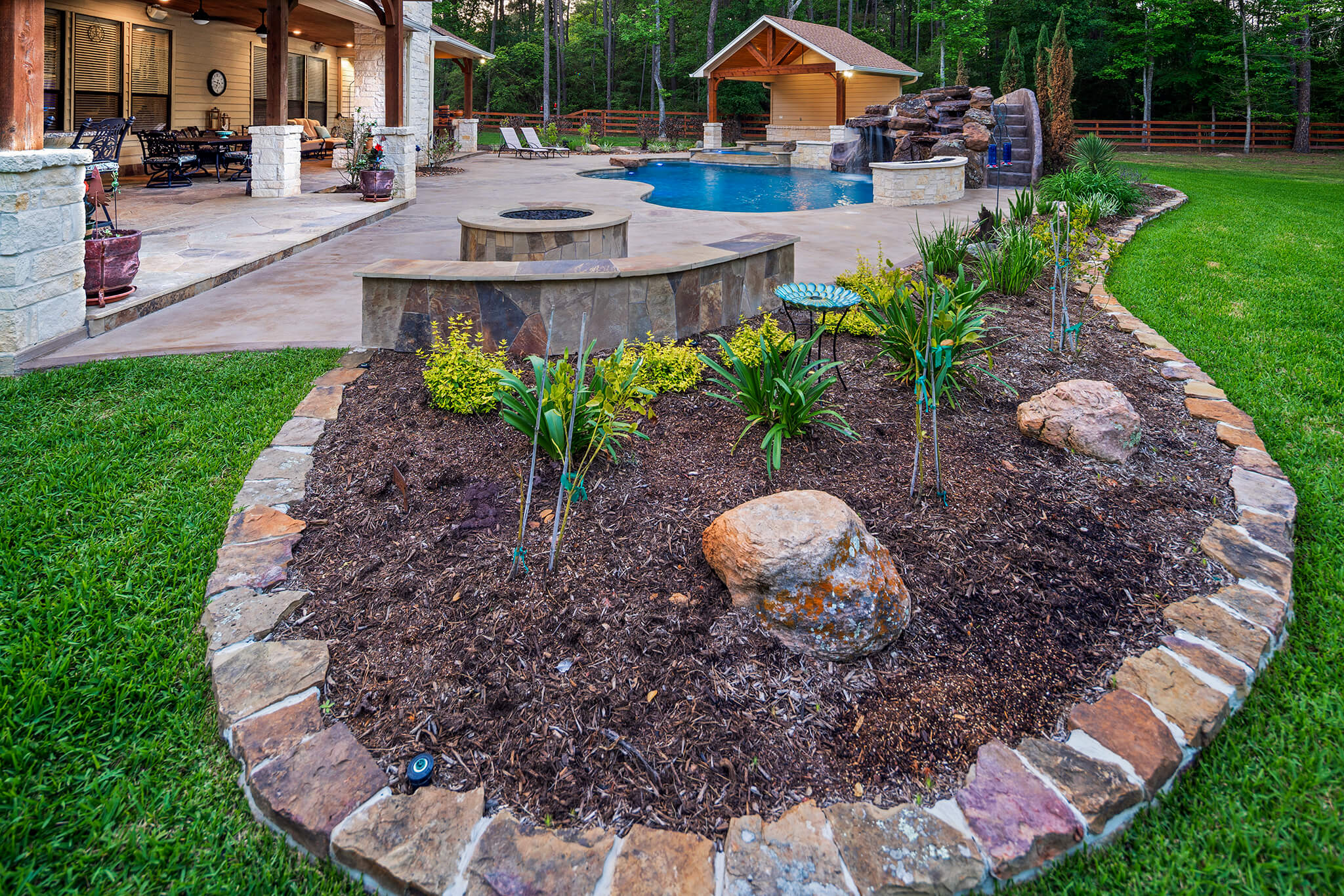 Long fire wall by the pool and a round stone fire pit with wraparound seating