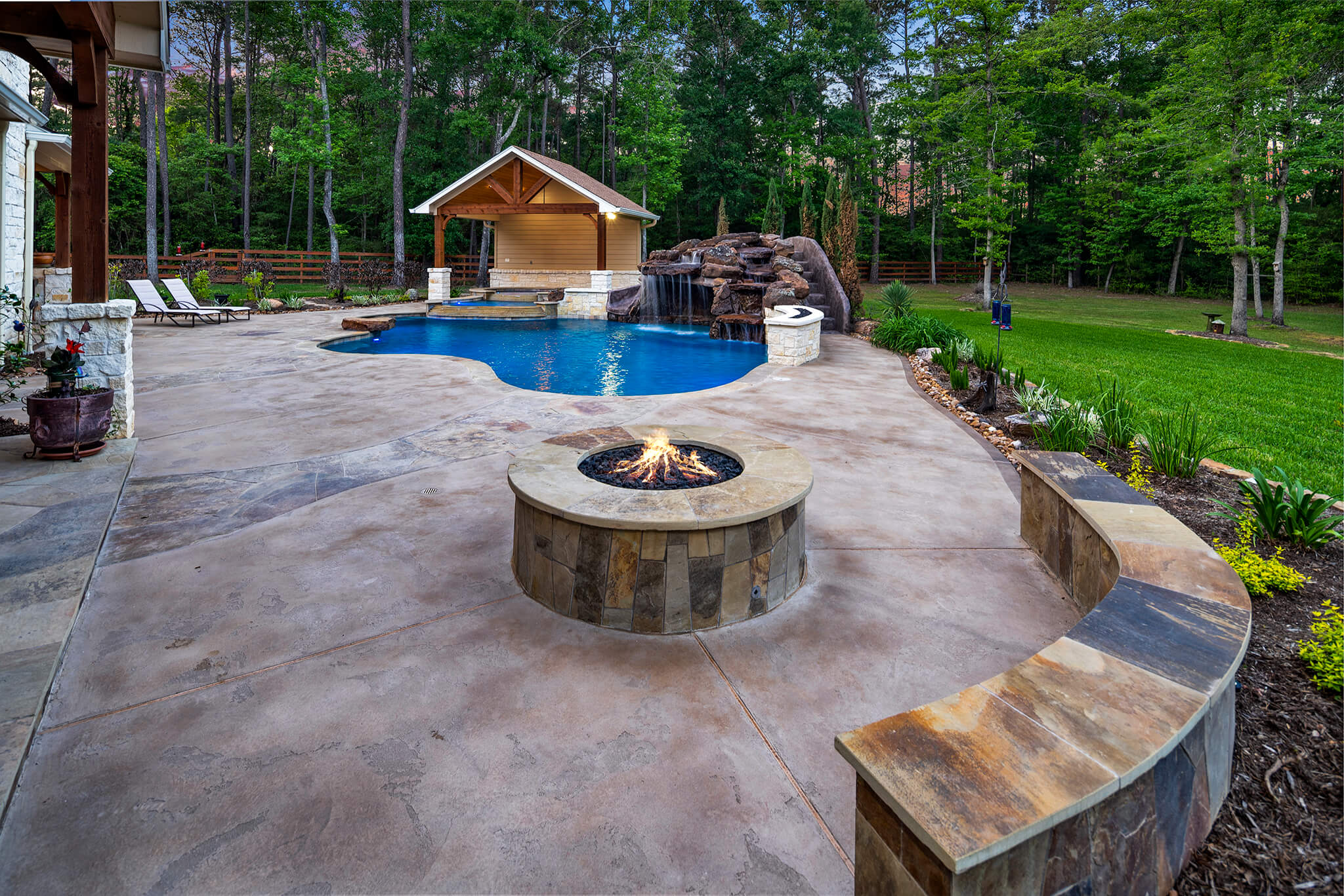 Textured concrete with stylish inlays and borders for lounging and dining areas