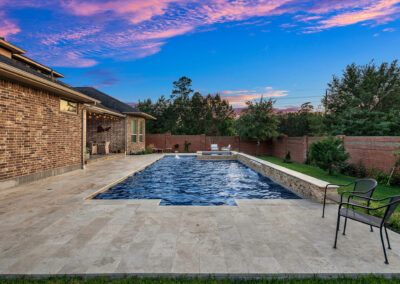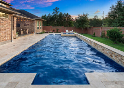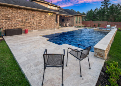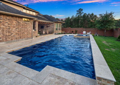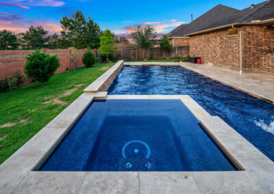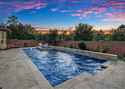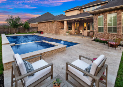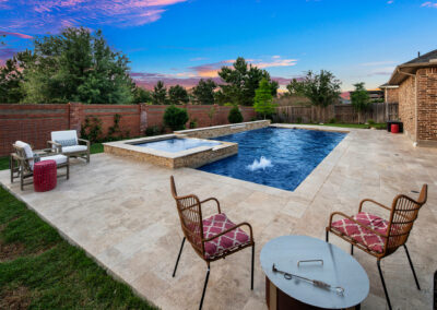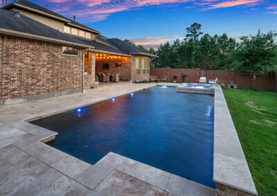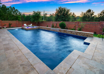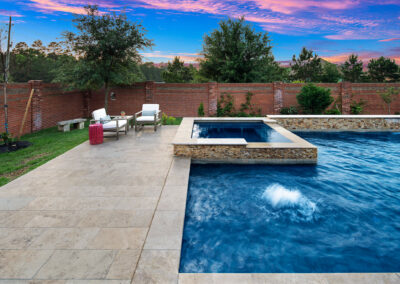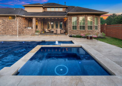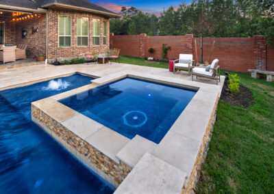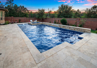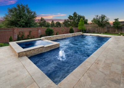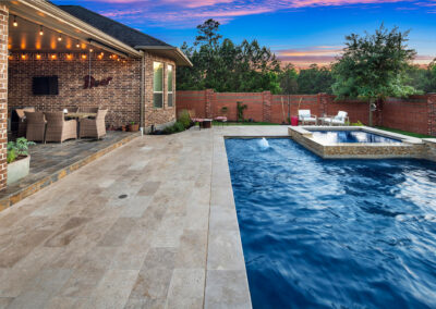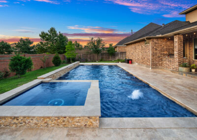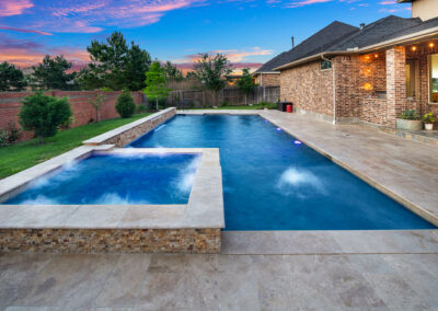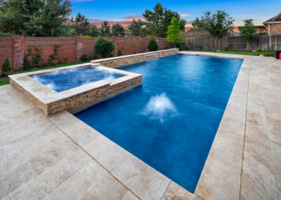 We built this large rectangular pool with a deep blue finish and a matching raised spa. The back wall includes smooth waterfall spillways and a center jet fountain for added movement. Travertine pavers complete the classic and polished look, making the space perfect for relaxing or hosting friends.