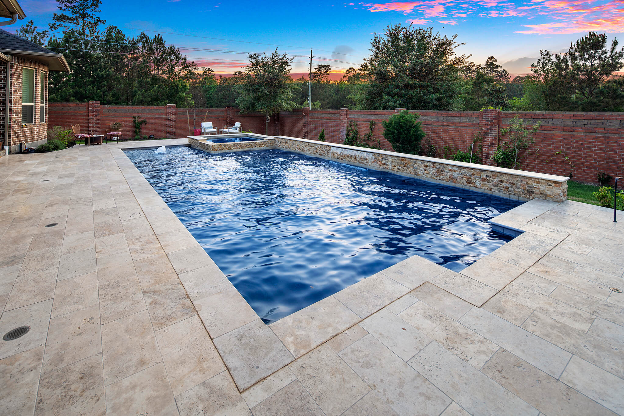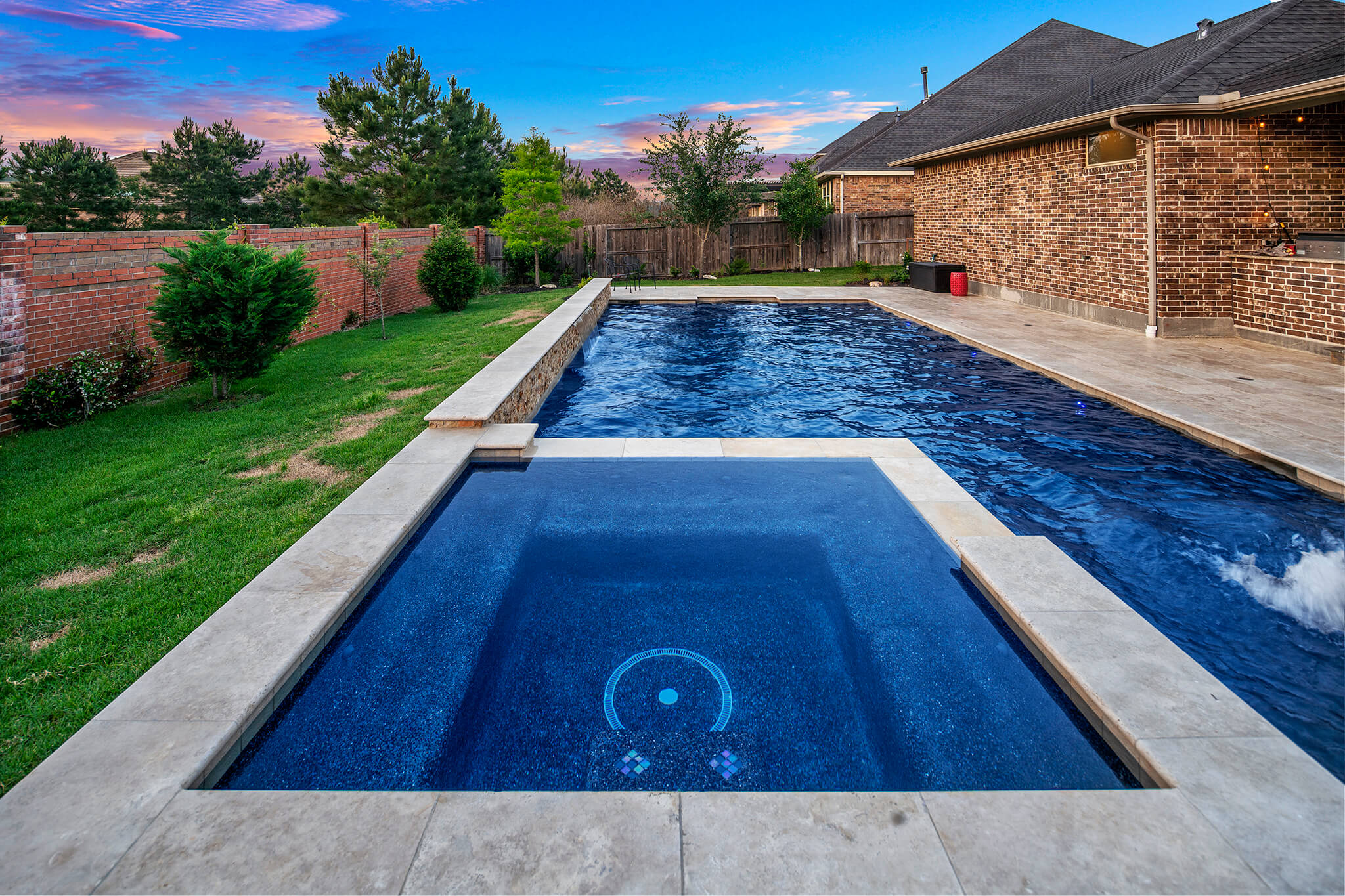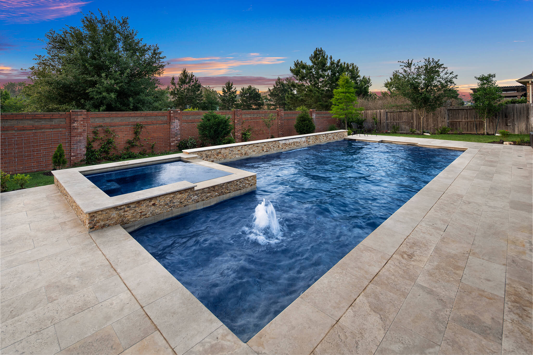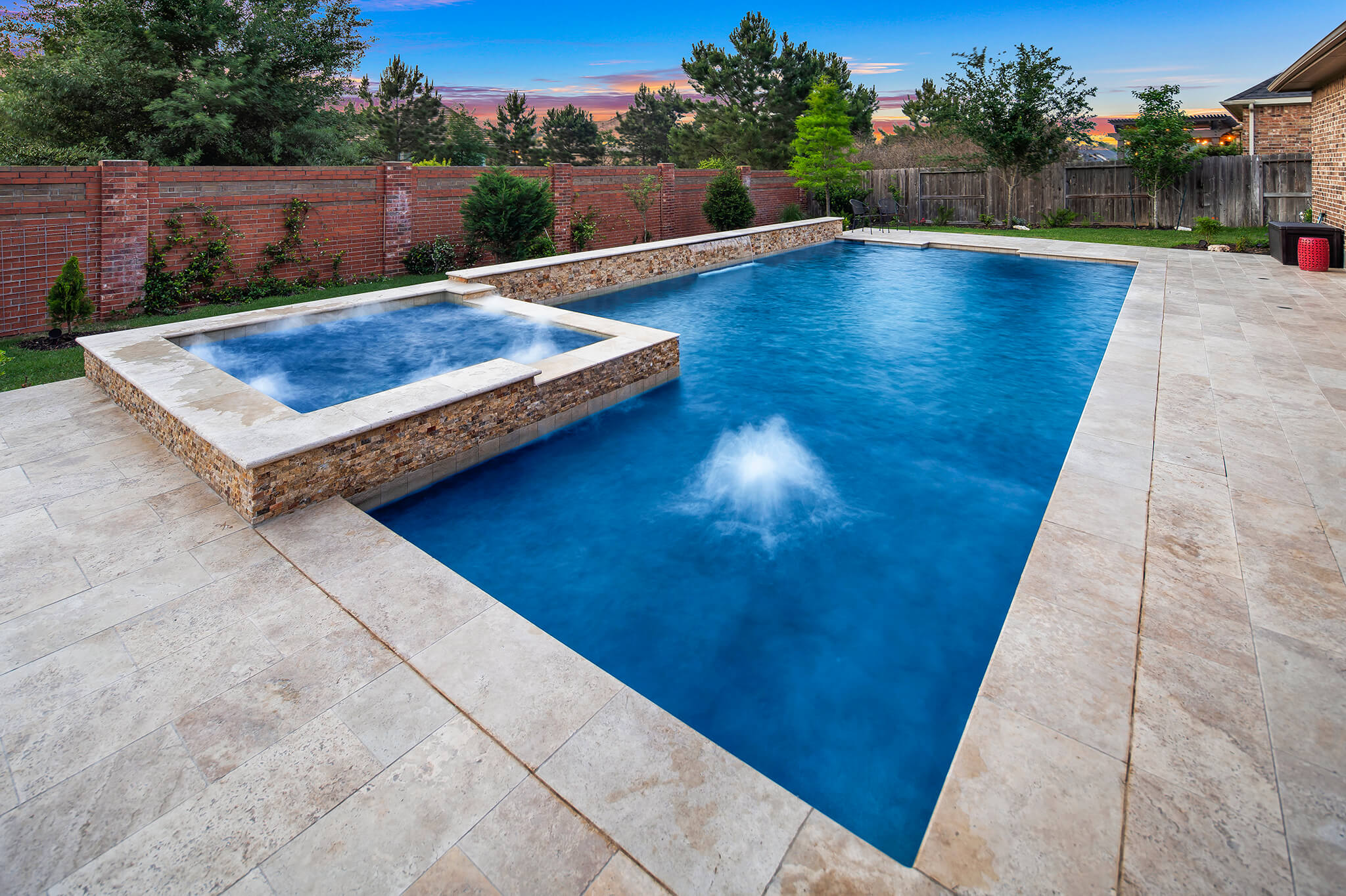 We built this large rectangular pool with a deep blue finish and a matching raised spa. The back wall includes smooth waterfall spillways and a center jet fountain for added movement. Travertine pavers complete the classic and polished look, making the space perfect for relaxing or hosting friends.