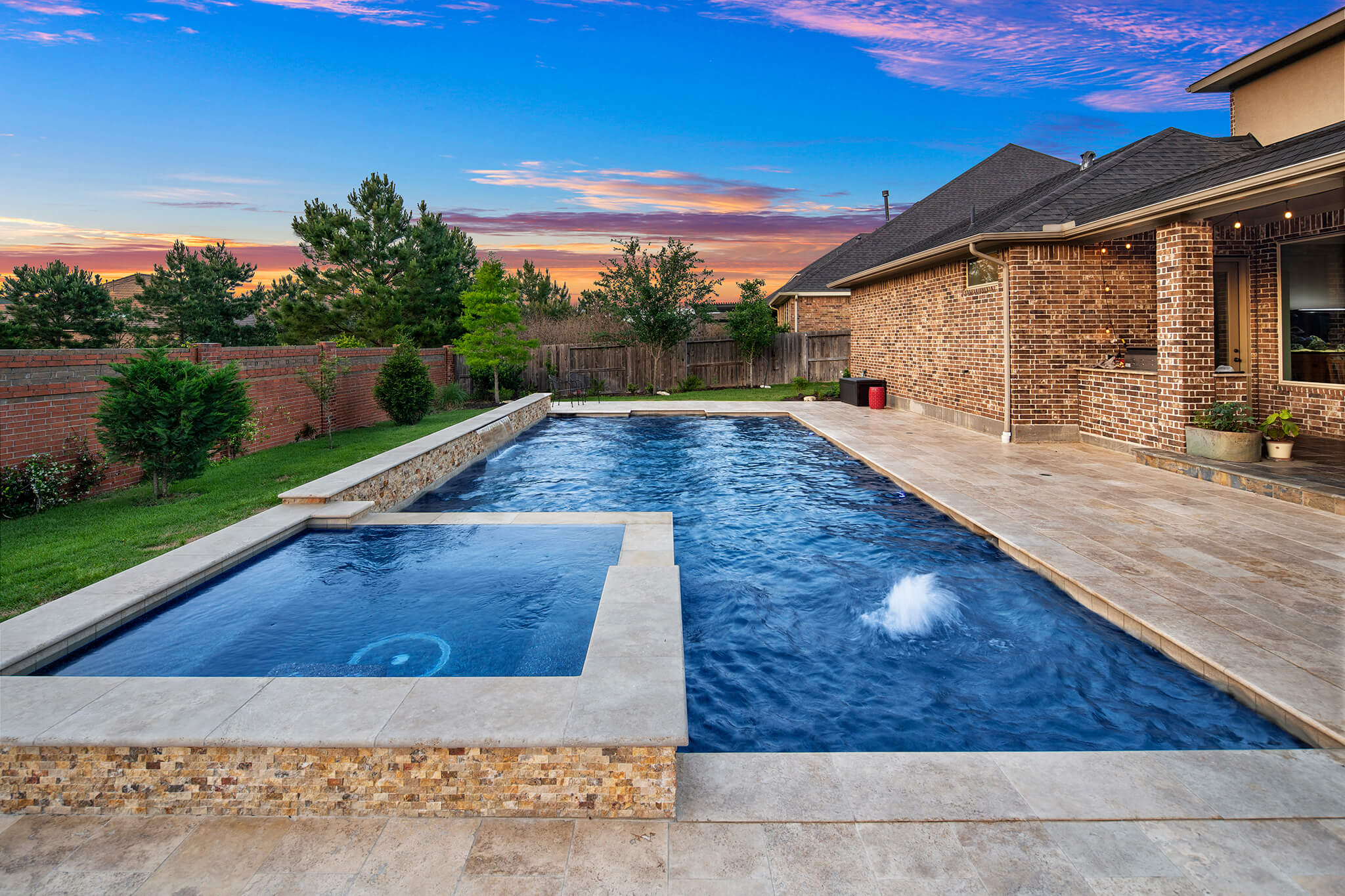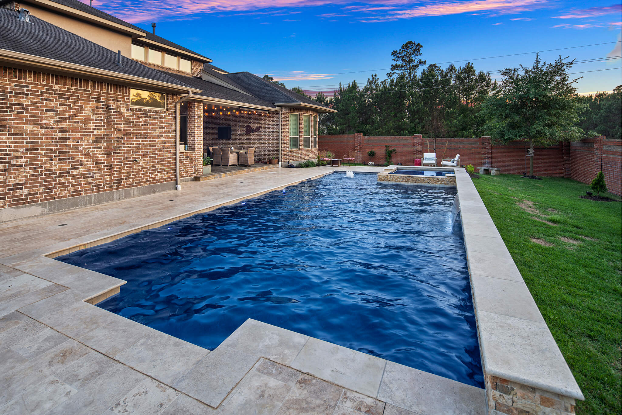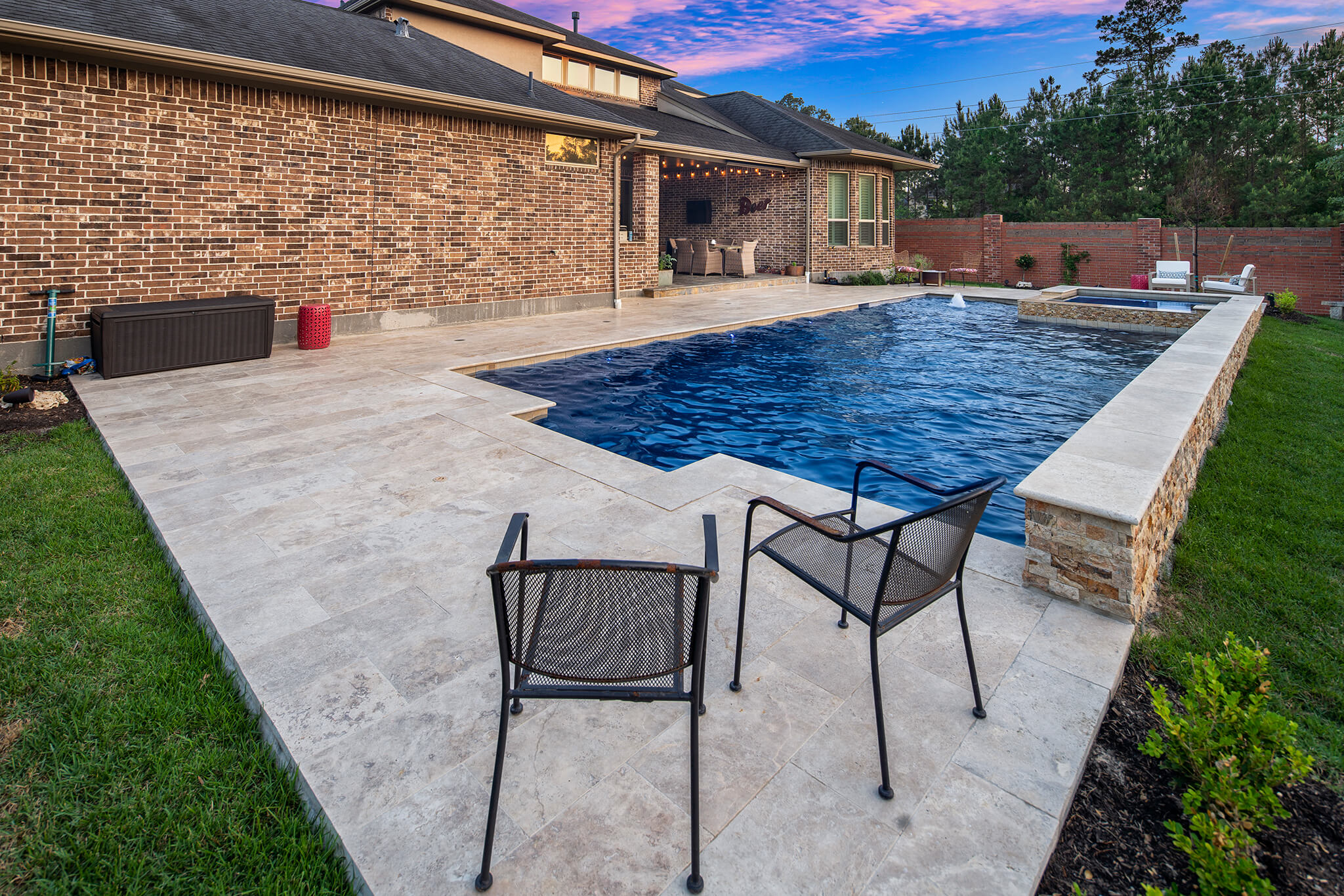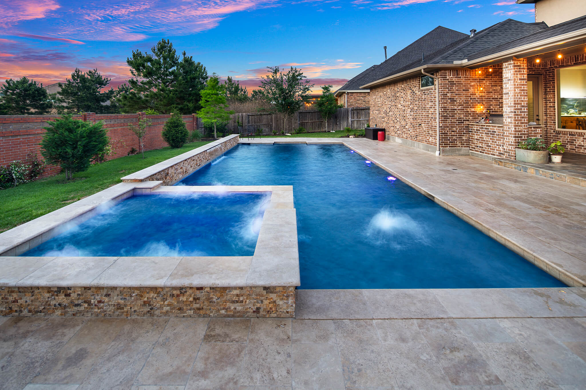 We built this large rectangular pool with a deep blue finish and a matching raised spa. The back wall includes smooth waterfall spillways and a center jet fountain for added movement. Travertine pavers complete the classic and polished look, making the space perfect for relaxing or hosting friends.