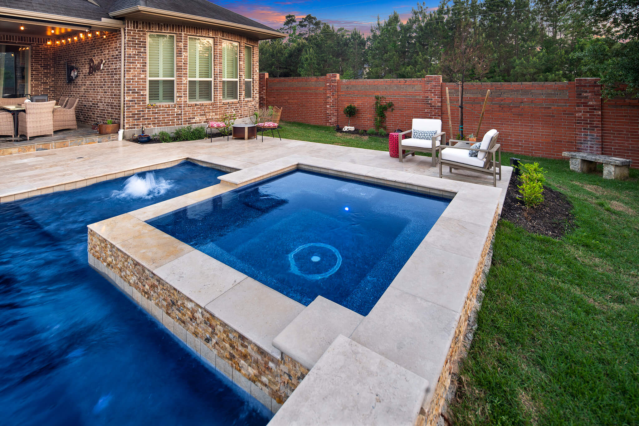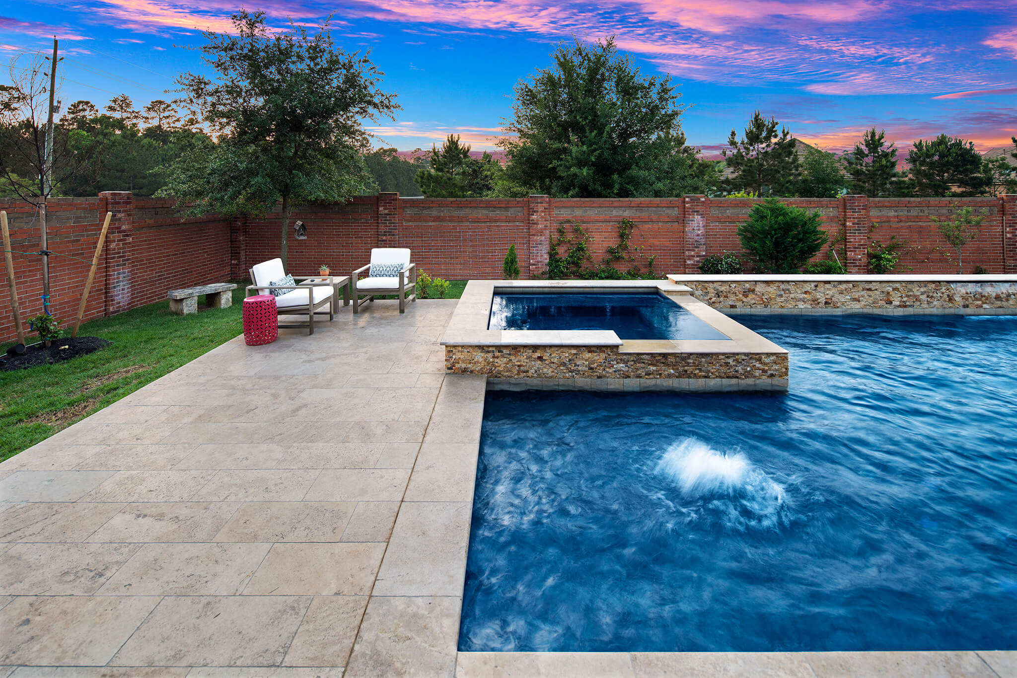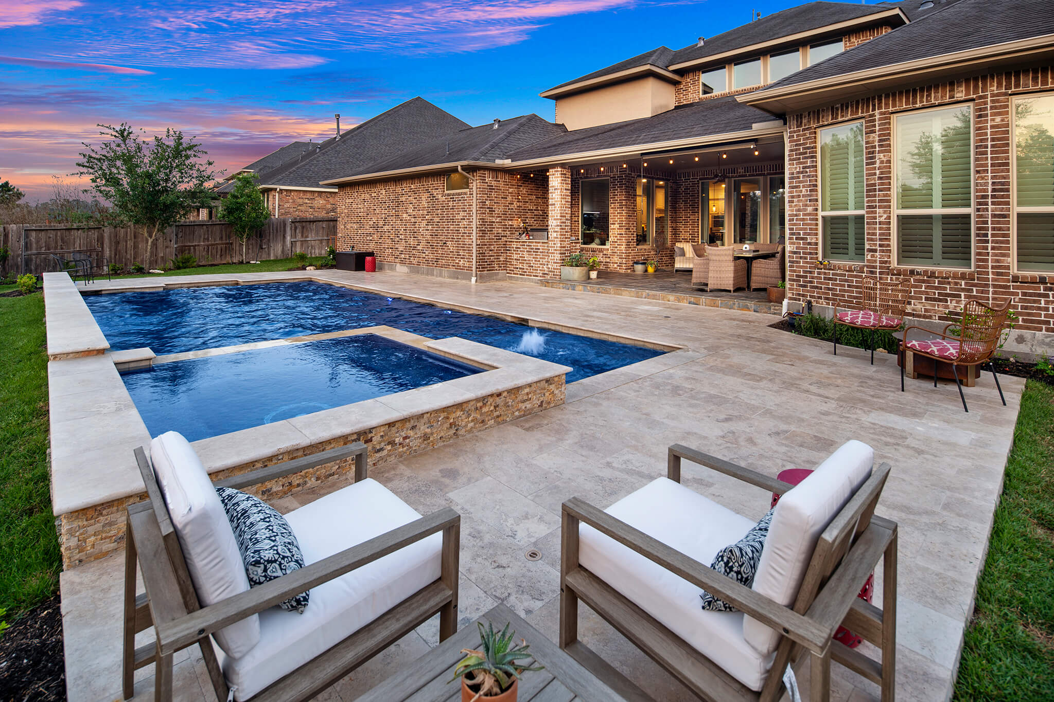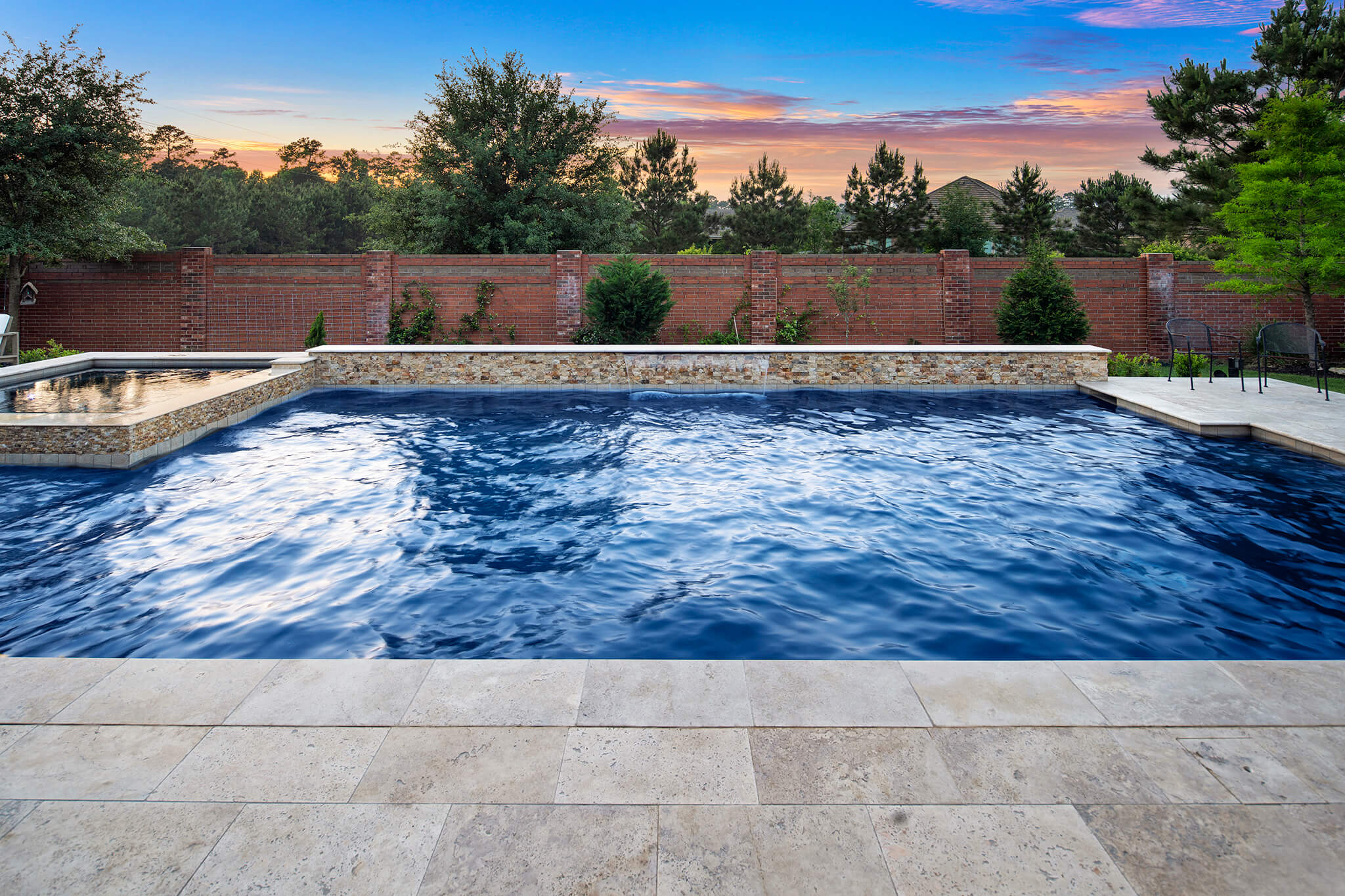 We built this large rectangular pool with a deep blue finish and a matching raised spa. The back wall includes smooth waterfall spillways and a center jet fountain for added movement. Travertine pavers complete the classic and polished look, making the space perfect for relaxing or hosting friends.