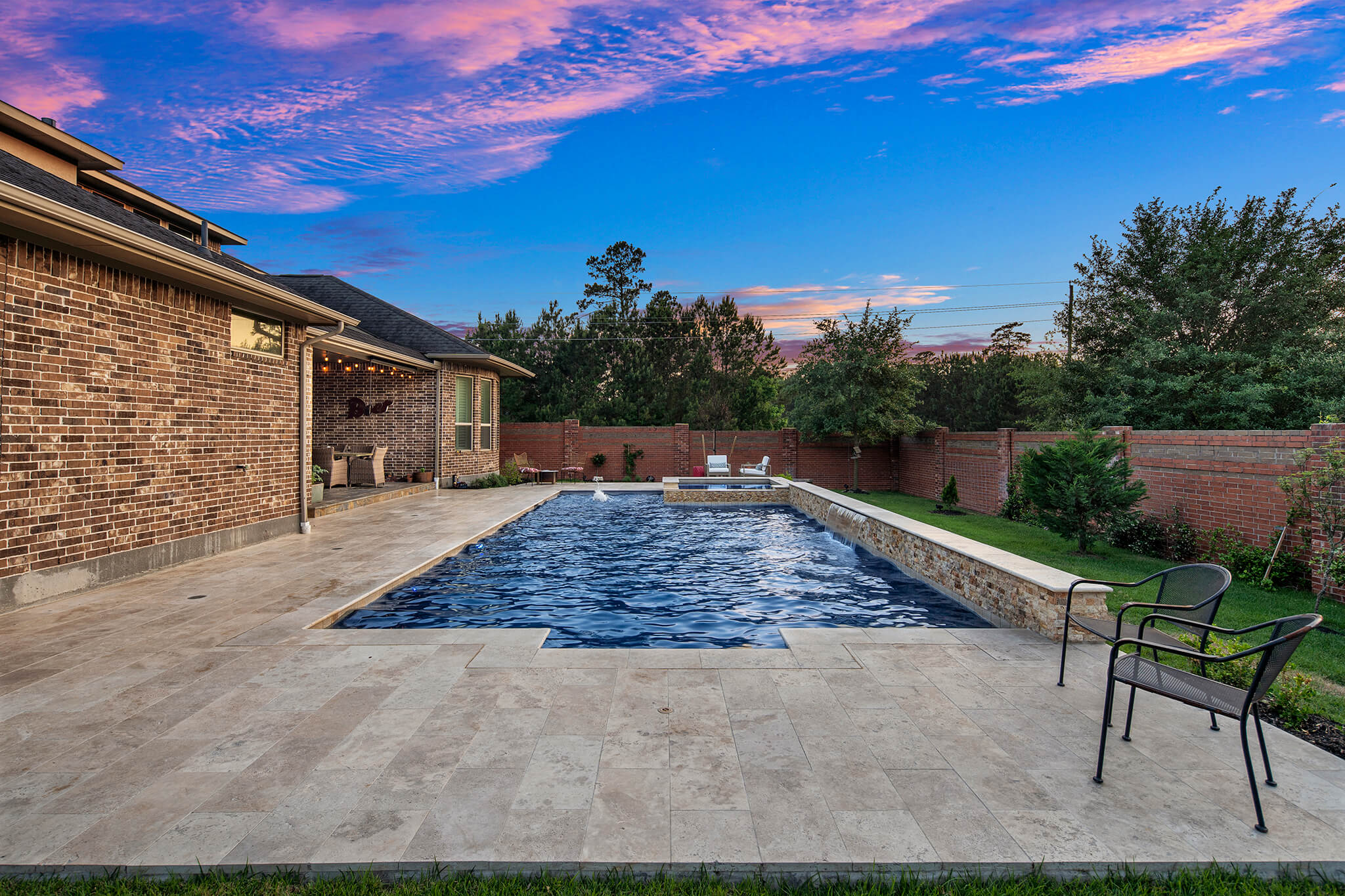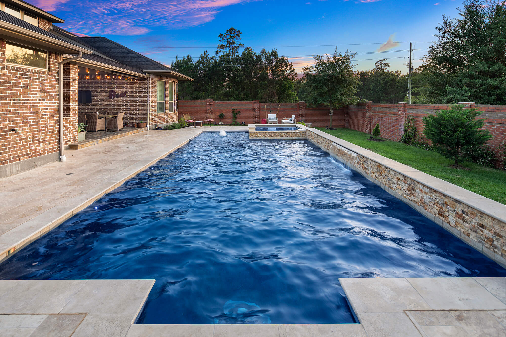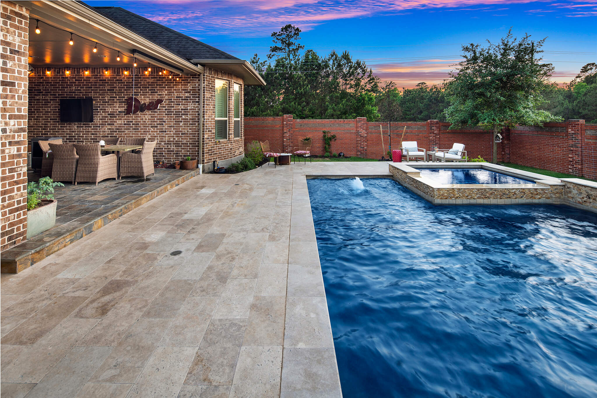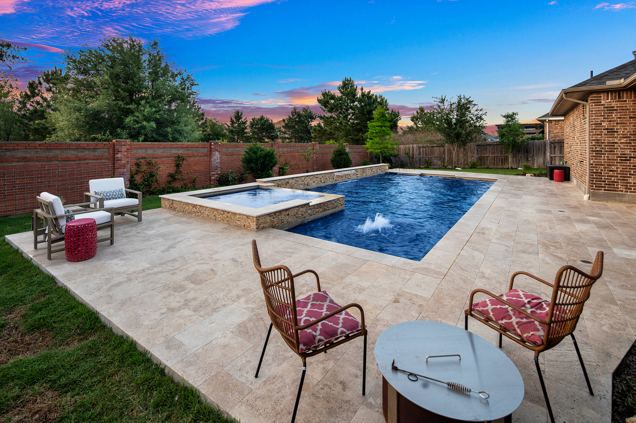 We built this large rectangular pool with a deep blue finish and a matching raised spa. The back wall includes smooth waterfall spillways and a center jet fountain for added movement. Travertine pavers complete the classic and polished look, making the space perfect for relaxing or hosting friends.