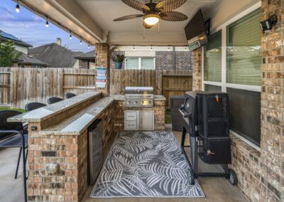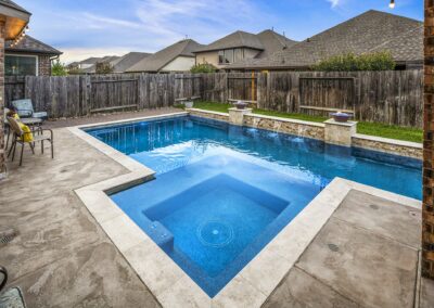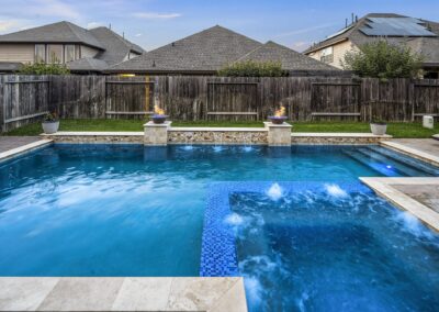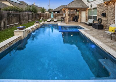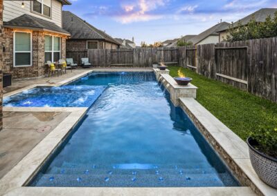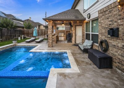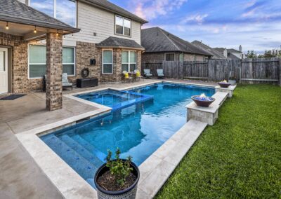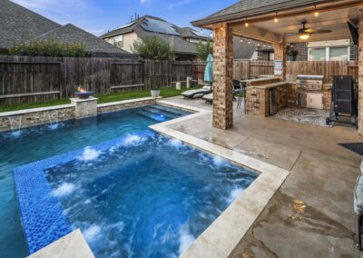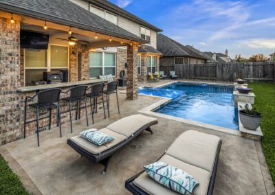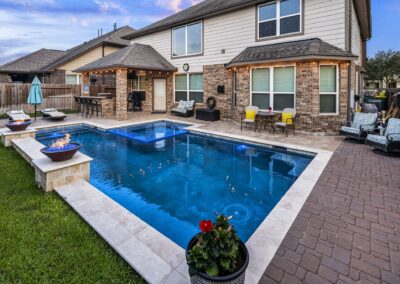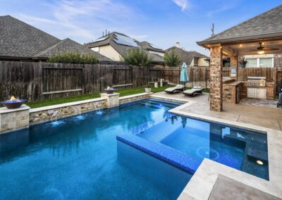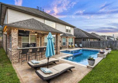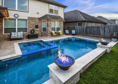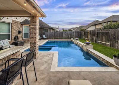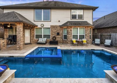 We created this backyard in Cypress to include everything for relaxing and hosting guests. The granite outdoor kitchen has a built-in grill and TV, while the lounge seating nearby makes it easy to enjoy the space. The geometric pool features a sleek built-in spa and smooth waterfalls. At night, glowing fire bowls and textured concrete decking give it a modern and cozy atmosphere.