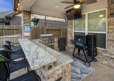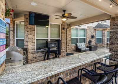 Granite bar with built-in grill, TV, and comfy lounge seating