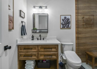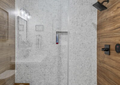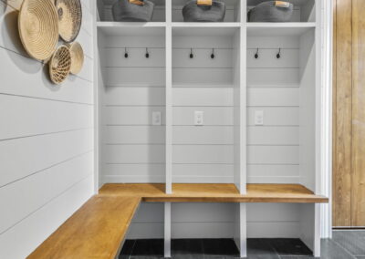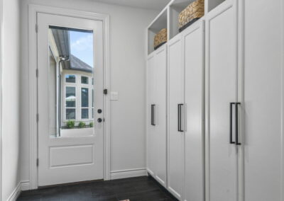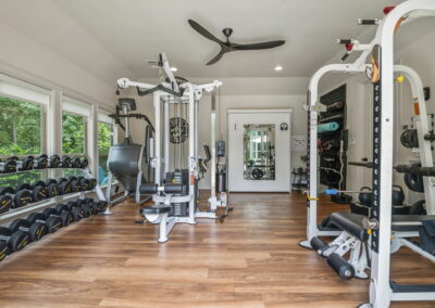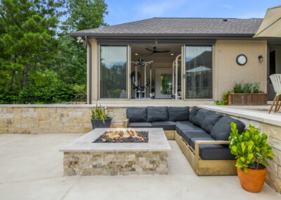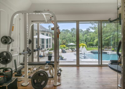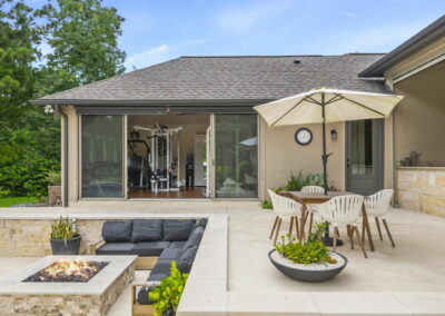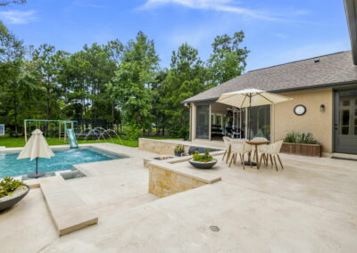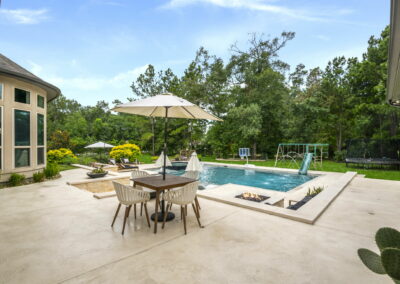 This home in Benders Landing Estates, Spring, includes a full backyard, gym, and pool bath buildout. We added a modern geometric pool with a raised spa and soft water fountains. A sunken fire pit lounge creates a cozy space to hang out. Inside, the mudroom has built-in cubbies and a wrap-around bench for storage. The pool bath features pebble tile and a custom vanity, and the private gym has natural light and views of the backyard.