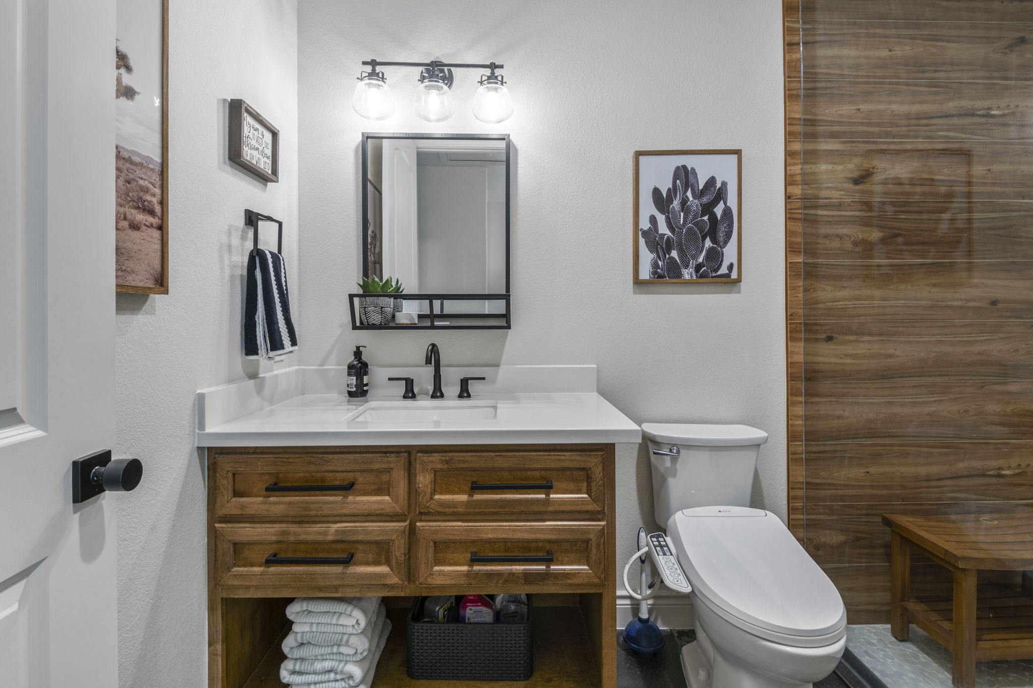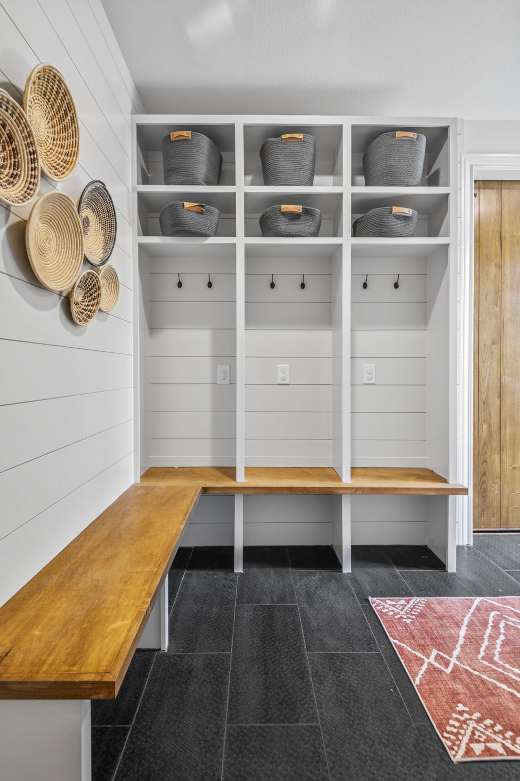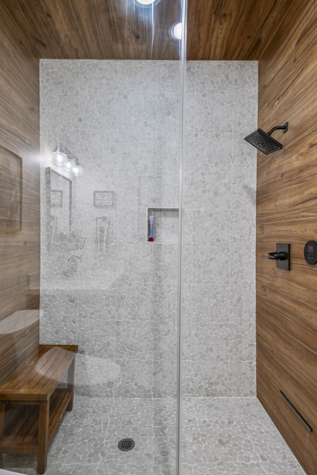 Shower with mermaid-scale tile, marble-look vanity, shiplap walls, and built-in towel storage with a bench