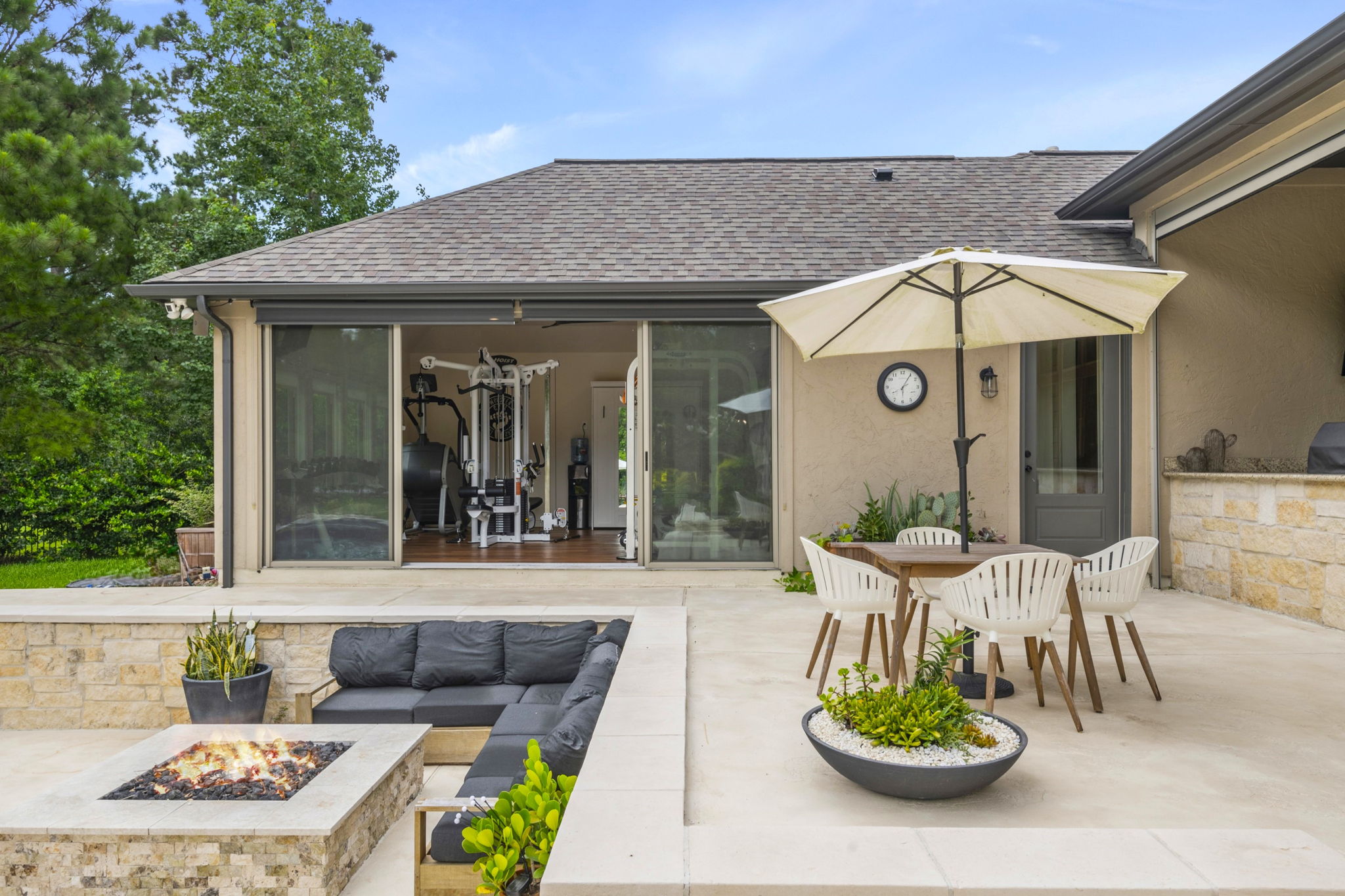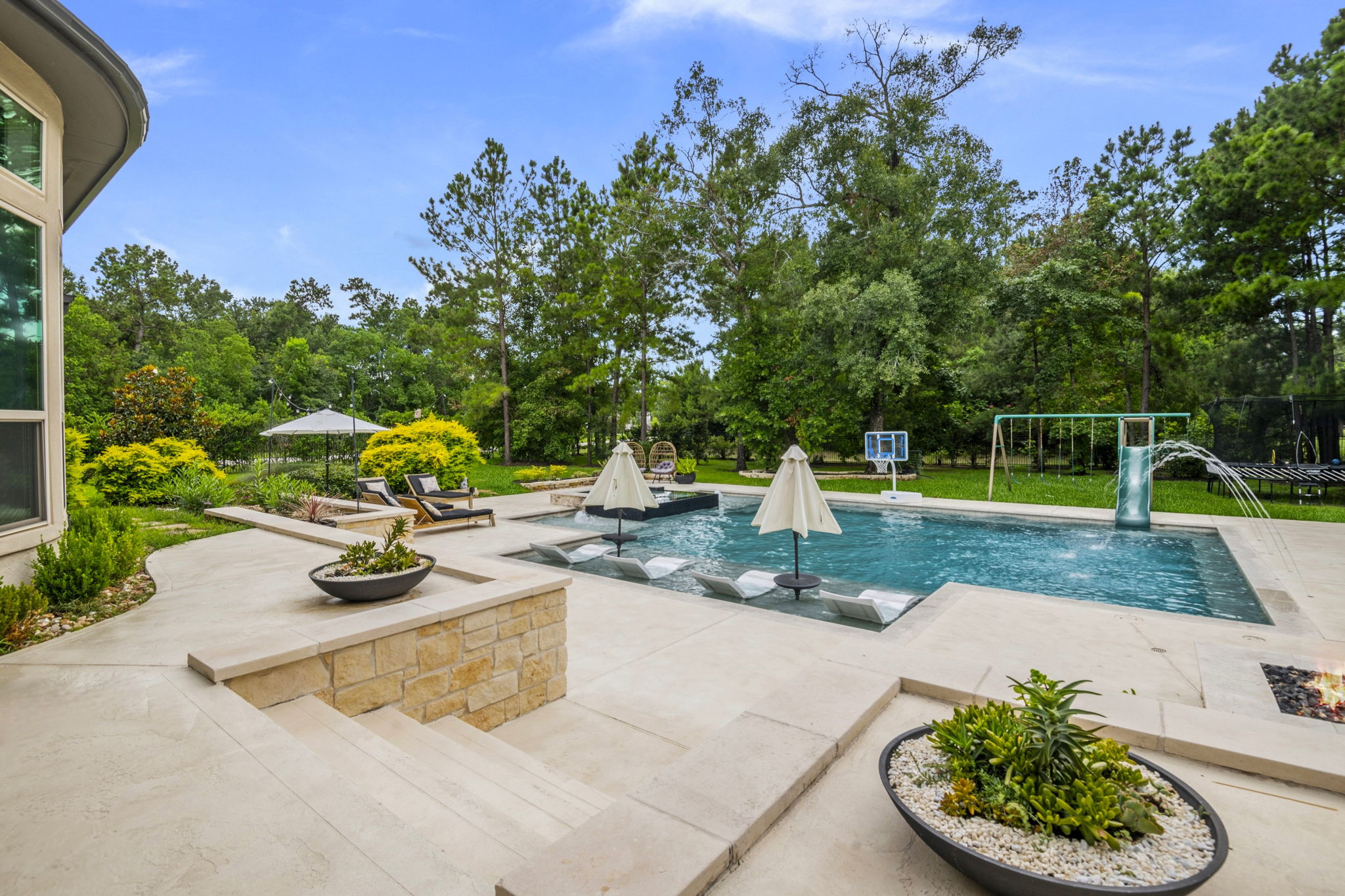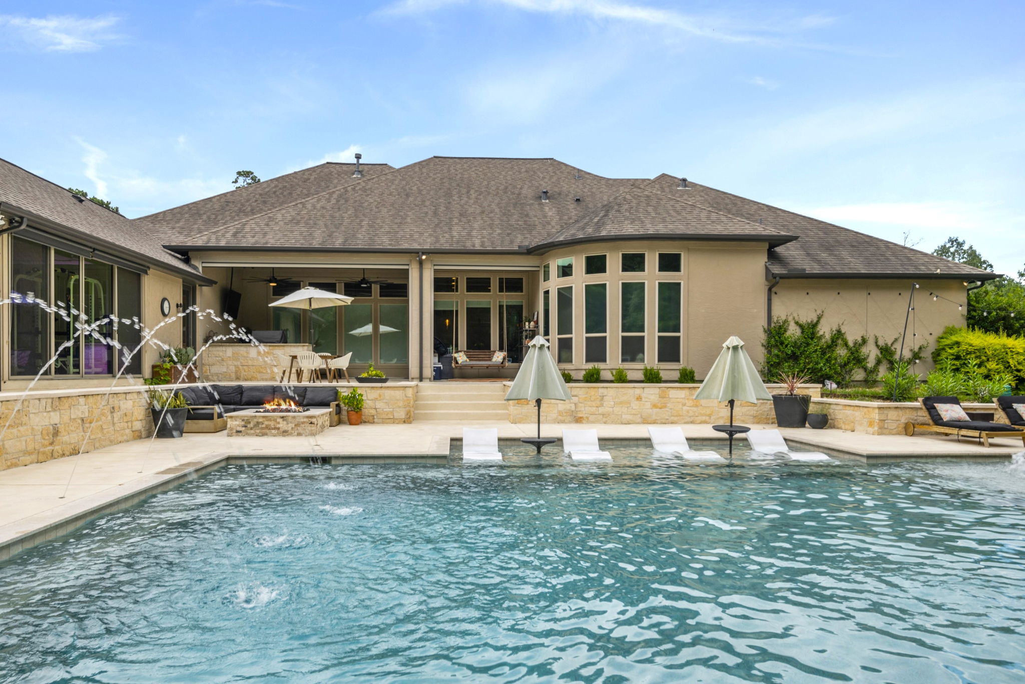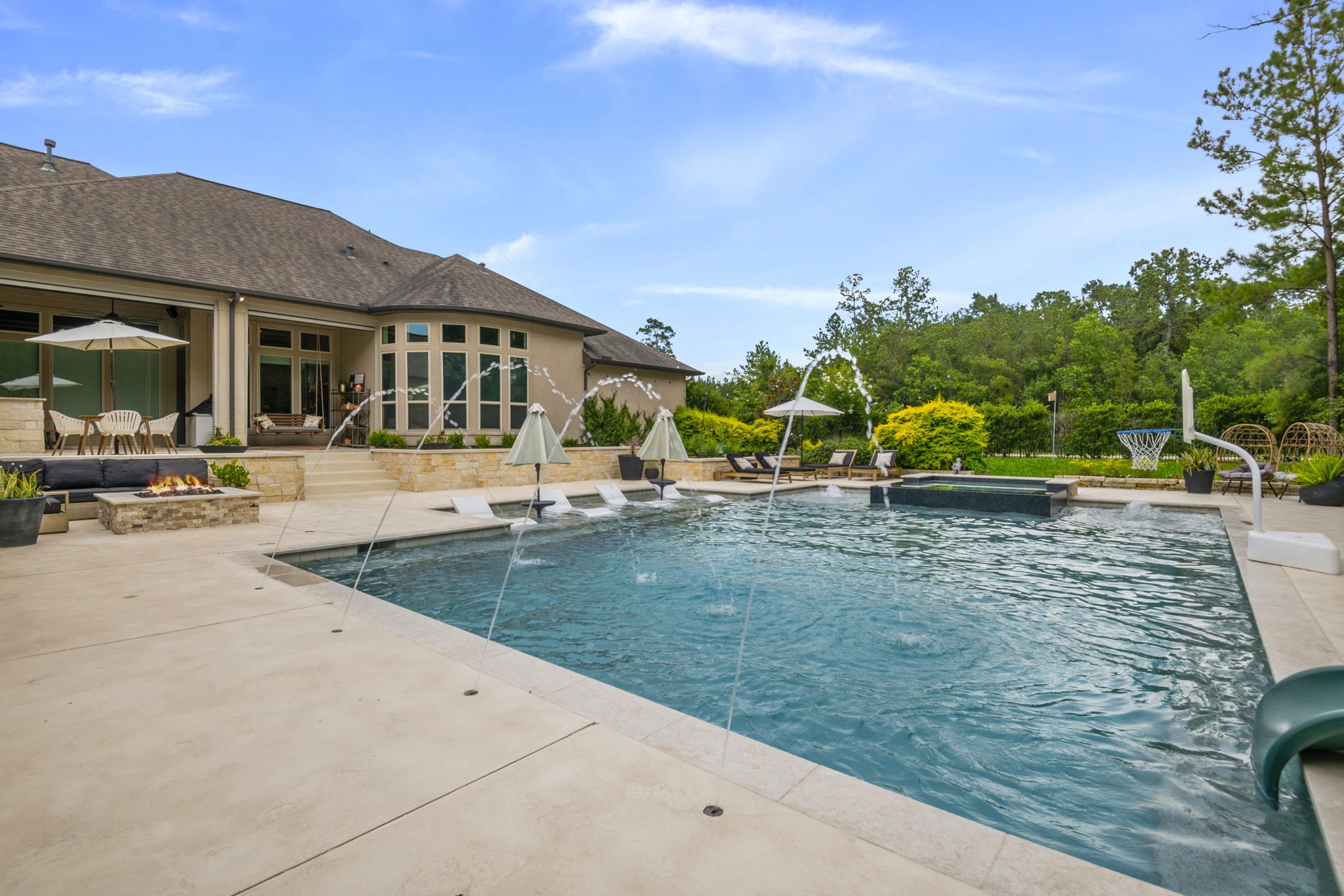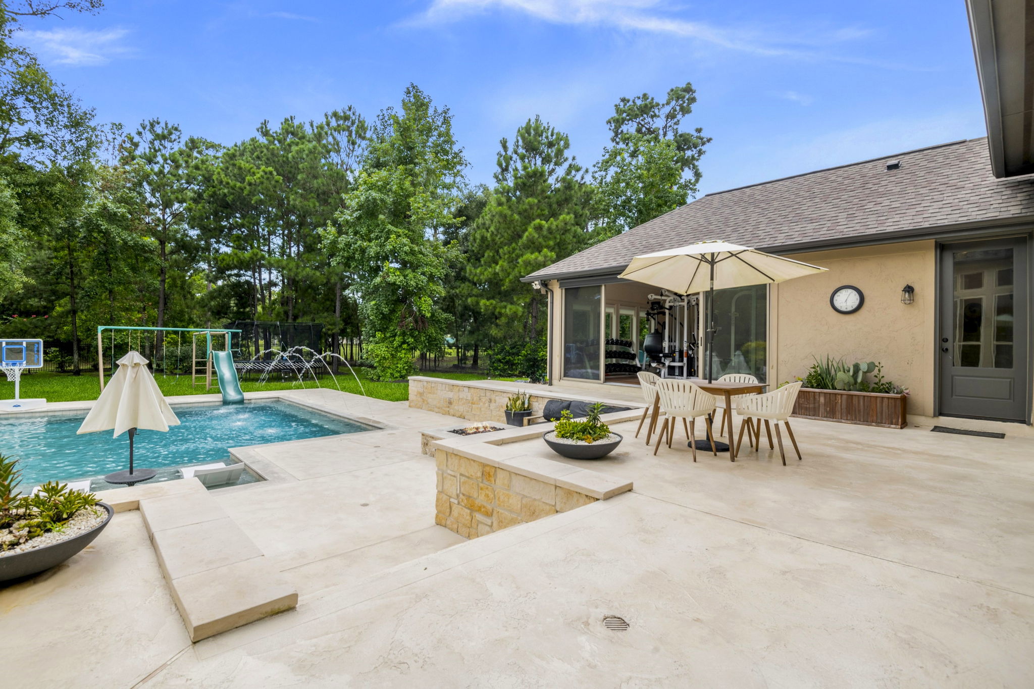 This home in Benders Landing Estates, Spring, includes a full backyard, gym, and pool bath buildout. We added a modern geometric pool with a raised spa and soft water fountains. A sunken fire pit lounge creates a cozy space to hang out. Inside, the mudroom has built-in cubbies and a wrap-around bench for storage. The pool bath features pebble tile and a custom vanity, and the private gym has natural light and views of the backyard.