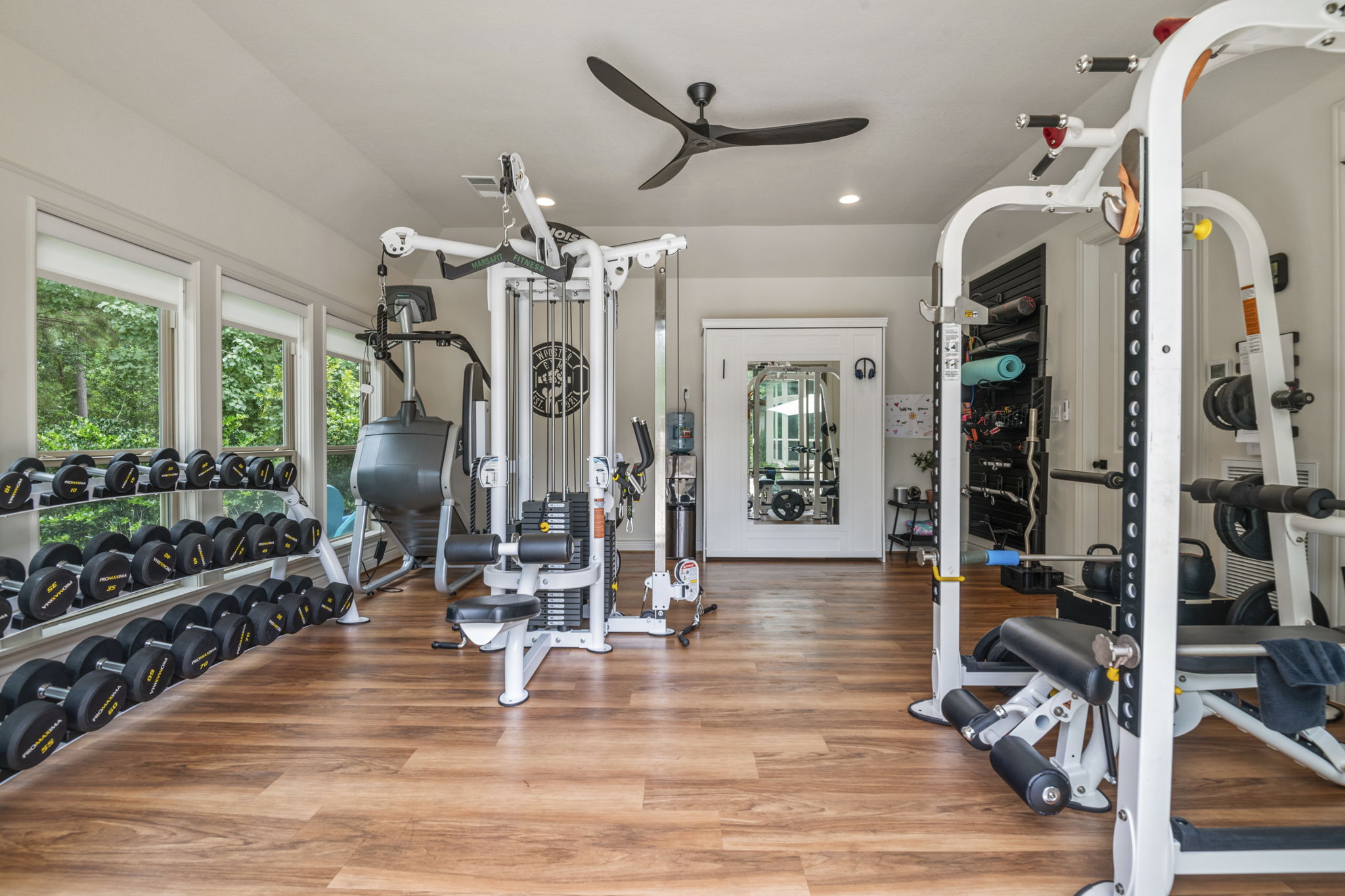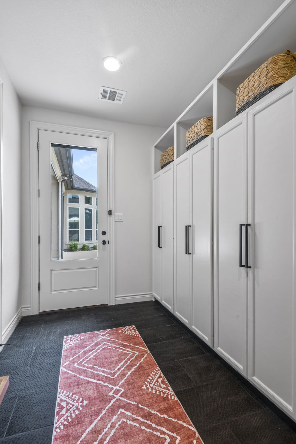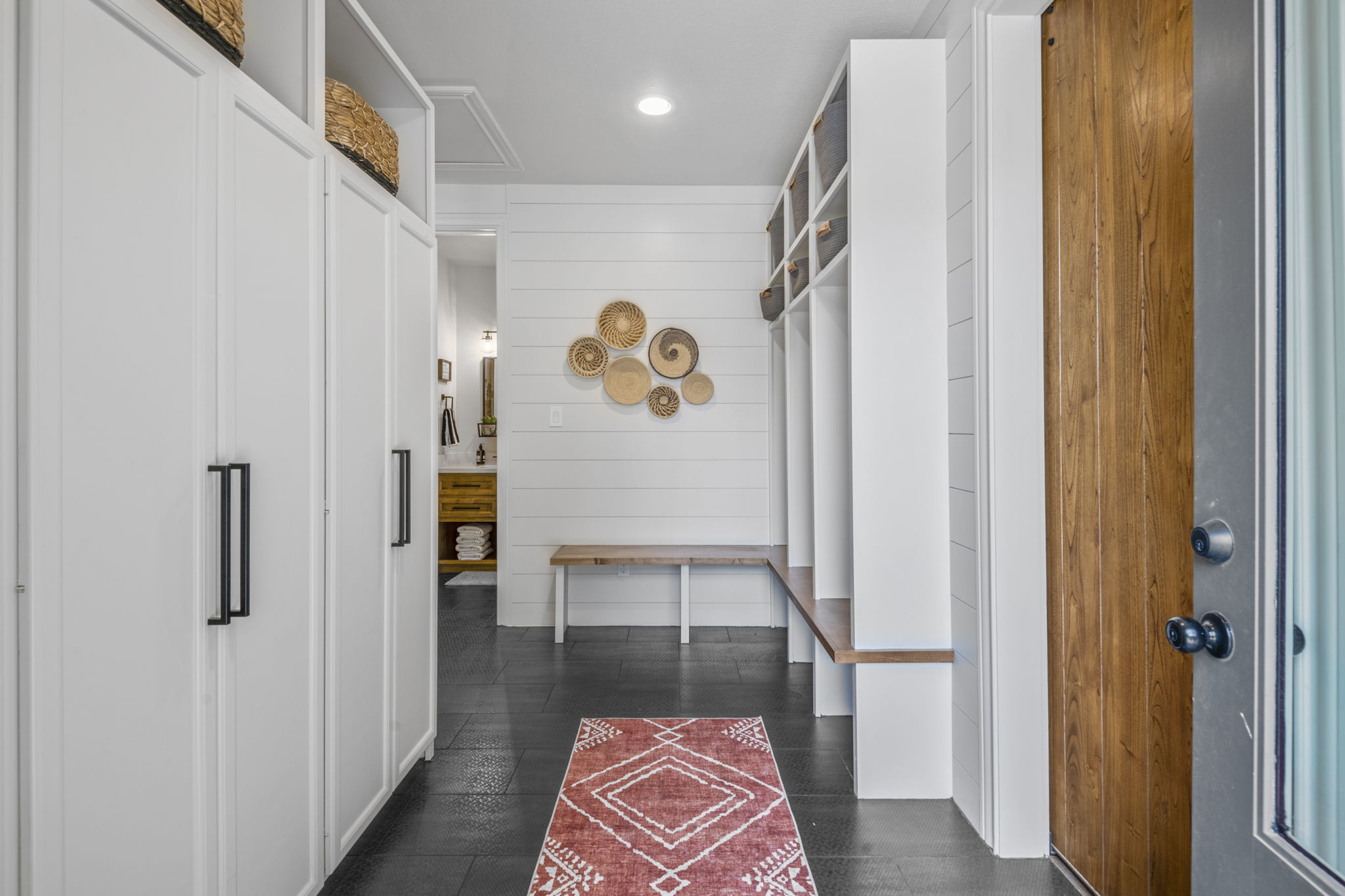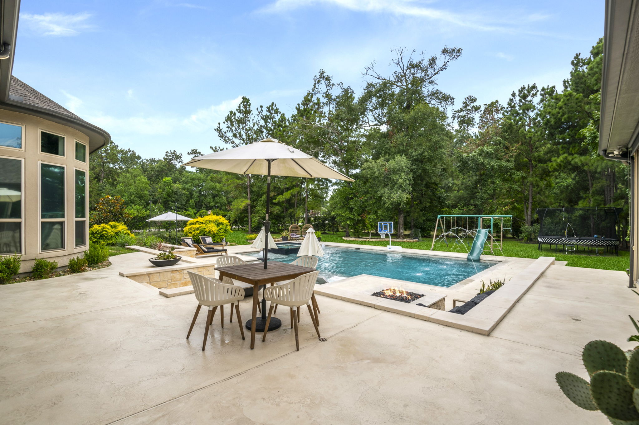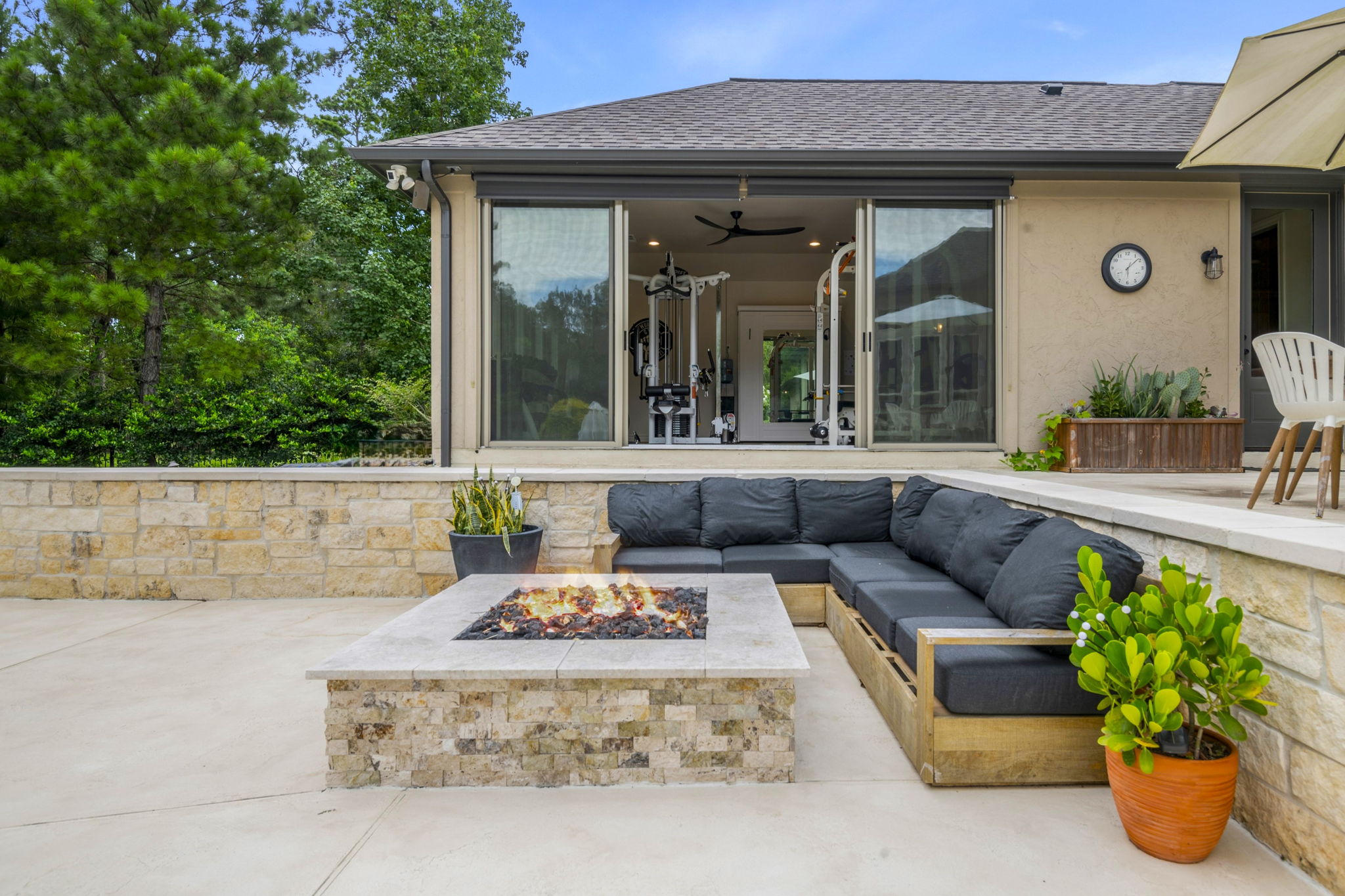 This home in Benders Landing Estates, Spring, includes a full backyard, gym, and pool bath buildout. We added a modern geometric pool with a raised spa and soft water fountains. A sunken fire pit lounge creates a cozy space to hang out. Inside, the mudroom has built-in cubbies and a wrap-around bench for storage. The pool bath features pebble tile and a custom vanity, and the private gym has natural light and views of the backyard.