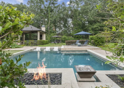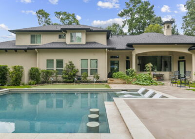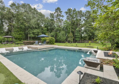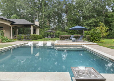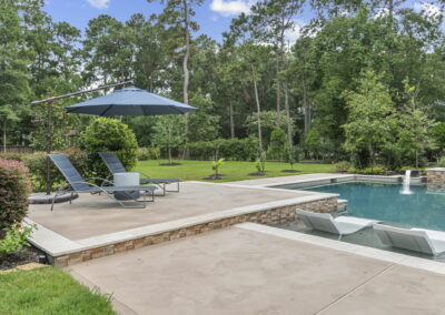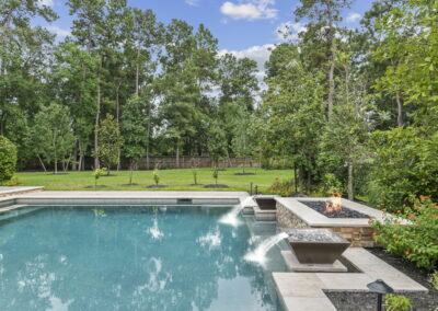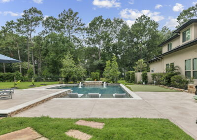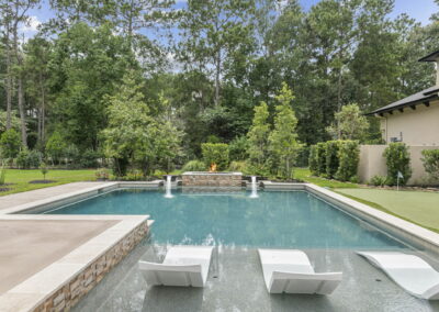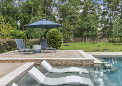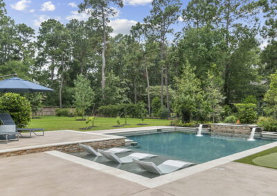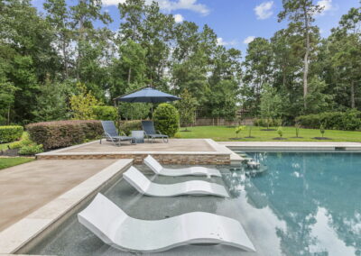 This modern backyard in Benders Landing Estates, Spring, features a rectangular pool with a large tanning ledge and built-in loungers for relaxing in the water. We added two fire bowls with gentle waterfalls for a cozy, inviting feel. A swim-up bar offers easy access to drinks, and the raised sun deck has space for umbrellas and chairs. We also installed a mini putting green to add a little extra fun.