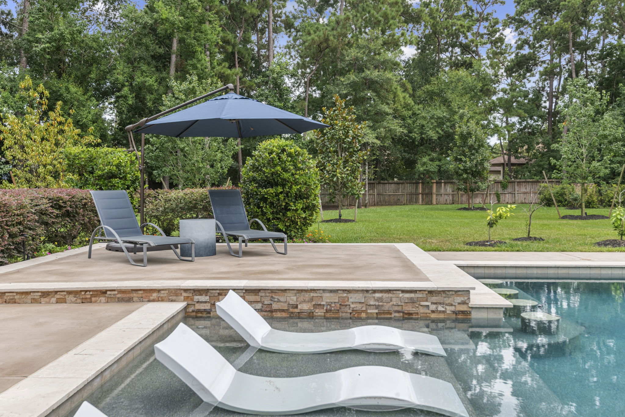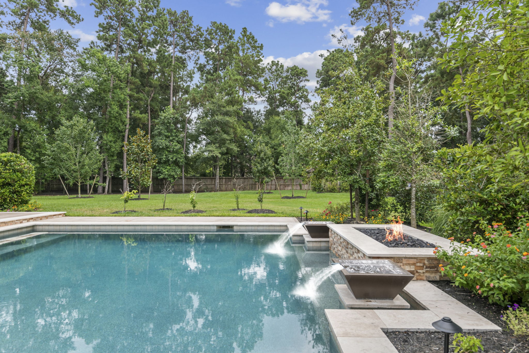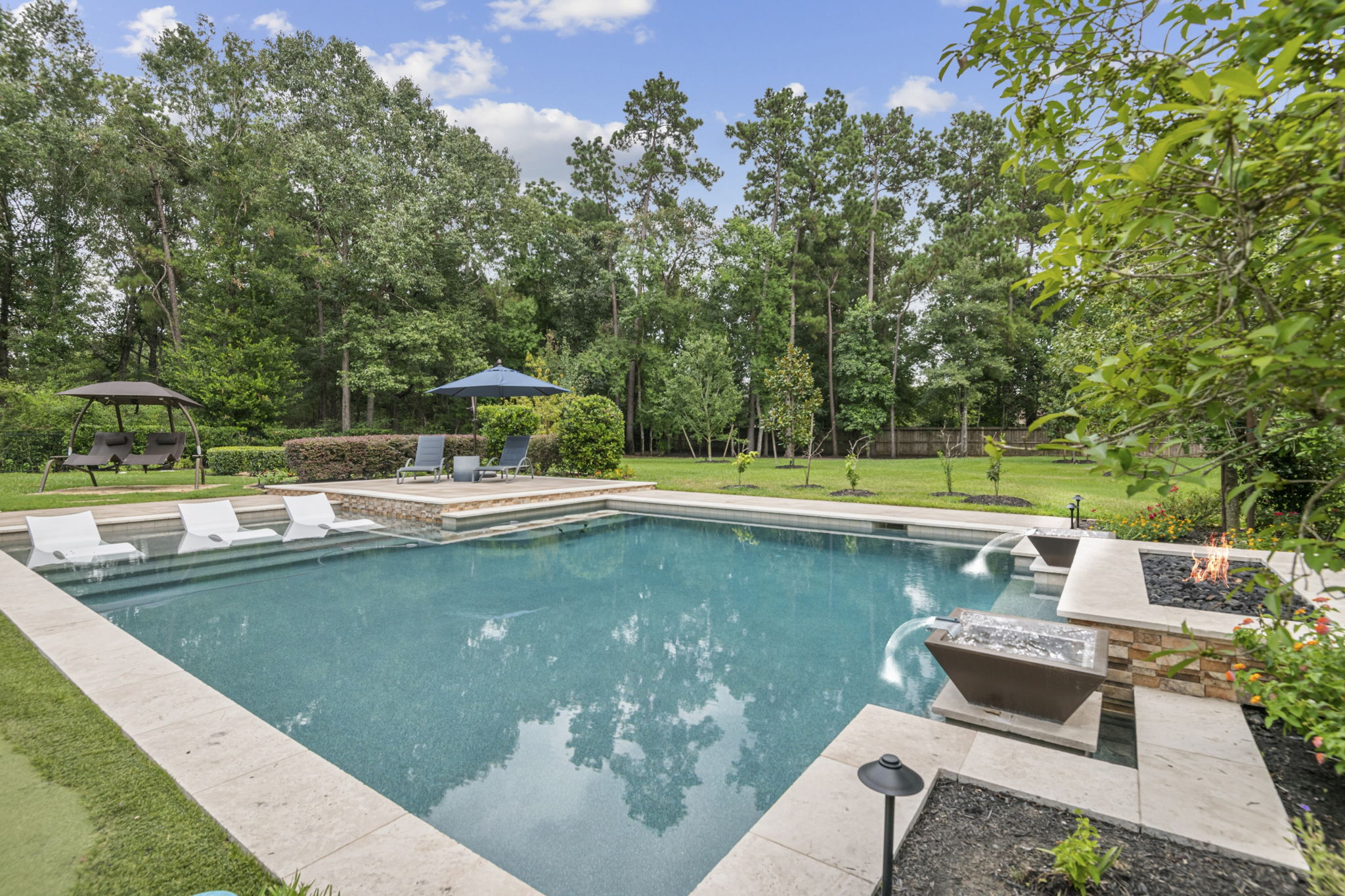 This modern backyard in Benders Landing Estates, Spring, features a rectangular pool with a large tanning ledge and built-in loungers for relaxing in the water. We added two fire bowls with gentle waterfalls for a cozy, inviting feel. A swim-up bar offers easy access to drinks, and the raised sun deck has space for umbrellas and chairs. We also installed a mini putting green to add a little extra fun.