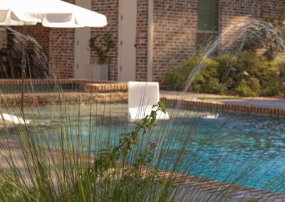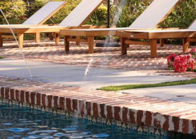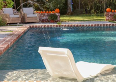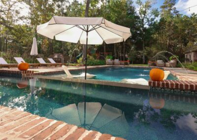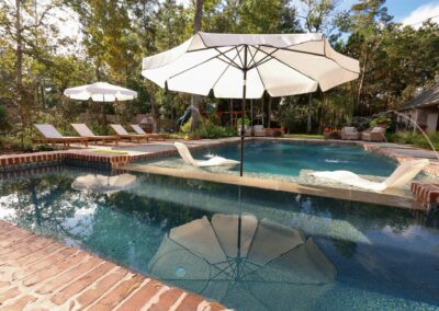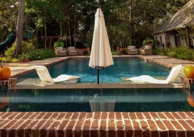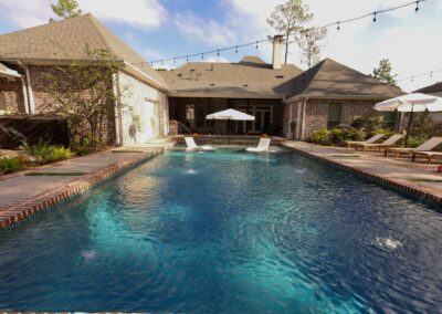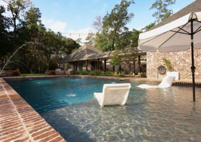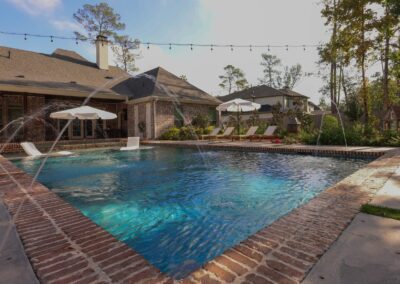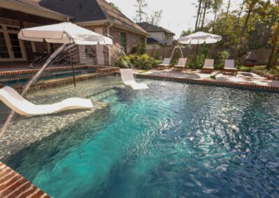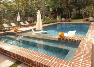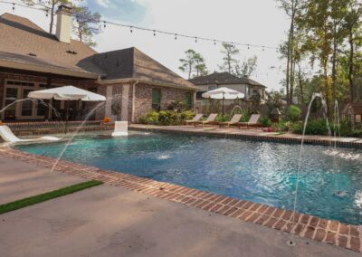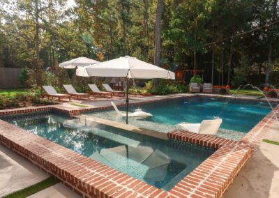 This backyard in Benders Landing Estates, Spring, features a sleek rectangular lap pool with a raised spa that includes a built-in bench and brick trim. The pool has a sun shelf with loungers and places to add umbrellas. Decorative water arcs shoot gently into the pool, and a raised brick divider separates the spa area to keep things organized and stylish.