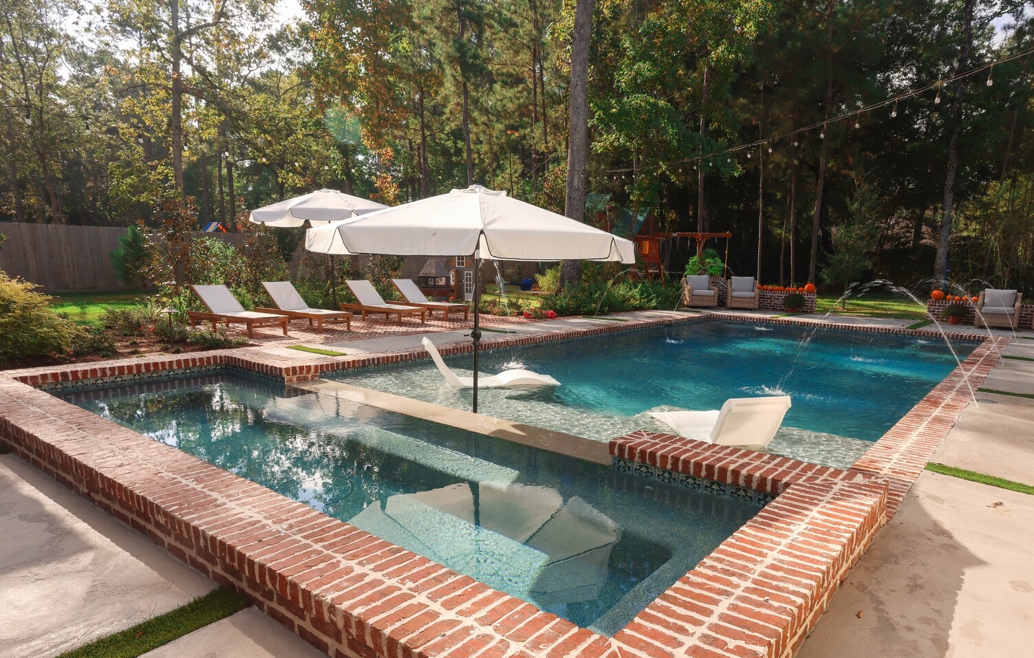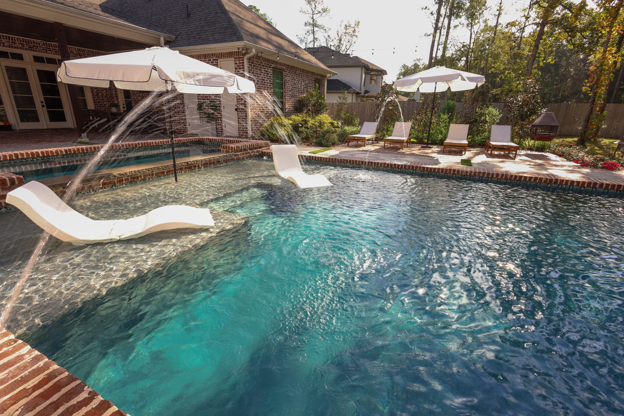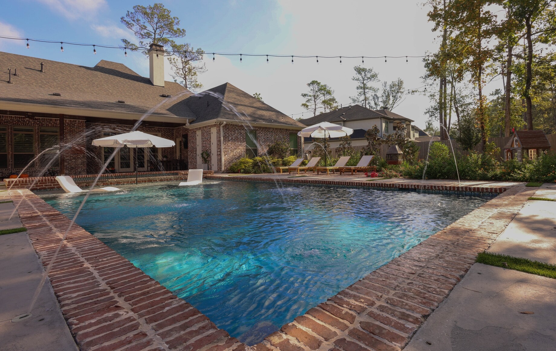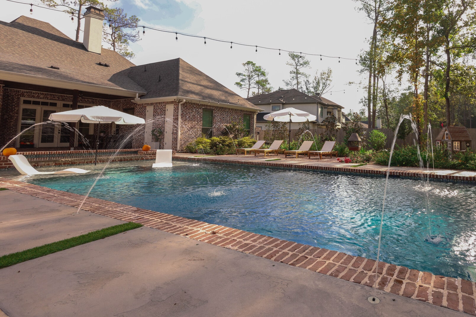 This backyard in Benders Landing Estates, Spring, features a sleek rectangular lap pool with a raised spa that includes a built-in bench and brick trim. The pool has a sun shelf with loungers and places to add umbrellas. Decorative water arcs shoot gently into the pool, and a raised brick divider separates the spa area to keep things organized and stylish.