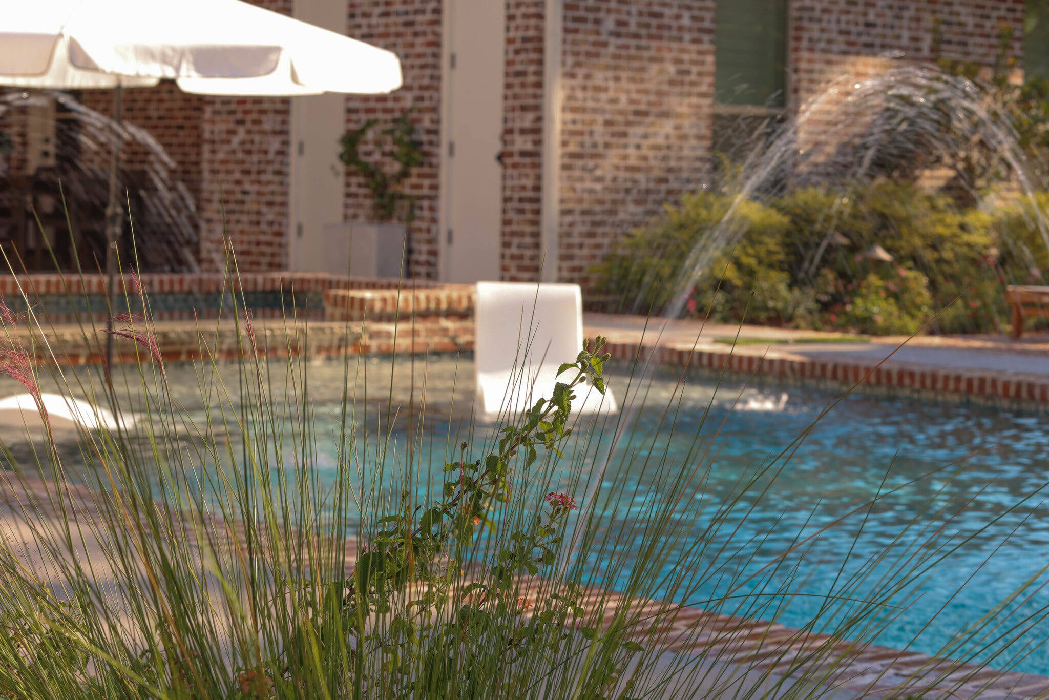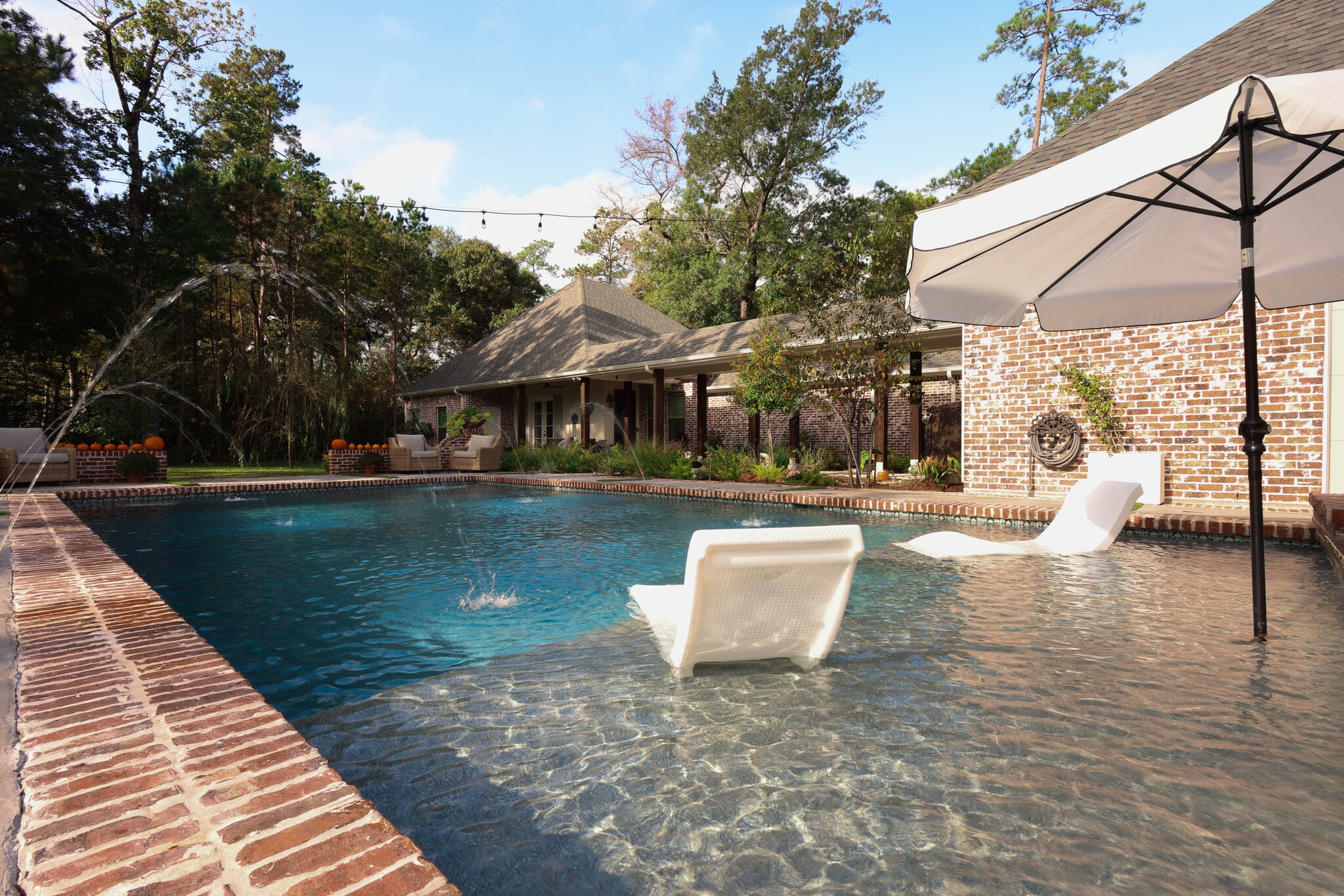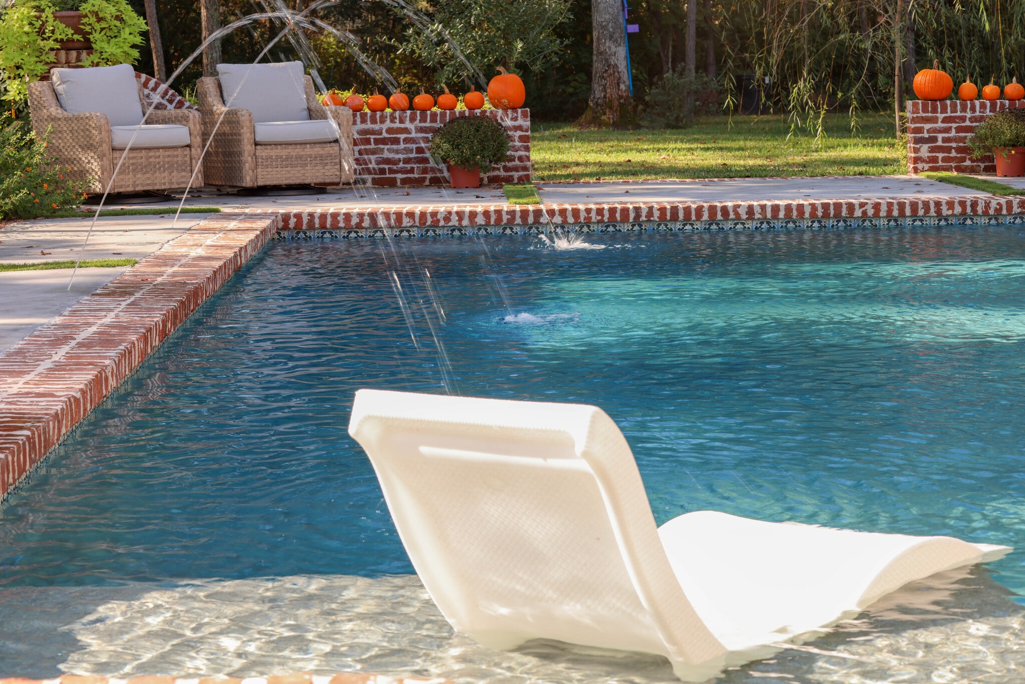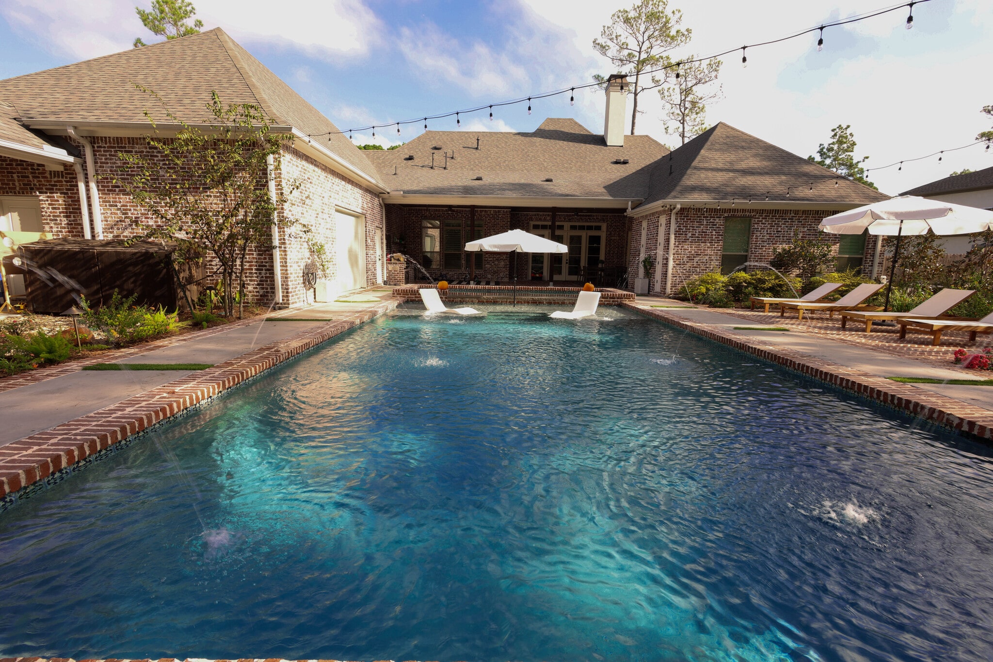 This backyard in Benders Landing Estates, Spring, features a sleek rectangular lap pool with a raised spa that includes a built-in bench and brick trim. The pool has a sun shelf with loungers and places to add umbrellas. Decorative water arcs shoot gently into the pool, and a raised brick divider separates the spa area to keep things organized and stylish.