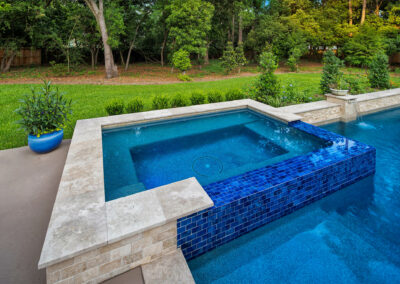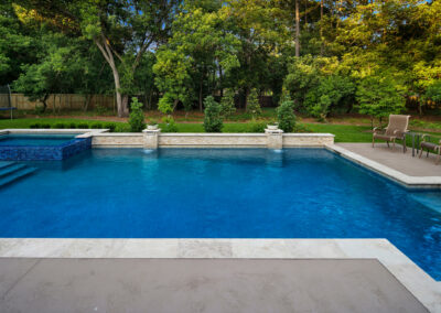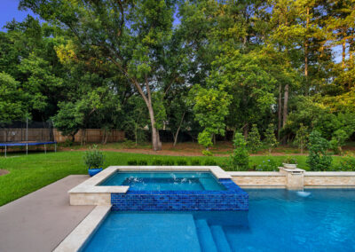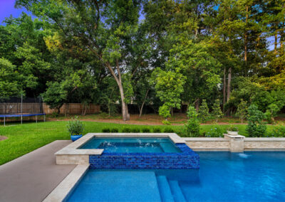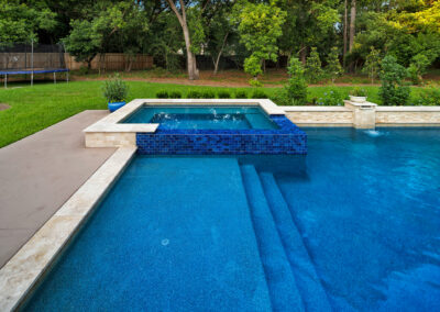 We created this clean and modern backyard with a rectangular pool finished in deep blue. The raised spa features glass tile and a smooth spillover edge. Two fountains bring elegant motion to the water, while the light-colored textured deck gives guests plenty of space to relax and enjoy the outdoors.