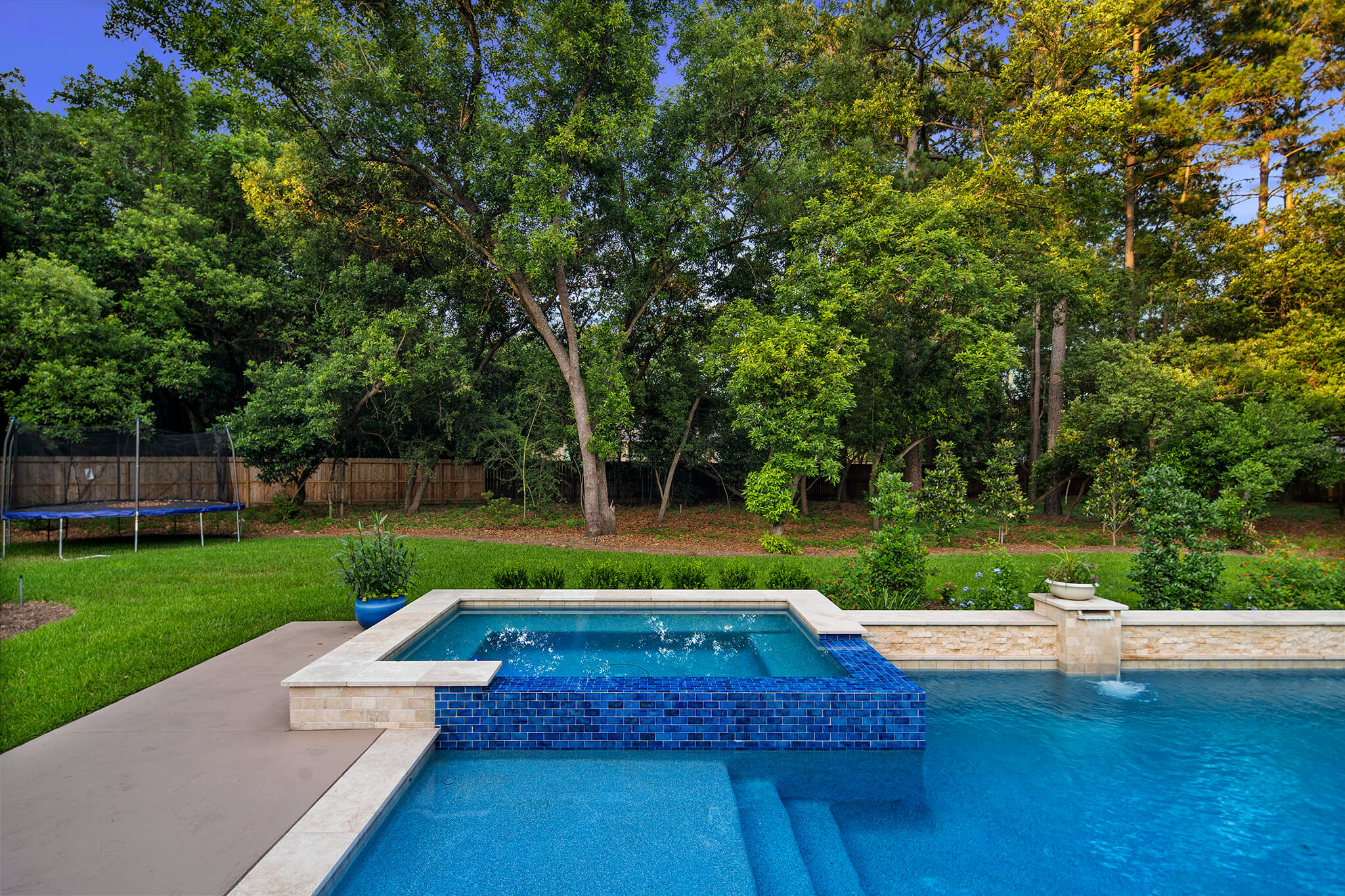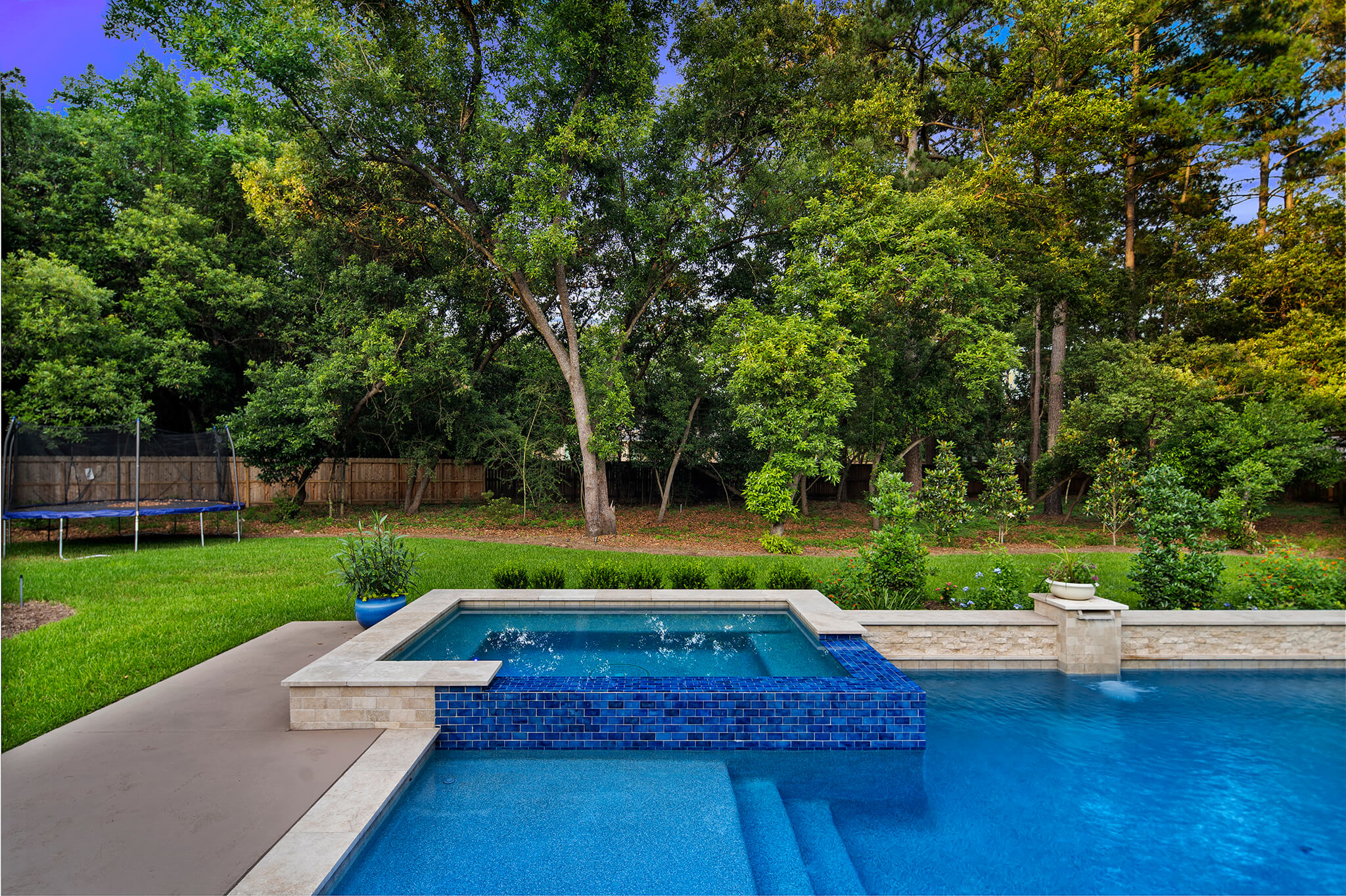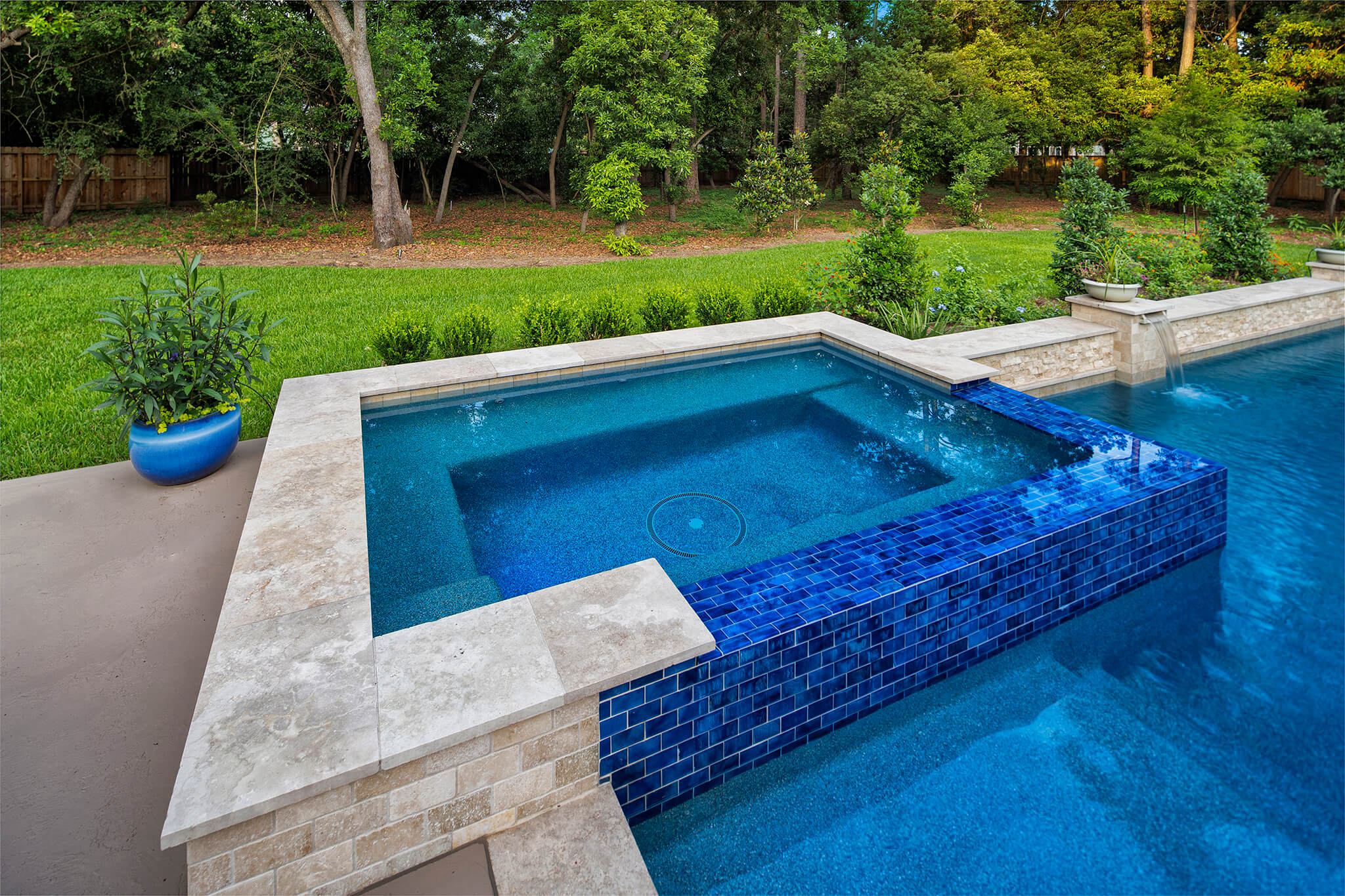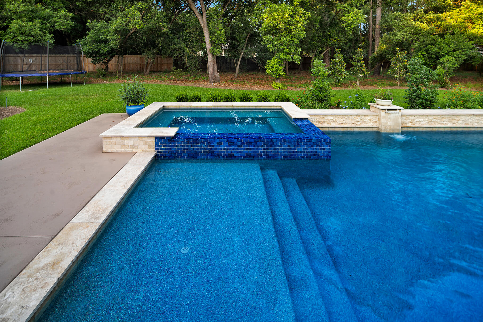 We created this clean and modern backyard with a rectangular pool finished in deep blue. The raised spa features glass tile and a smooth spillover edge. Two fountains bring elegant motion to the water, while the light-colored textured deck gives guests plenty of space to relax and enjoy the outdoors.