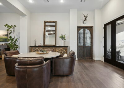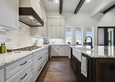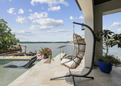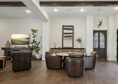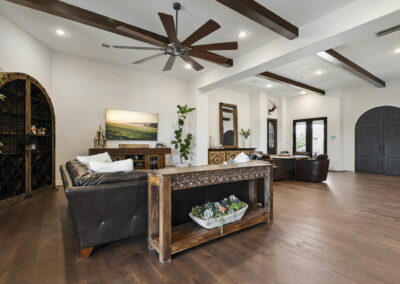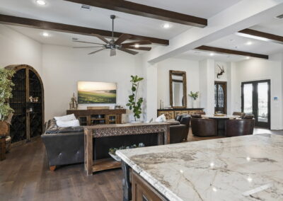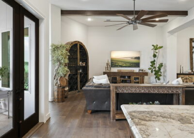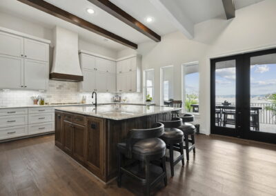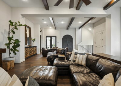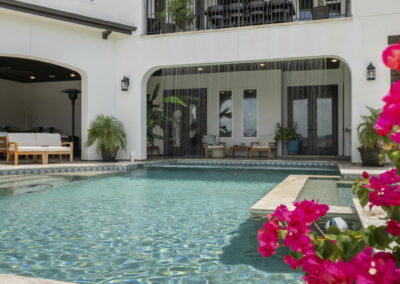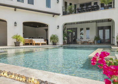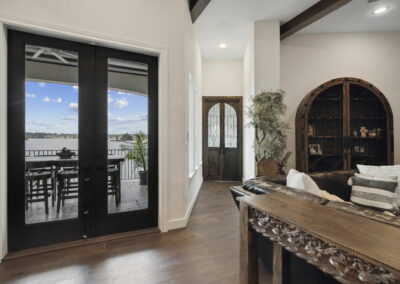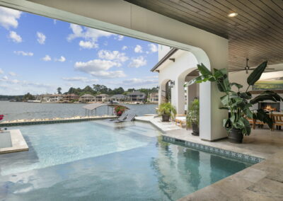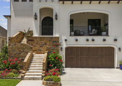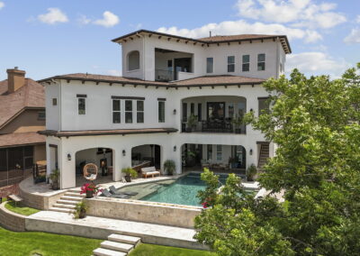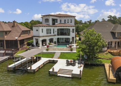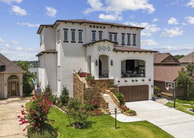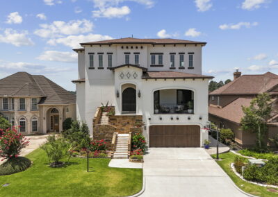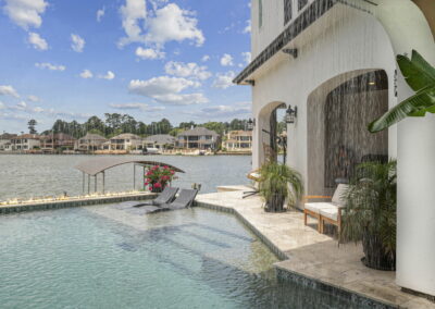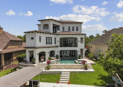 We built this Mediterranean-style home in Bentwater on Lake Conroe with elegant details and a focus on outdoor living. A stone-wrapped split staircase leads to custom iron doors and a grand arched entry. Inside, vaulted ceilings with dark wood beams and a chef’s kitchen with a statement island, custom vent hood, and farmhouse sink create a warm, inviting space. In the back, a two-story covered patio overlooks a geometric pool with a spa, Baja shelf, and travertine decking, perfect for relaxing or entertaining.