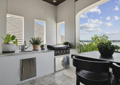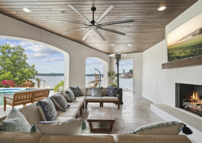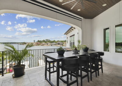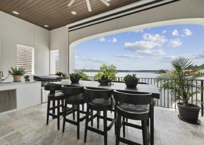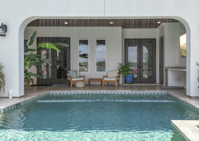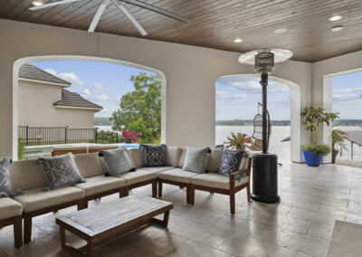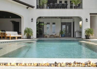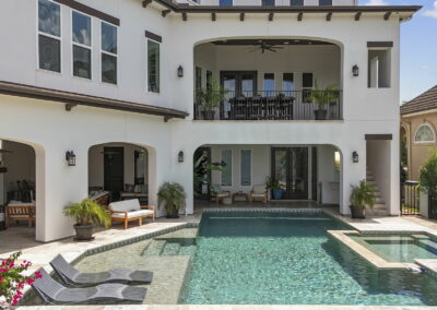 The rear of the home includes a two-level covered patio—upstairs for dining and lounging, and downstairs opening directly to the pool, blending indoor-outdoor living.