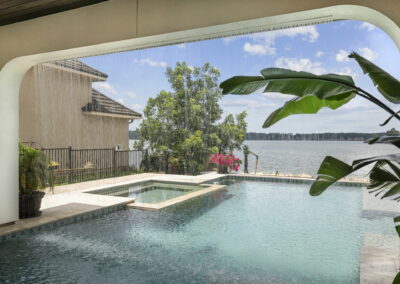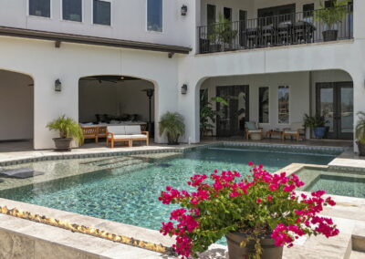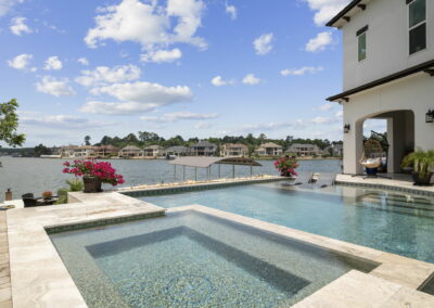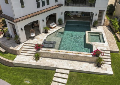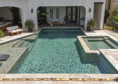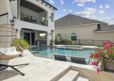 Custom pool design includes an integrated spa, baja shelf with in-pool loungers, and travertine decking for a resort-like feel.