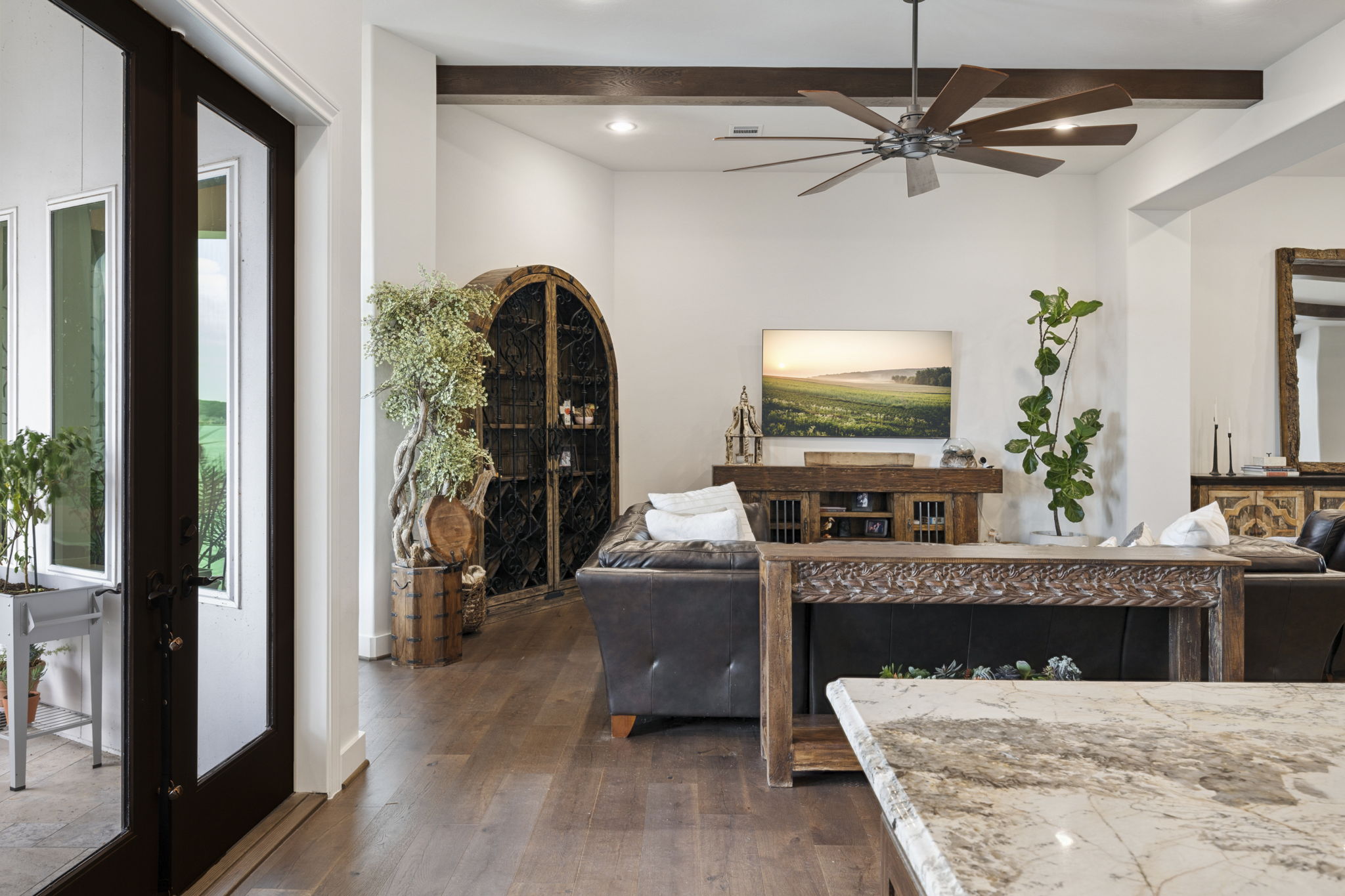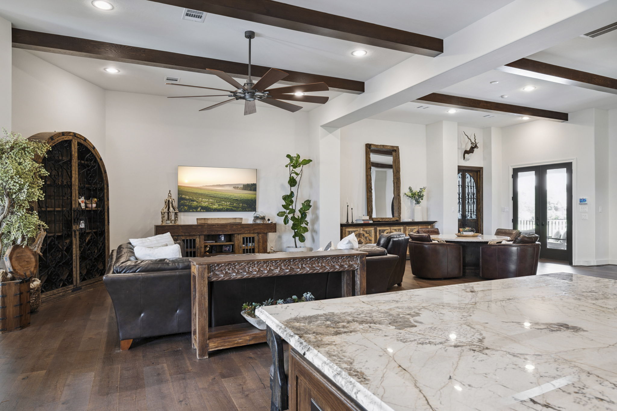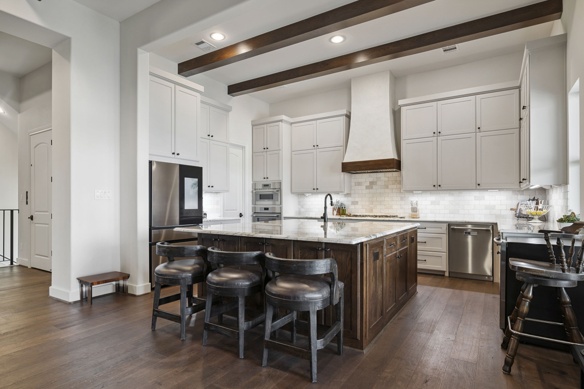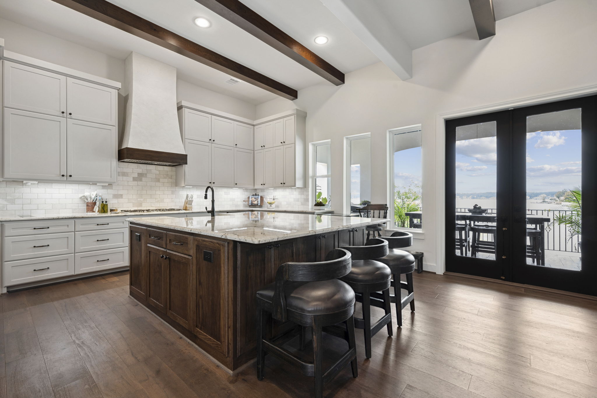 The kitchen features a massive furniture-style island with contrasting dark wood cabinetry, marble countertops, and bar seating.