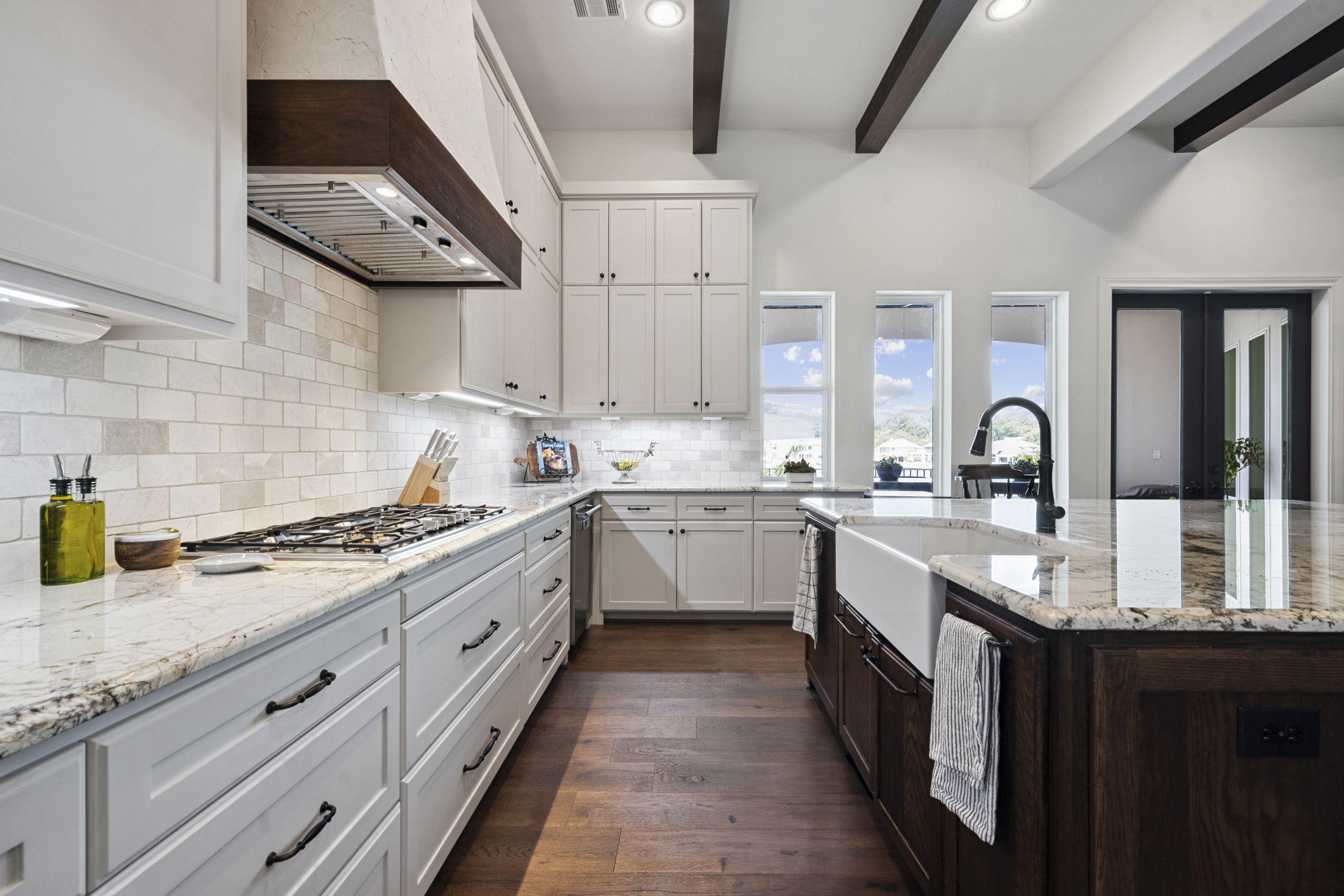 The island includes a large apron-front farmhouse sink paired with matte black hardware and fixtures for a refined modern farmhouse look.