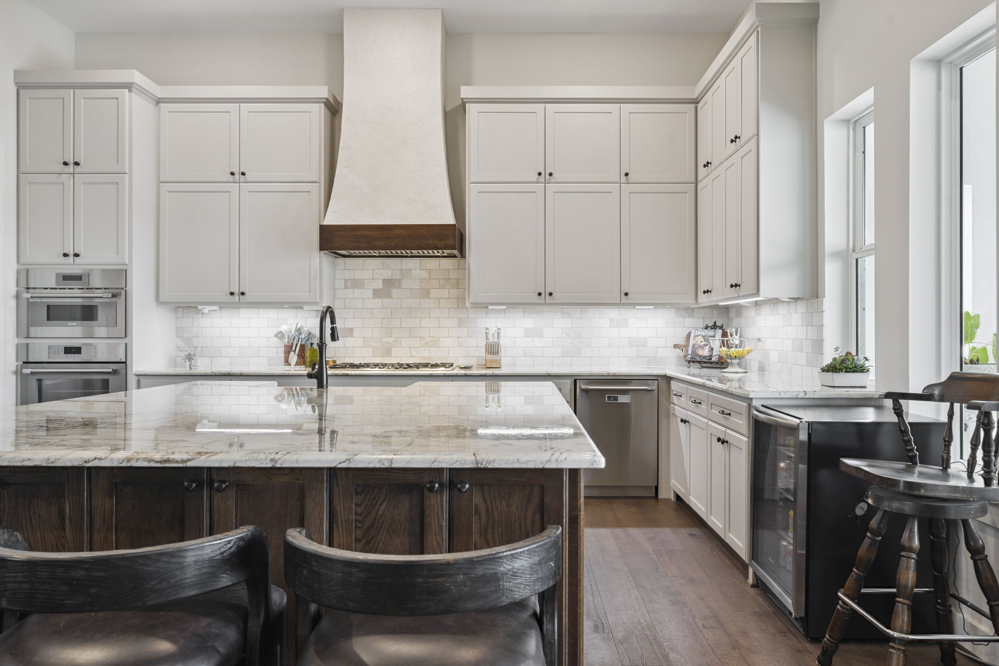 A plaster and wood range hood creates a stunning focal point, flanked by stacked upper cabinets and a handmade-look subway tile backsplash.