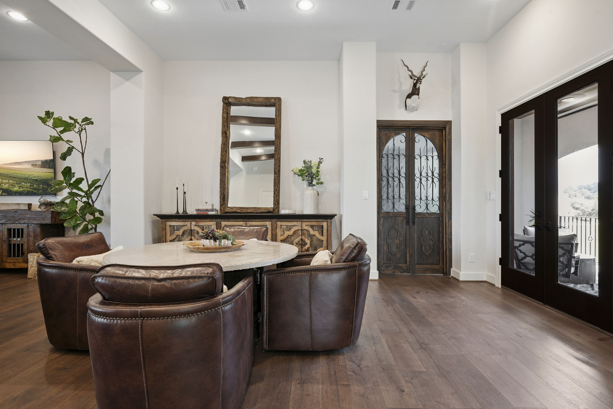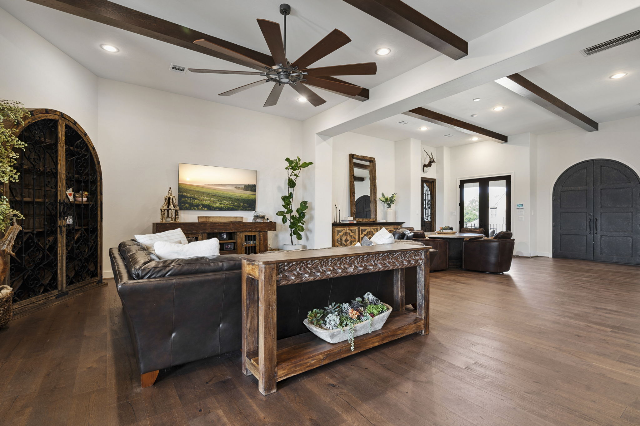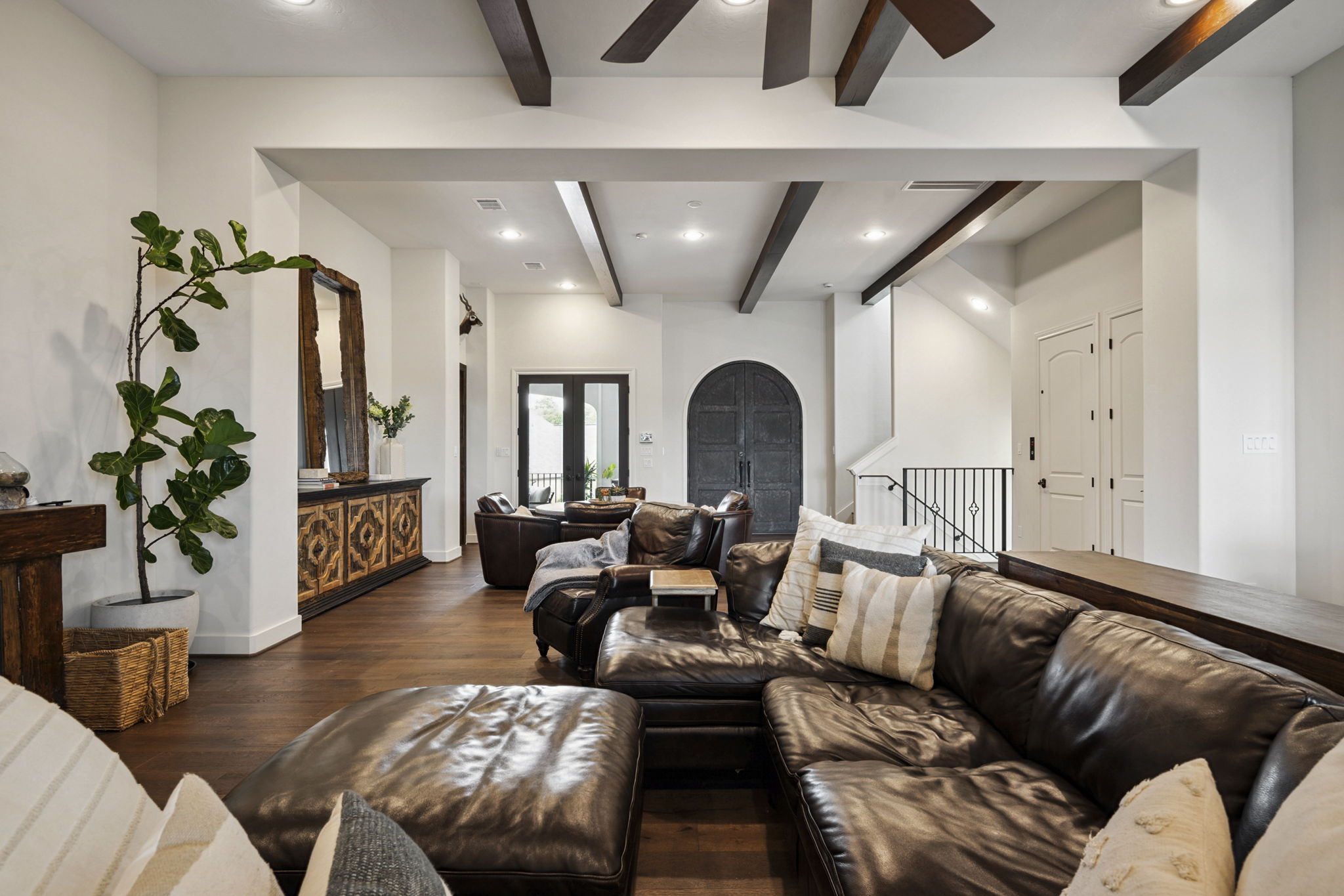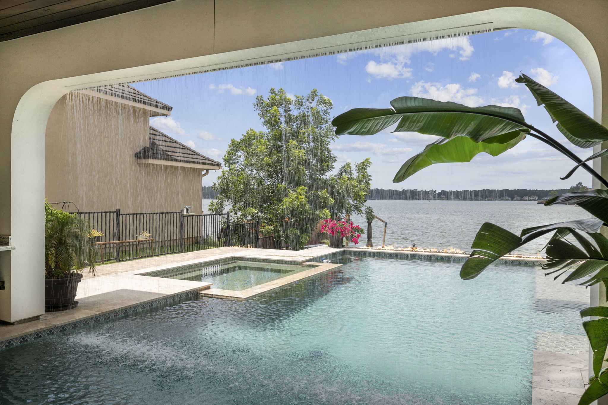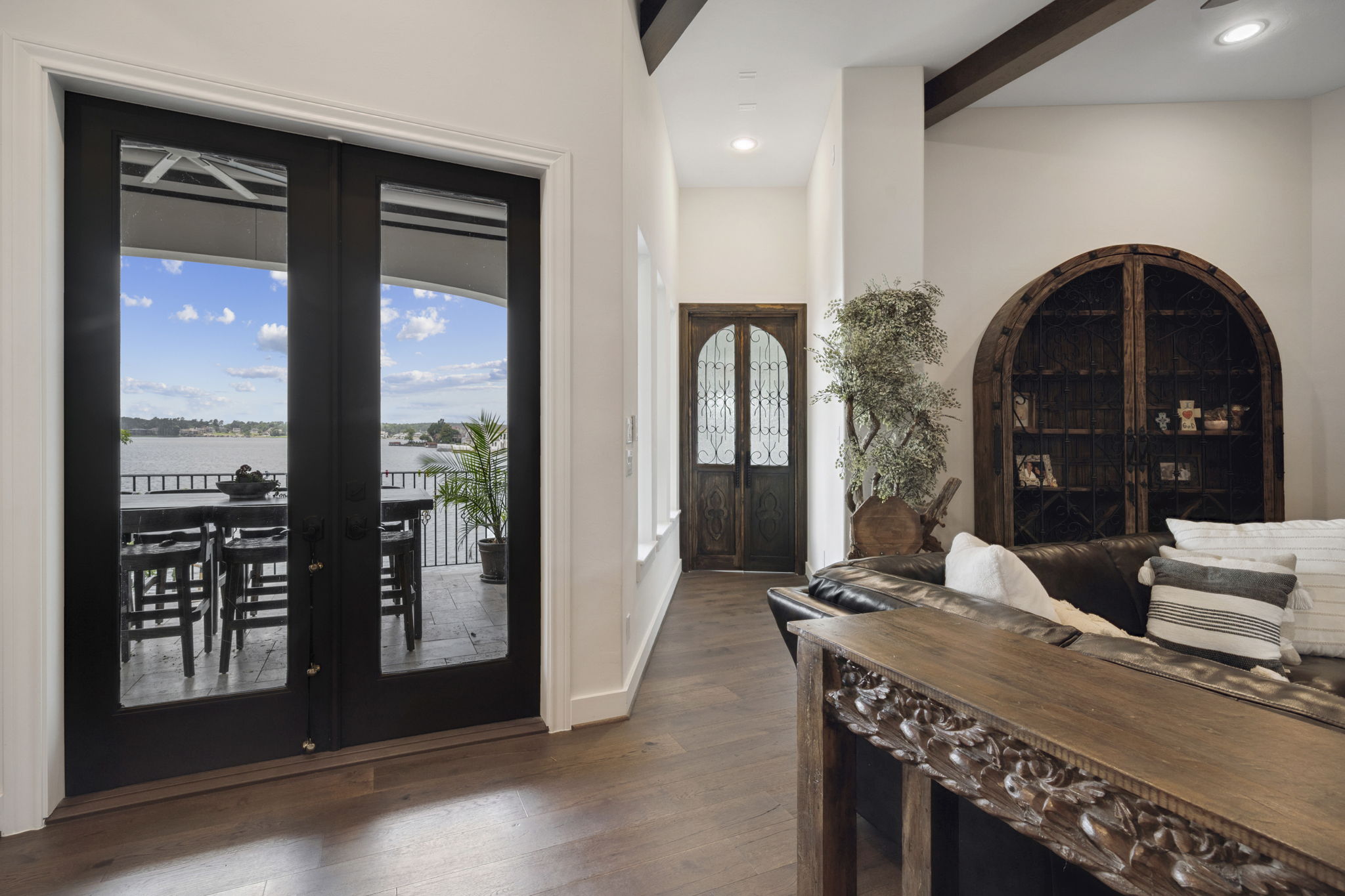 We built this Mediterranean-style home in Bentwater on Lake Conroe with elegant details and a focus on outdoor living. A stone-wrapped split staircase leads to custom iron doors and a grand arched entry. Inside, vaulted ceilings with dark wood beams and a chef’s kitchen with a statement island, custom vent hood, and farmhouse sink create a warm, inviting space. In the back, a two-story covered patio overlooks a geometric pool with a spa, Baja shelf, and travertine decking, perfect for relaxing or entertaining.