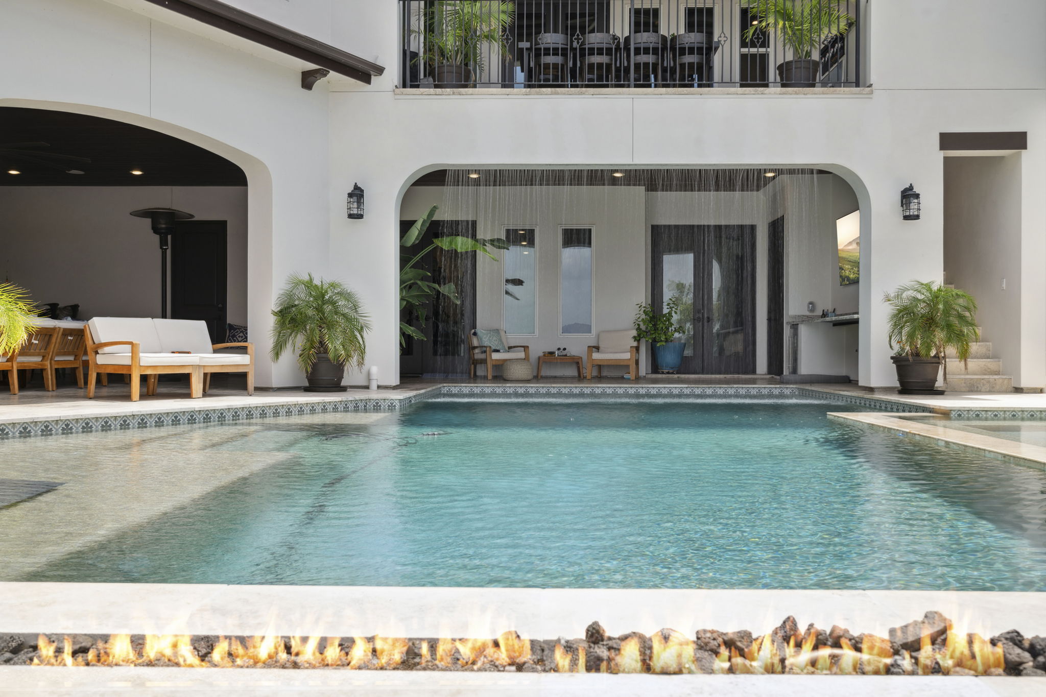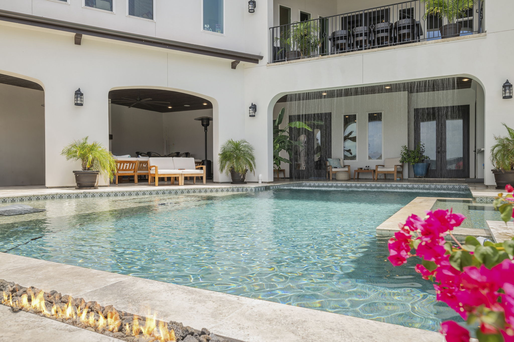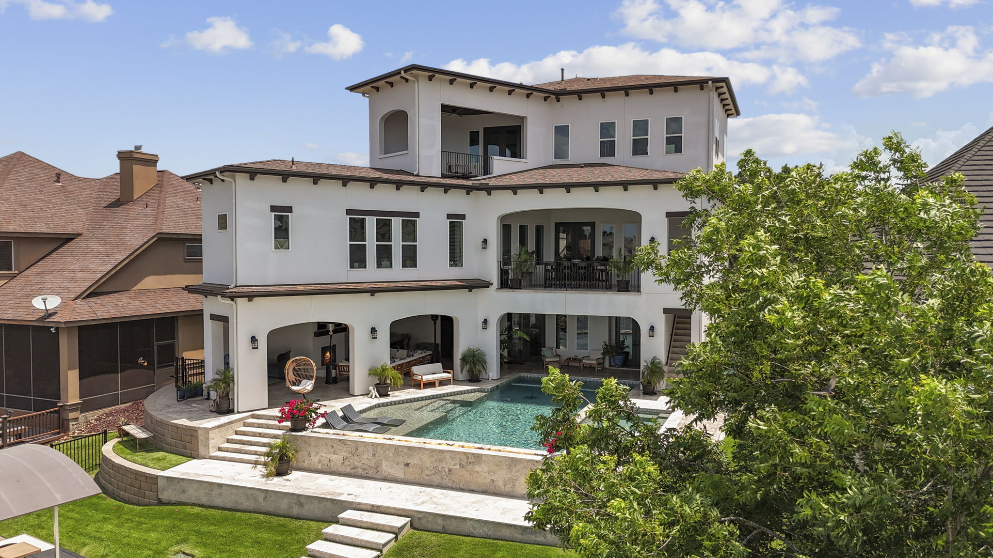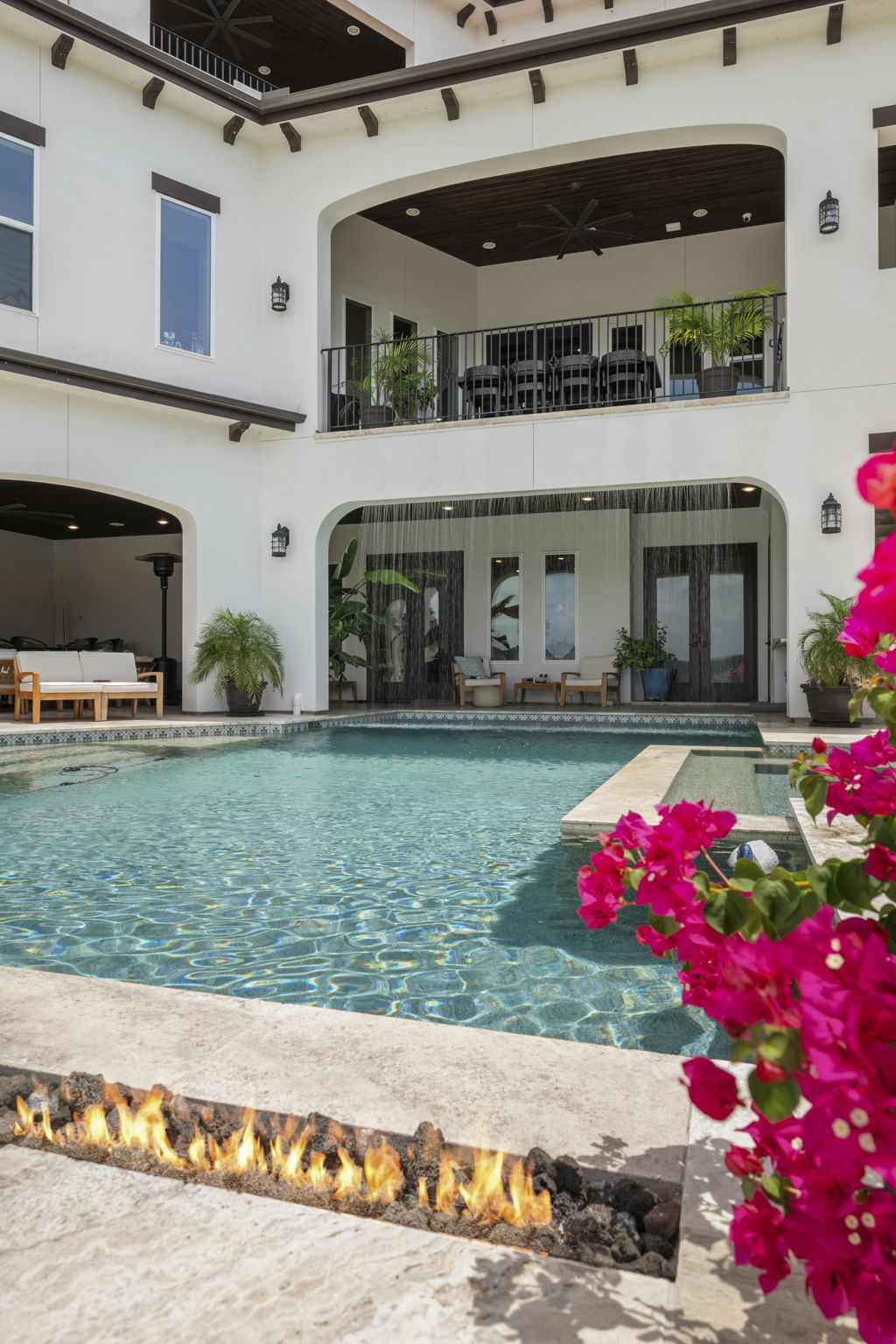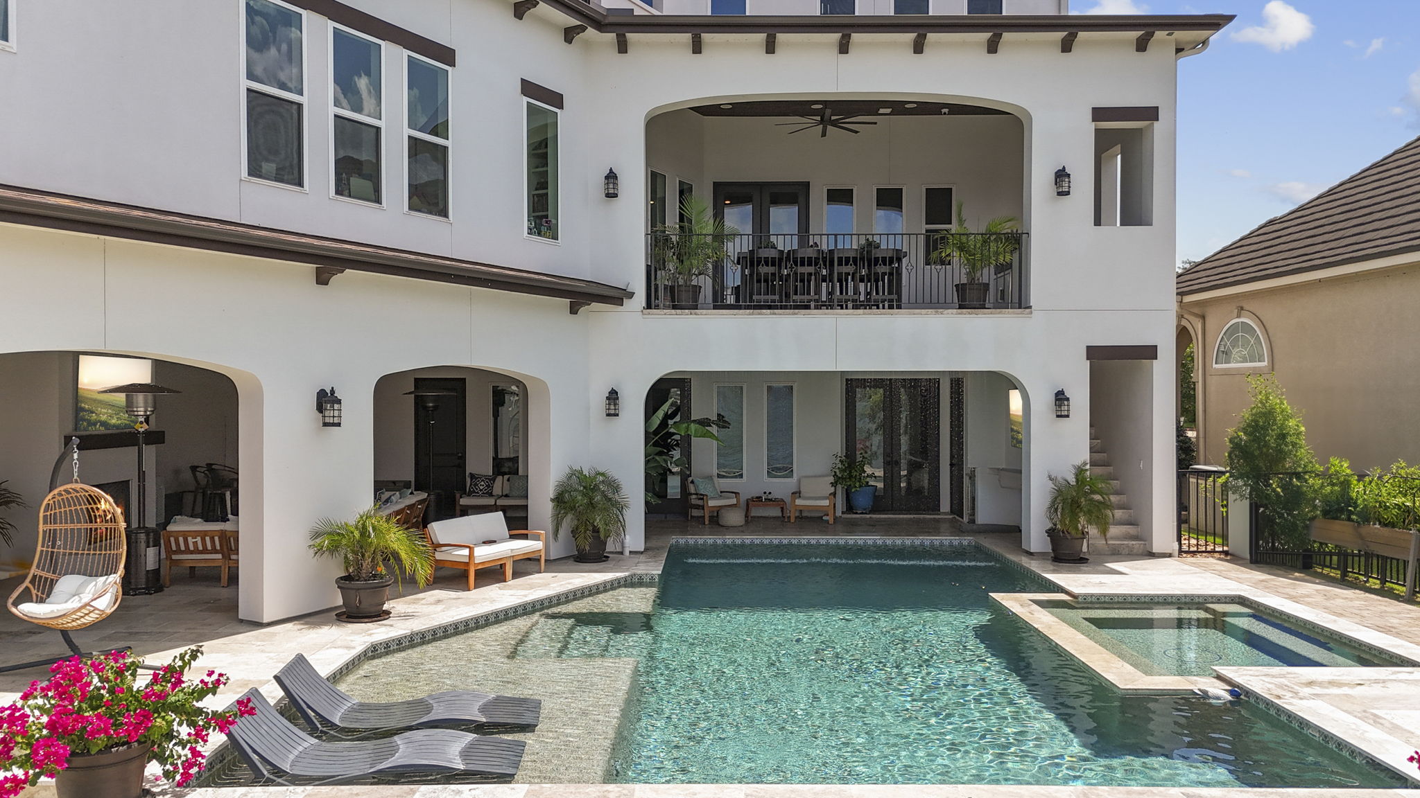 The rear of the home includes a two-level covered patio—upstairs for dining and lounging, and downstairs opening directly to the pool, blending indoor-outdoor living.