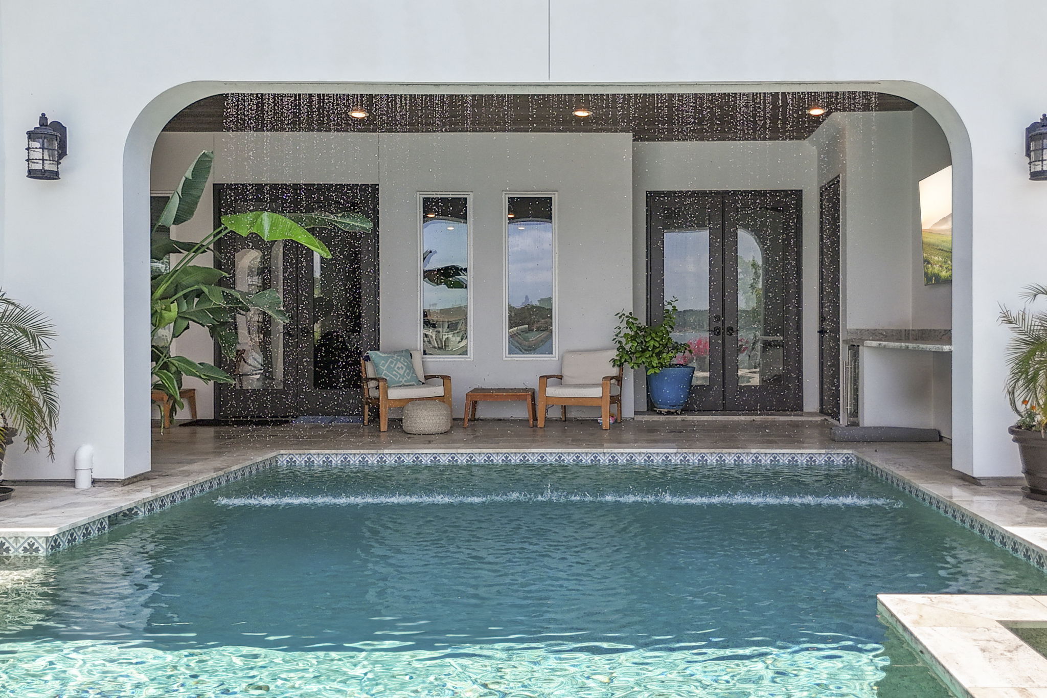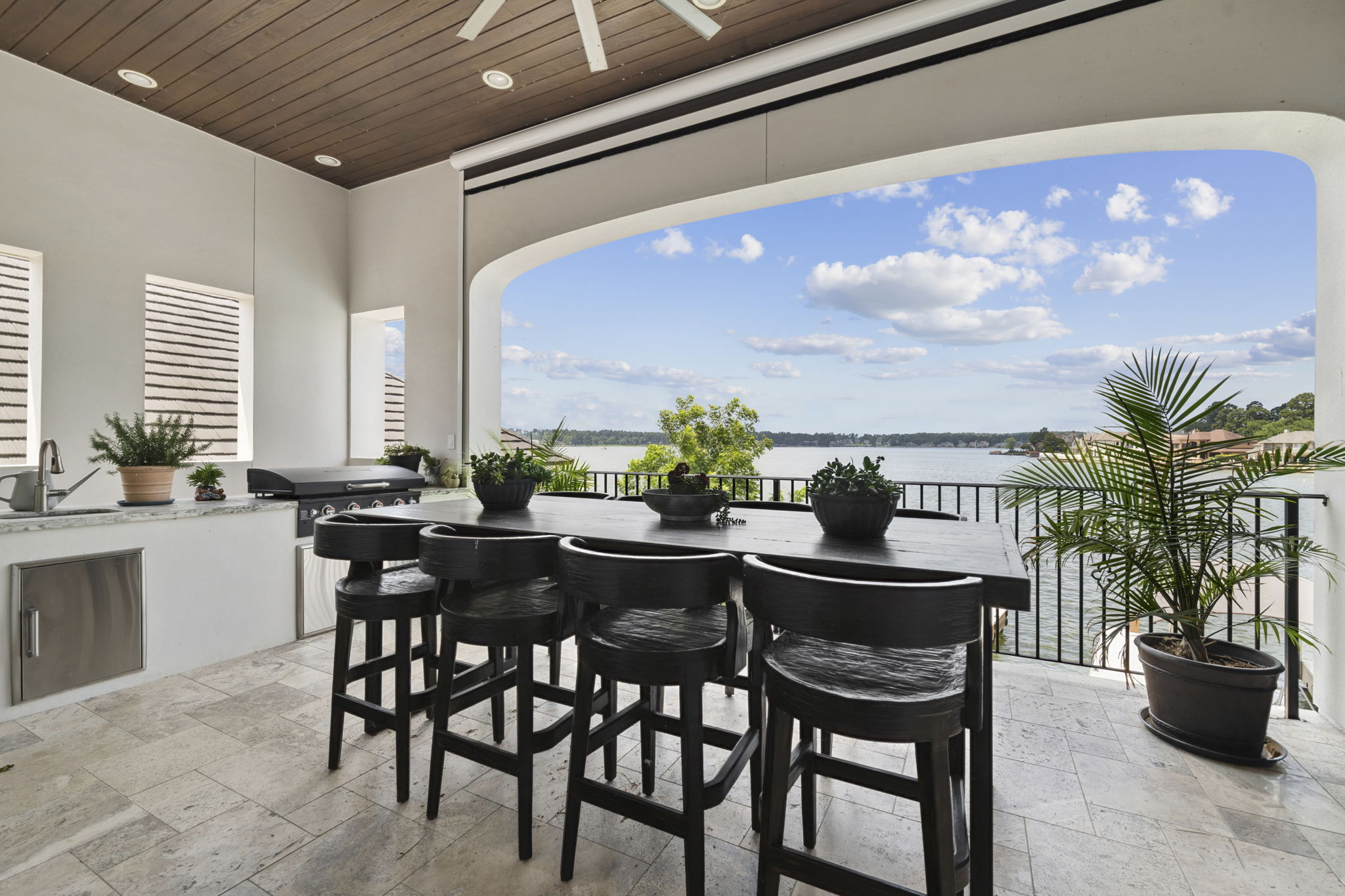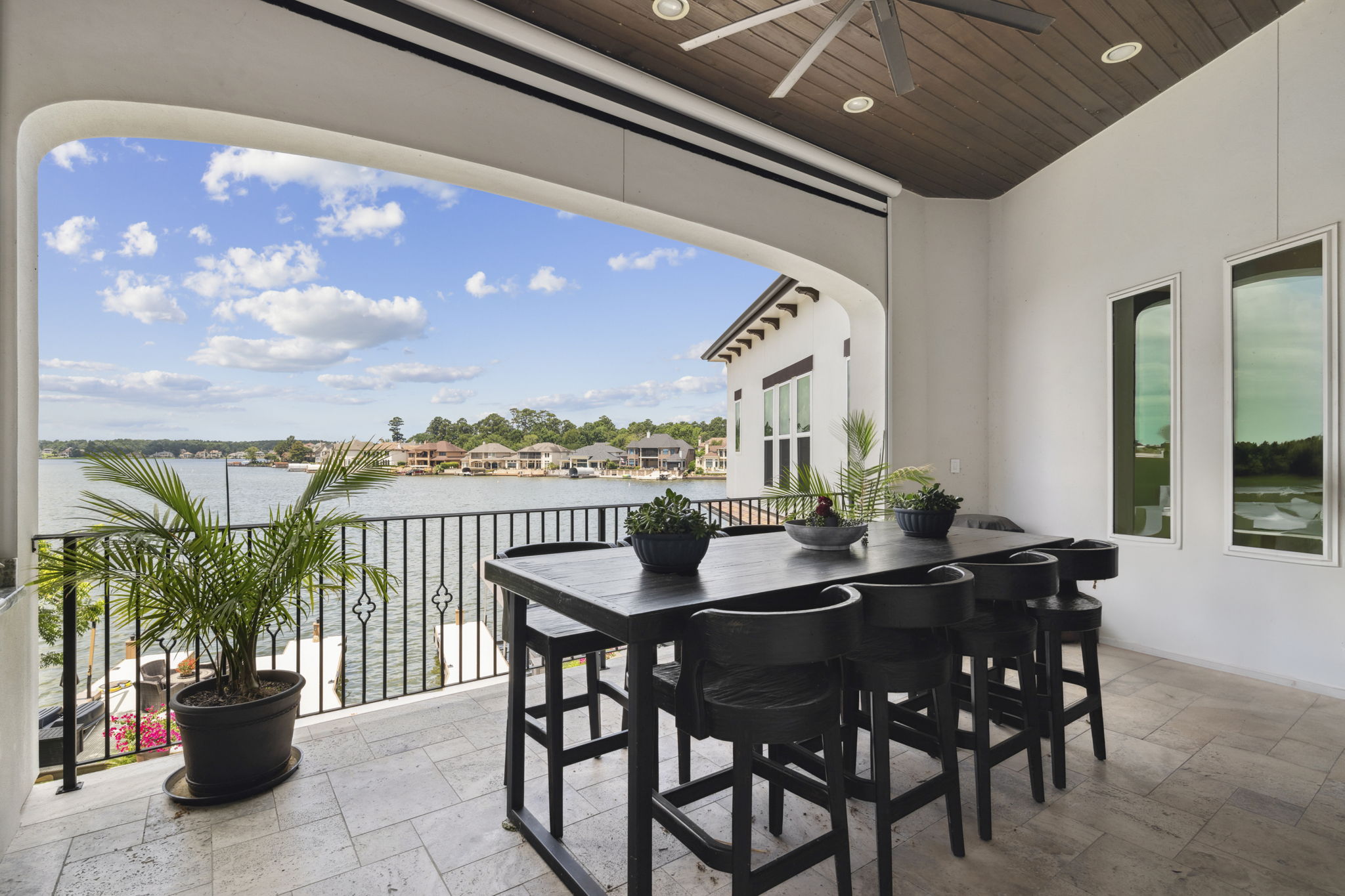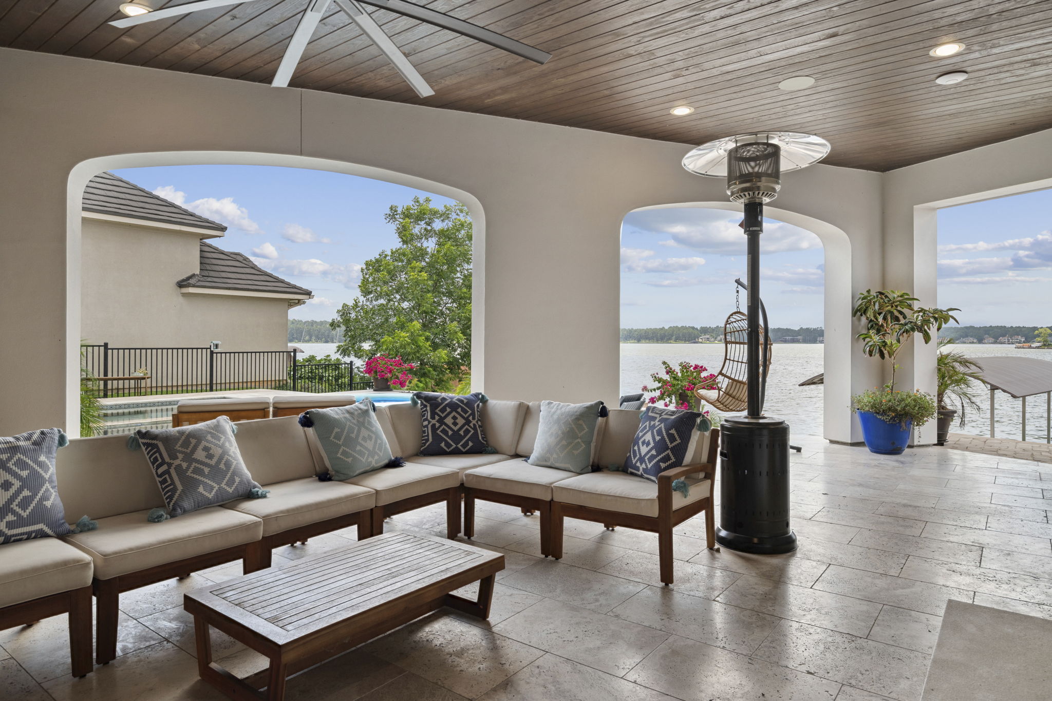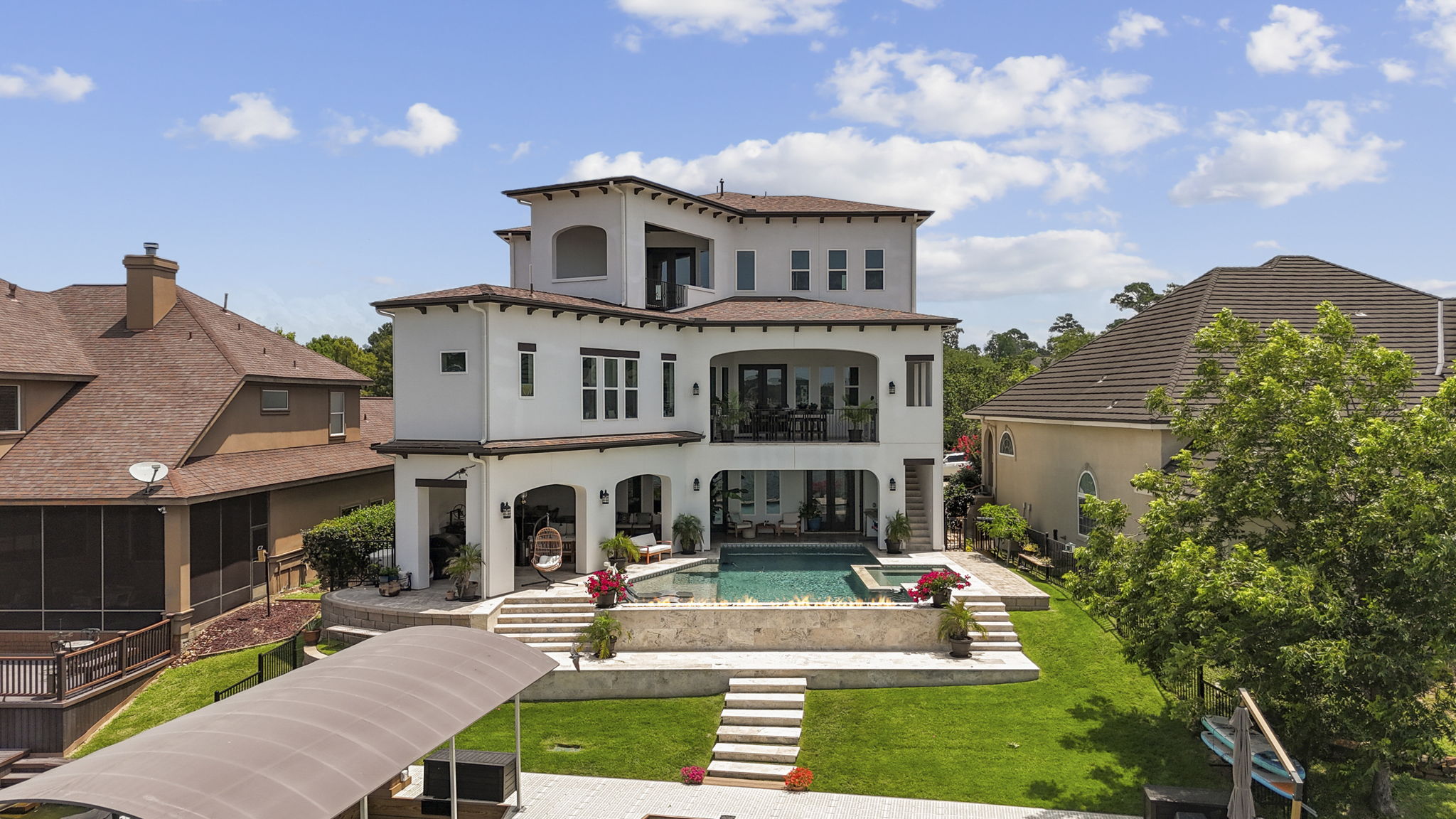 The rear of the home includes a two-level covered patio—upstairs for dining and lounging, and downstairs opening directly to the pool, blending indoor-outdoor living.