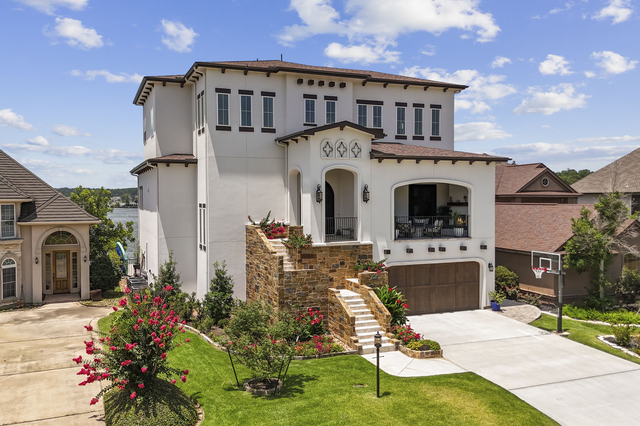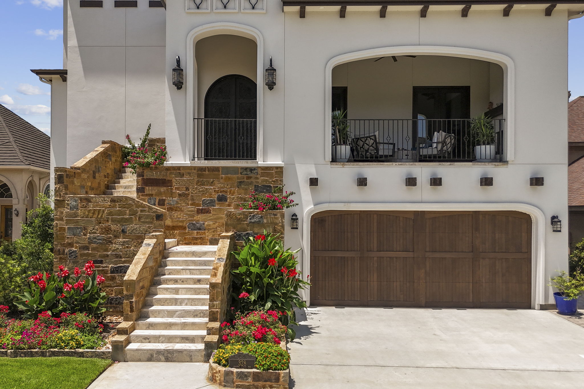 The front elevation features a dramatic dual staircase wrapped in natural stone, leading to a covered balcony and custom iron doors.
