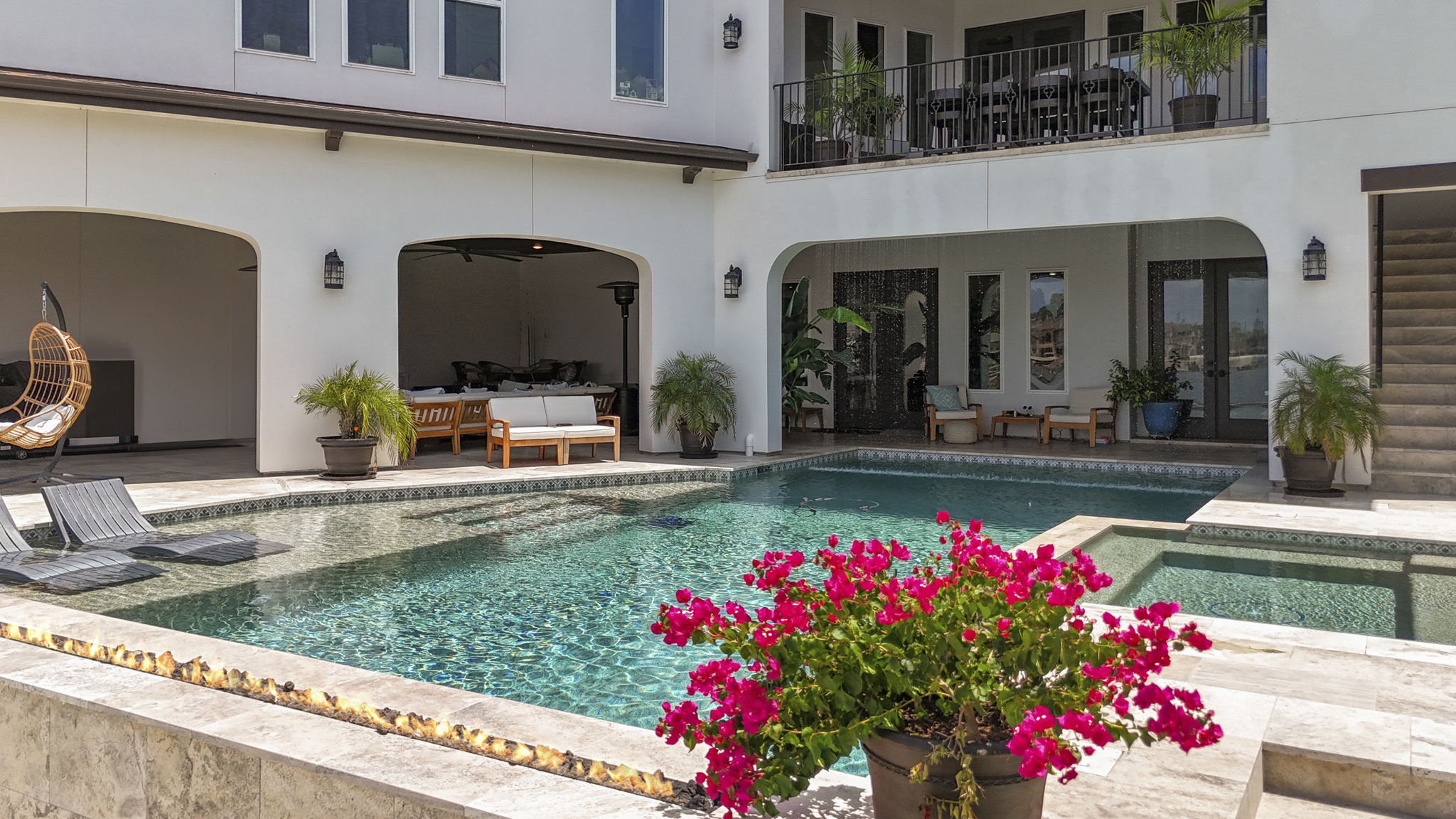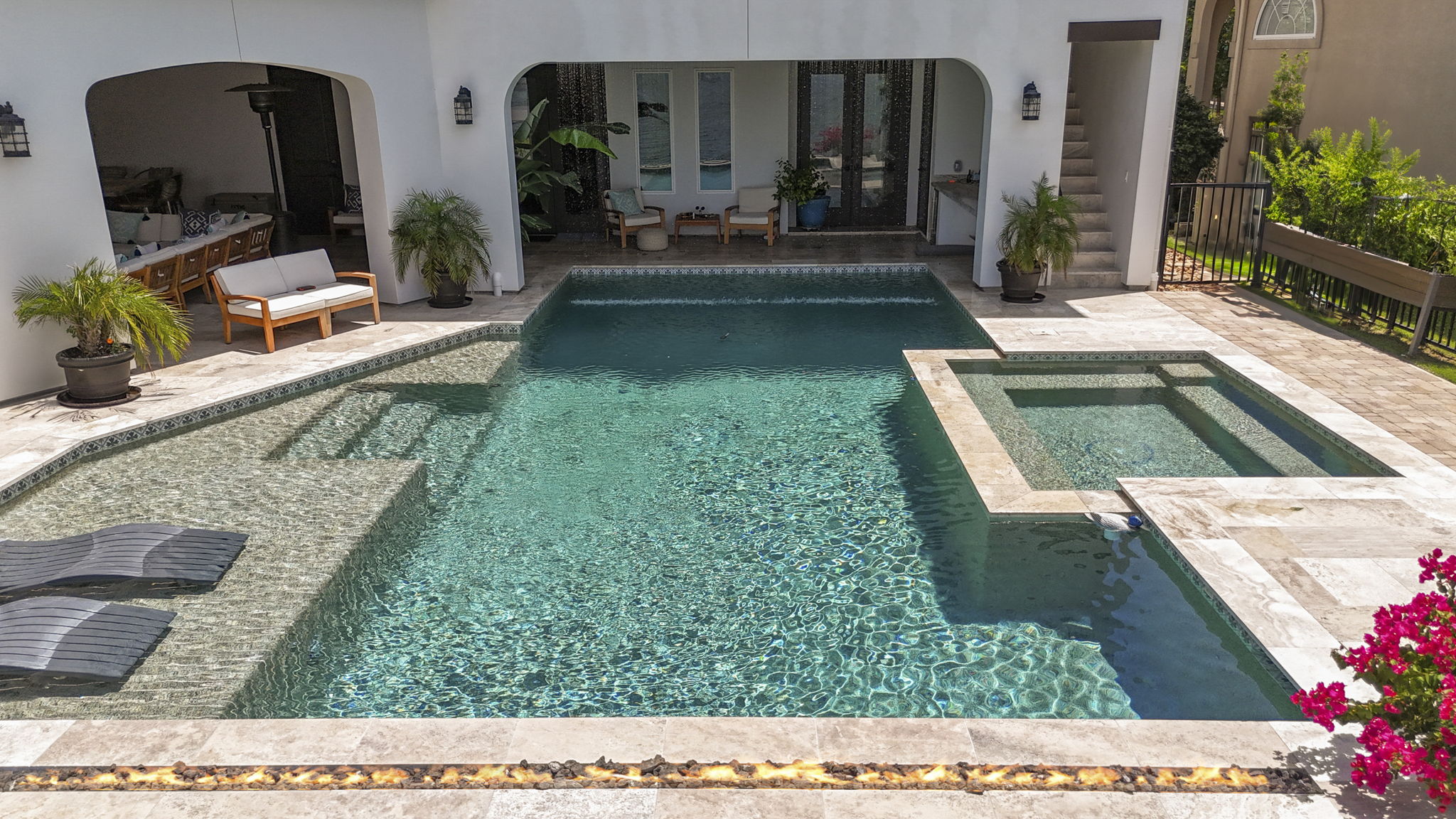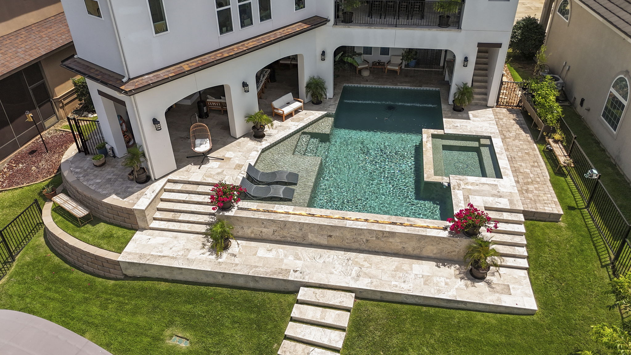 Custom pool design includes an integrated spa, baja shelf with in-pool loungers, and travertine decking for a resort-like feel.