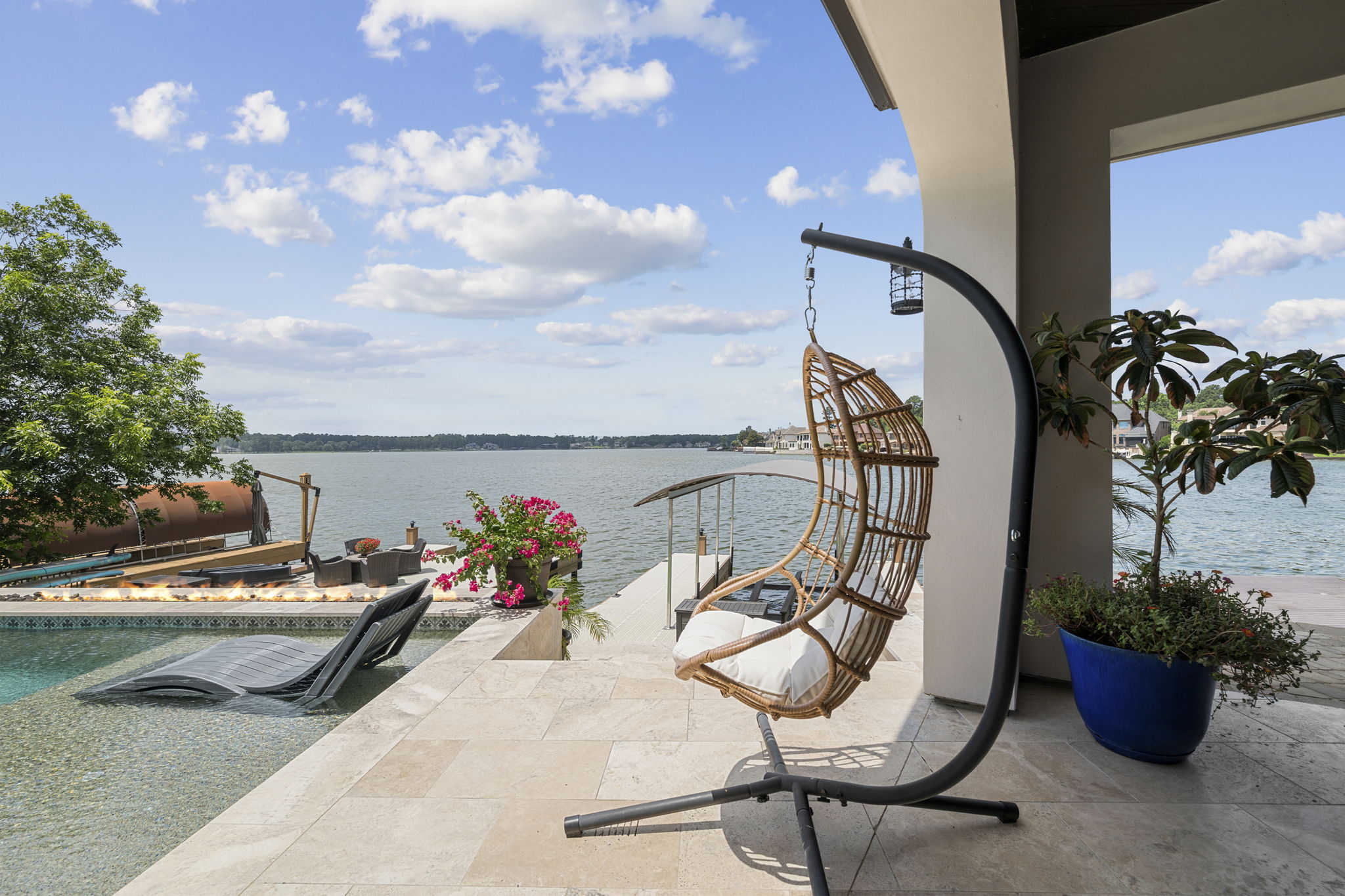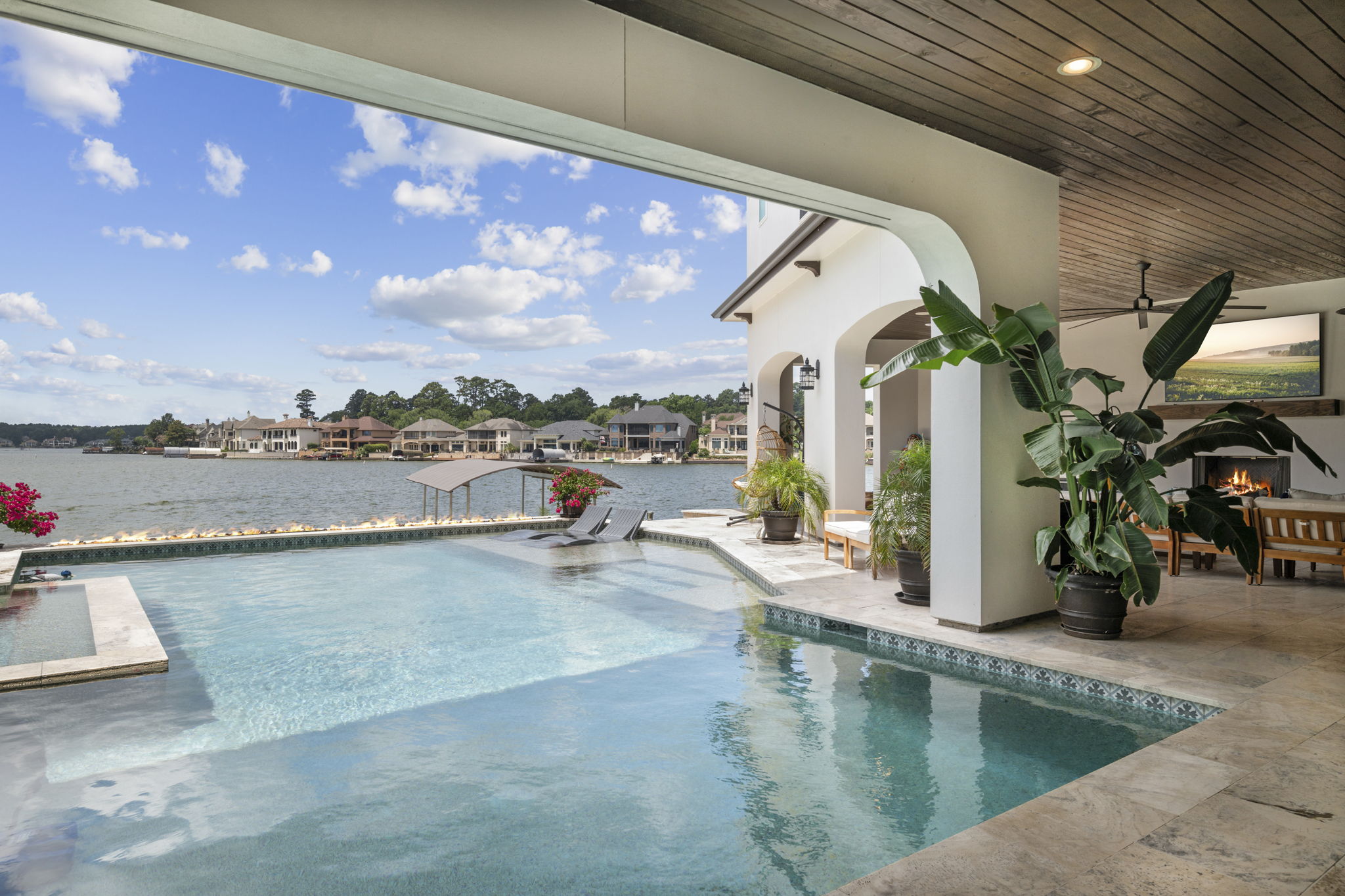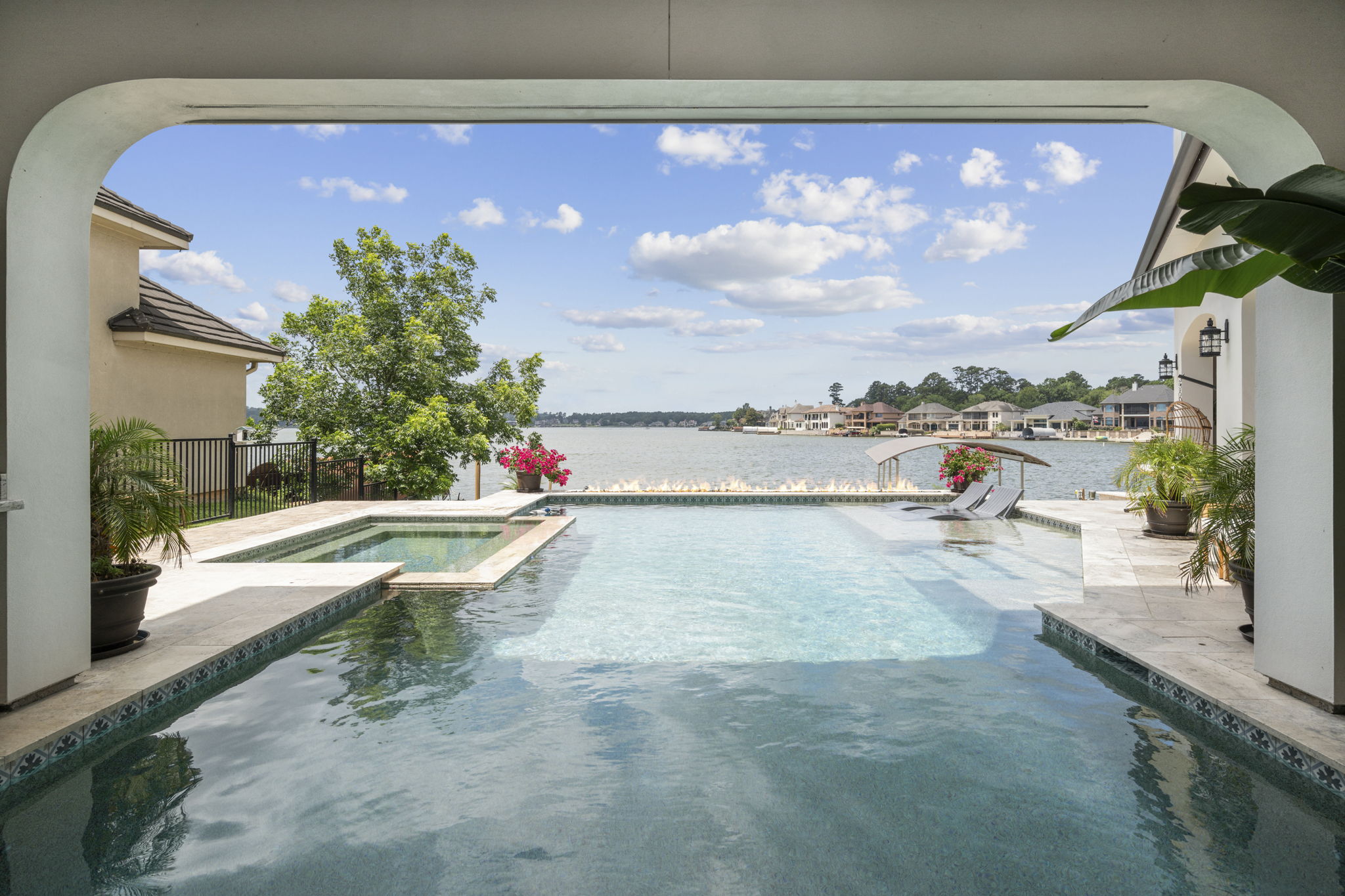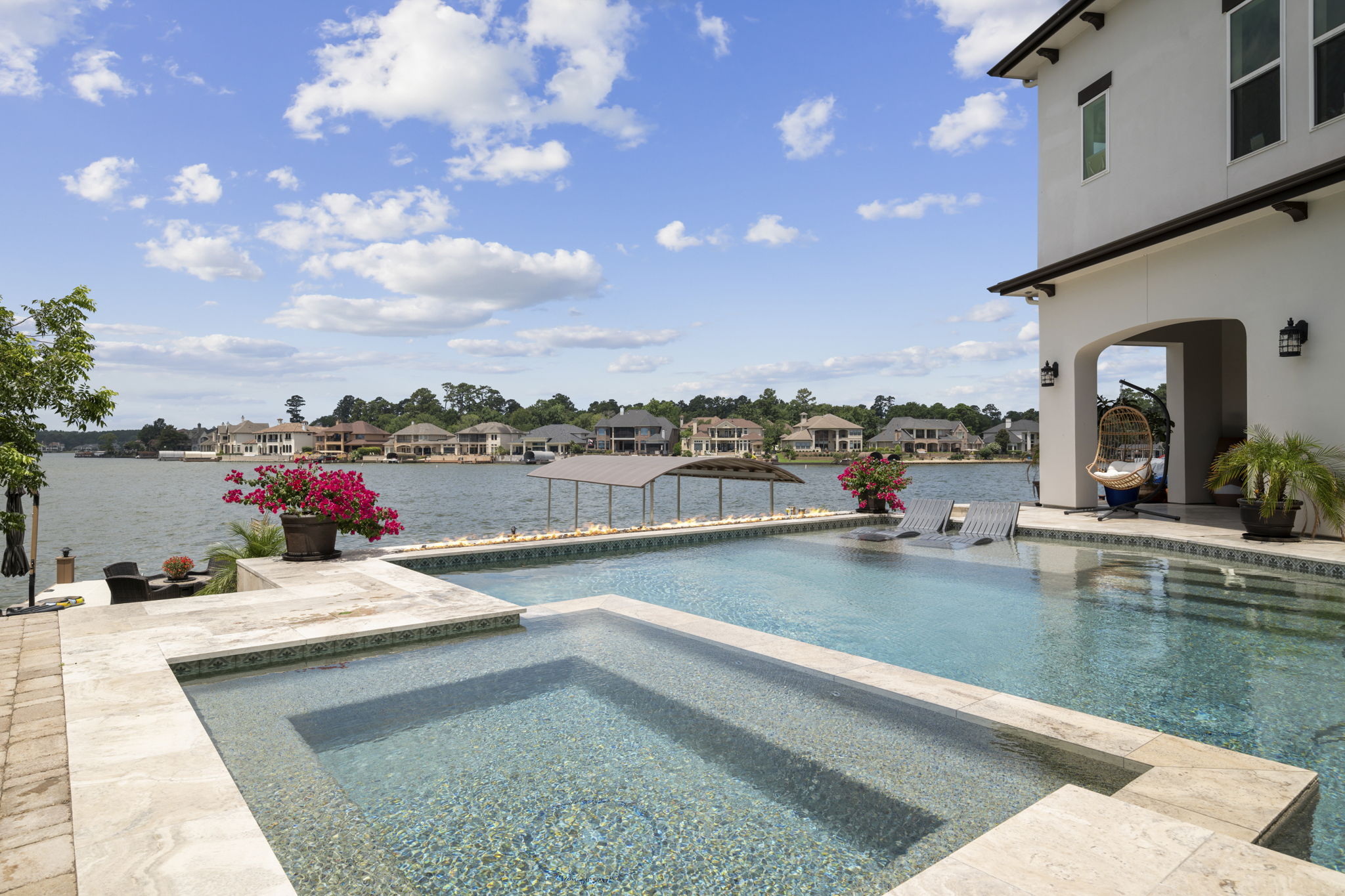 Custom pool design includes an integrated spa, baja shelf with in-pool loungers, and travertine decking for a resort-like feel.