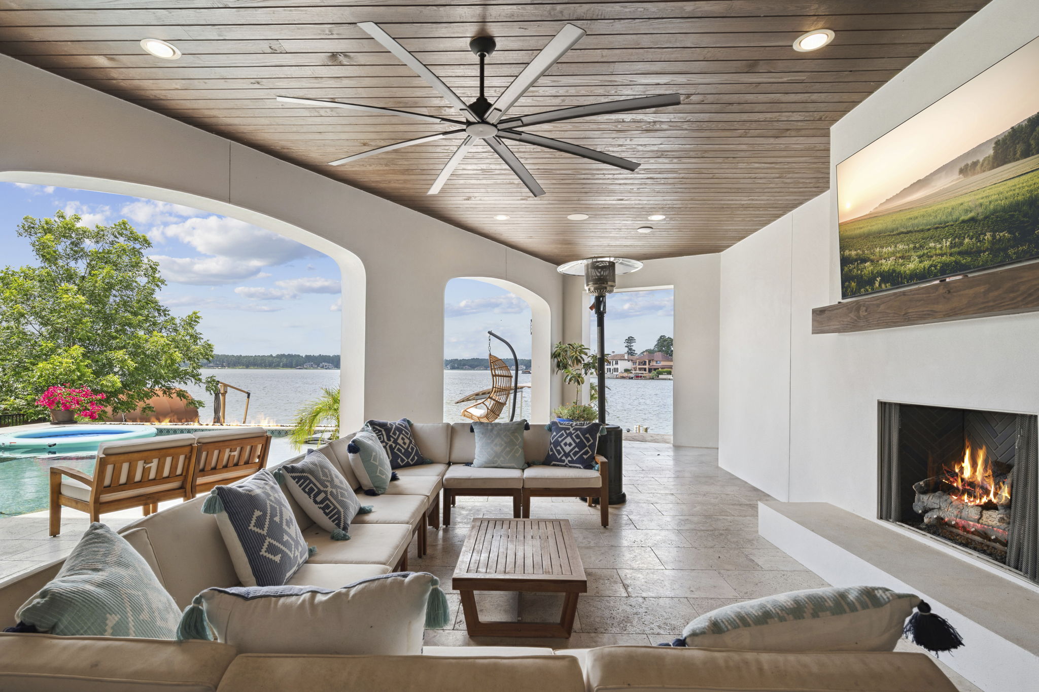 Covered patio includes a wall-mounted TV, outdoor kitchen shelf, ceiling fan, and hanging chair—ideal for entertaining.