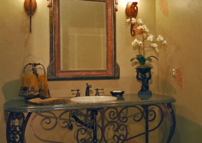 Plaster walls, ornate vanity, and iron accents