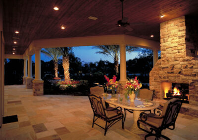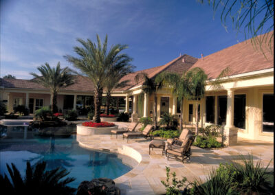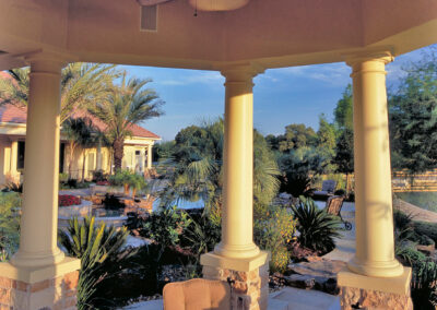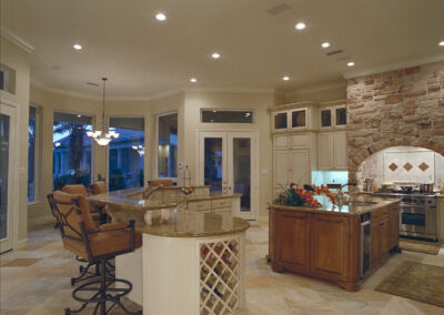 We brought a Mediterranean feel to this home in Tomball with arched windows, a clay tile roof, and smooth stucco. The backyard includes a resort-style pool, a relaxing spa, and a covered patio with a stone fireplace. Inside, the kitchen has a large island and a natural stone backsplash. The primary bath and dining room both include custom luxury details that make the space feel elegant and personal.