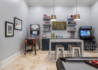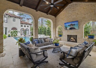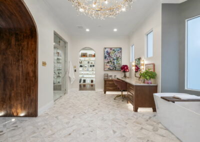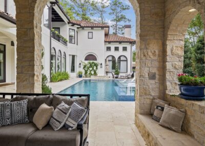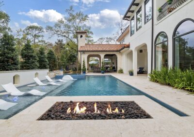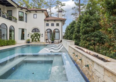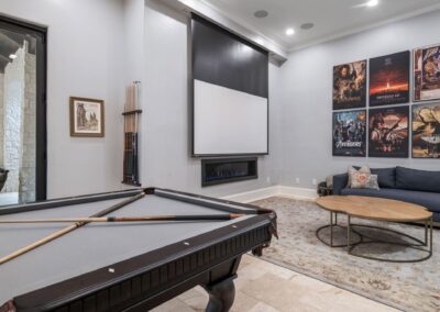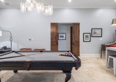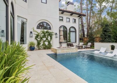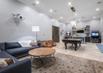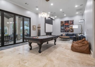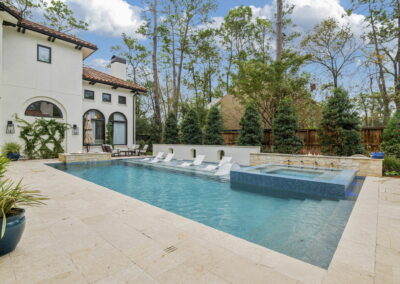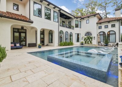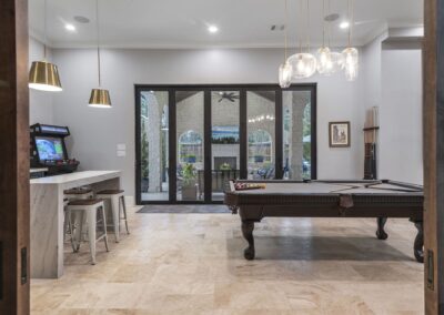 For this Hunters Creek project, we worked on several updates and additions. The master suite got sliding alder wood doors, a spa-style shower with heated floors, and separate vanities. We also added a large game room with marble floors and a custom bar. Outside, the backyard includes a new pool with water cannons, a swim jet system, and bright LED lights that make it feel like a high-end resort.