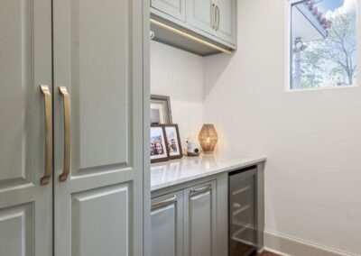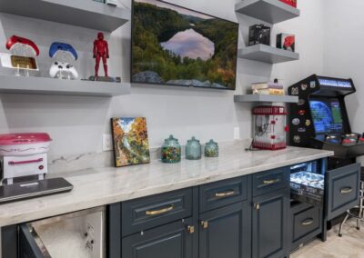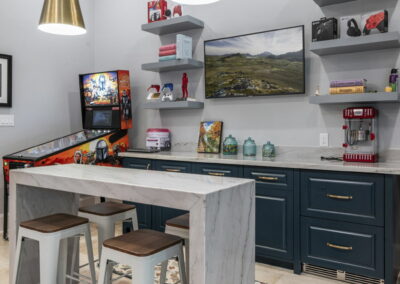 - Beverage Bar: Built-in bar with custom cabinets and a mini fridge underneath
